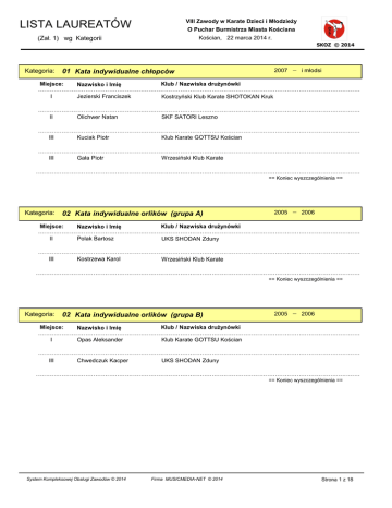 VIII Zawody w Karate Dzieci i Młodzieży LISTA LAUREATÓW O Puchar Burmistrza Miasta Kościana Kościan, 22 marca 2014 r. (Zał. 1) wg Kategorii SKOZ © 2014 Mata: Kategoria: 2007 01 Kata indywidualne chłopców Miejsce: Nazwisko i Imię Klub / Nazwiska drużynówki I Jezierski Franciszek Kostrzyński Klub Karate SHOTOKAN Kruk II Olichwer Natan SKF SATORI Leszno III Kuciak Piotr Klub Karate GOTTSU Kościan III Gała Piotr Wrzesiński Klub Karate i młodsi == Koniec wyszczególnienia == Mata: Kategoria: 02 Kata indywidualne orlików (grupa A) Miejsce: Nazwisko i Imię Klub / Nazwiska drużynówki II Polak Bartosz UKS SHODAN Zduny III Kostrzewa Karol Wrzesiński Klub Karate 2005 2006 == Koniec wyszczególnienia == Mata: Kategoria: 02 Kata indywidualne orlików (grupa B) Miejsce: Nazwisko i Imię Klub / Nazwiska drużynówki I Opas Aleksander Klub Karate GOTTSU Kościan III Chwedczuk Kacper UKS SHODAN Zduny 2005 2006 == Koniec wyszczególnienia == System Kompleksowej Obsługi Zawodów © 2014 Firma MUSICMEDIA-NET © 2014 Strona 1 z 18 Mata: Kategoria: 03 Kata indywidualne żaków Miejsce: Nazwisko i Imię Klub / Nazwiska drużynówki I Kostrzewa Rafał Andrzej PSKiSW MUSASHI ŻNIN II Pietrzak Antoni PSKiSW MUSASHI ŻNIN III Bandulik Klaudiusz Wrzesiński Klub Karate III Formanowski Jakub UKS SHODAN Zduny 2003 2004 == Koniec wyszczególnienia == Mata: Kategoria: 04 Kata indywidualne młodzików (grupa A) - rank WZK 2001 2002 pkt. WZK Miejsce: Nazwisko i Imię Klub / Nazwiska drużynówki II Owczarzak Filip GK KARATE-DO YOSHITAKA DOJO 5 III Walkowiak Tomasz Klub Karate GOTTSU Kościan 3 == Koniec wyszczególnienia == Mata: Kategoria: 04 Kata indywidualne młodzików (grupa B) - rank WZK 2001 2002 Nazwisko i Imię Klub / Nazwiska drużynówki pkt. WZK I Frąckowiak Adrian Klub Karate GOTTSU Kościan 8 III Owczarzak Mikołaj GK KARATE-DO YOSHITAKA DOJO 3 Miejsce: == Koniec wyszczególnienia == System Kompleksowej Obsługi Zawodów © 2014 Firma MUSICMEDIA-NET © 2014 Strona 2 z 18 Mata: Kategoria: 05 Kata indywidualne juniorów młodszych - rank WZK 1999 2000 pkt. WZK Miejsce: Nazwisko i Imię Klub / Nazwiska drużynówki I Luciński Damian WKSA BUDOKAN Wrocław 8 II Gałązka Konrad Poznańskie Stowarzyszenie Karate Shotokan 5 III Zieliński Samuel ASW NIPPON Krotoszyn 3 III Awuku Franciszek Poznańskie Stowarzyszenie Karate Shotokan 3 == Koniec wyszczególnienia == Mata: Kategoria: 1997 06 Kata indywidualne juniorów Miejsce: Nazwisko i Imię Klub / Nazwiska drużynówki I Walczak Jakub LKS Polonia-Torakan Biała II Pasiewicz Krzysztof Poznańskie Stowarzyszenie Karate Shotokan III Lechel Kamil ASW NIPPON Krotoszyn III Antkowiak Mikołaj SKF SATORI Leszno 1998 == Koniec wyszczególnienia == Mata: Kategoria: 07 Kumite indywidualne orlików Miejsce: (- 25 kg) Nazwisko i Imię Klub / Nazwiska drużynówki I Wesołowski Paweł WKSA BUDOKAN Wrocław II Chwedczuk Kacper UKS SHODAN Zduny III Opas Aleksander Klub Karate GOTTSU Kościan III Potocki Adam Klub Karate GOTTSU Kościan 2005 2006 == Koniec wyszczególnienia == System Kompleksowej Obsługi Zawodów © 2014 Firma MUSICMEDIA-NET © 2014 Strona 3 z 18 Mata: Kategoria: 08 Kumite indywidualne orlików (- 31 kg) Miejsce: Nazwisko i Imię Klub / Nazwiska drużynówki I Jopek Krzysztof KUZI SPORT II Pestka Stanisław Koźmiński Klub Karate Do Shotokan III Ratajczak Natan Uczniowski KS UKEMI w Kobylinie III Kujawa Aleksander Kluby Karate EMPI 2005 2006 == Koniec wyszczególnienia == Mata: Kategoria: 08 Kumite indywidualne orlików Miejsce: (+31 kg) Nazwisko i Imię Klub / Nazwiska drużynówki I Sakowicz Sławomir SKF SATORI Leszno II Schimber Oliwer SKF SATORI Leszno III Dudzik Jakub Kostrzyński Klub Karate Do Shotokan III Kowalczykiewicz Konrad Pleszewski Klub Karate 2005 2006 == Koniec wyszczególnienia == Mata: Kategoria: 09 Kumite indywidualne żaków (- 35 kg) Miejsce: Nazwisko i Imię Klub / Nazwiska drużynówki I Florczak Michał Pleszewski Klub Karate II Plewa Wiktor Wągrowiecki KK TIGER III Bandulik Klaudiusz Wrzesiński Klub Karate III Jopek Wojciech KUZI SPORT 2003 2004 == Koniec wyszczególnienia == System Kompleksowej Obsługi Zawodów © 2014 Firma MUSICMEDIA-NET © 2014 Strona 4 z 18 Mata: Kategoria: 10 Kumite indywidualne żaków Miejsce: (- 40 kg) Nazwisko i Imię Klub / Nazwiska drużynówki I Kostrzewa Rafał Andrzej PSKiSW MUSASHI ŻNIN II Krzewiński Hubert SKF SATORI Leszno III Czternasty Szymon SKF SATORI Leszno III Pietrzak Antoni PSKiSW MUSASHI ŻNIN 2003 2004 == Koniec wyszczególnienia == Mata: Kategoria: 10 Kumite indywidualne żaków Miejsce: (+ 40 kg) Nazwisko i Imię Klub / Nazwiska drużynówki I Szymoniak Michał Pleszewski Klub Karate II Elias Jakub Uczniowski KS UKEMI w Kobylinie III Łęcki Jakub Uczniowski KS UKEMI w Kobylinie III Dziamski Michał SKF SATORI Leszno 2003 2004 == Koniec wyszczególnienia == Mata: Kategoria: 11 Kumite indywidualne młodzików (- 37 kg) - rank WZK 2001 2002 Nazwisko i Imię Klub / Nazwiska drużynówki pkt. WZK I Walkowiak Tomasz Klub Karate GOTTSU Kościan 8 II Ritter Jakub Klub Karate Do Shotokan DRAGON Środa Wlkp. 5 III Pestka Wojciech Koźmiński Klub Karate Do Shotokan 3 III Glina Igor Rawicki Klub Karate SUREM 3 Miejsce: == Koniec wyszczególnienia == System Kompleksowej Obsługi Zawodów © 2014 Firma MUSICMEDIA-NET © 2014 Strona 5 z 18 Mata: Kategoria: 12 Kumite indywidualne młodzików Miejsce: (- 47 kg) - rank WZK 2001 2002 pkt. WZK Nazwisko i Imię Klub / Nazwiska drużynówki I Vogt Kacper Pleszewski Klub Karate 8 II Nader Mateusz Wągrowiecki KK TIGER 5 III Świątek Michał SKF SATORI Leszno 3 III Szalewski Krzysztof SKF SATORI Leszno 3 == Koniec wyszczególnienia == Mata: Kategoria: 12 Kumite indywidualne młodzików Miejsce: (+ 47 kg) - rank WZK 2001 2002 pkt. WZK Nazwisko i Imię Klub / Nazwiska drużynówki I Konowalczyk Jakub Pleszewski Klub Karate 8 II Frąckowiak Adrian Klub Karate GOTTSU Kościan 5 III Sadowski Maksymilian Pleszewski Klub Karate 3 III Sob