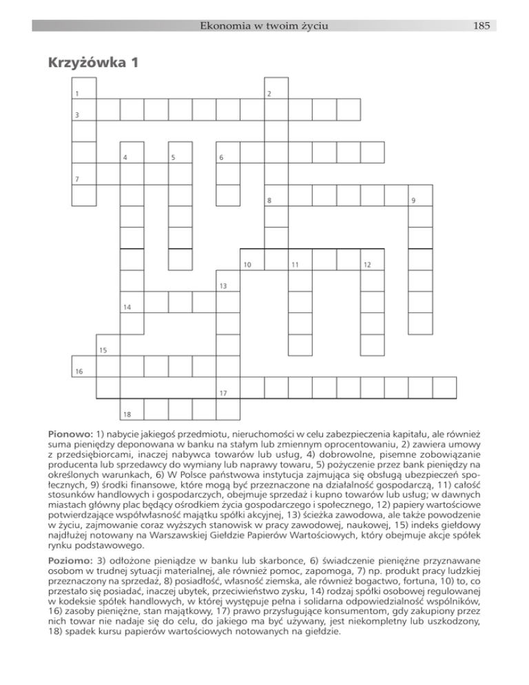 Ekonomia w twoim życiu 185 Krzyżówka 1 1 2 3 4 5 6 7 8 10 9 11 12 13 14 15 16 17 18 Pionowo: 1) nabycie jakiegoś przedmiotu, nieruchomości w celu zabezpieczenia kapitału, ale również suma pieniędzy deponowana w banku na stałym lub zmiennym oprocentowaniu, 2) zawiera umowy z przedsiębiorcami, inaczej nabywca towarów lub usług, 4) dobrowolne, pisemne zobowiązanie producenta lub sprzedawcy do wymiany lub naprawy towaru, 5) pożyczenie przez bank pieniędzy na określonych warunkach, 6) W Polsce państwowa instytucja zajmująca się obsługą ubezpieczeń społecznych, 9) środki finansowe, które mogą być przeznaczone na działalność gospodarczą, 11) całość stosunków handlowych i gospodarczych, obejmuje sprzedaż i kupno towarów lub usług; w dawnych miastach główny plac będący ośrodkiem życia gospodarczego i społecznego, 12) papiery wartościowe potwierdzające współwłasność majątku spółki akcyjnej, 13) ścieżka zawodowa, ale także powodzenie w życiu, zajmowanie coraz wyższych stanowisk w pracy zawodowej, naukowej, 15) indeks giełdowy najdłużej notowany na Warszawskiej Giełdzie Papierów Wartościowych, który obejmuje akcje spółek rynku podstawowego. Poziomo: 3) odłożone pieniądze w banku lub skarbonce, 6) świadczenie pieniężne przyznawane osobom w trudnej sytuacji materialnej, ale również pomoc, zapomoga, 7) np. produkt pracy ludzkiej przeznaczony na sprzedaż, 8) posiadłość, własność ziemska, ale również bogactwo, fortuna, 10) to, co przestało się posiadać, inaczej ubytek, przeciwieństwo zysku, 14) rodzaj spółki osobowej regulowanej w kodeksie spółek handlowych, w której występuje pełna i solidarna odpowiedzialność wspólników, 16) zasoby pieniężne, stan majątkowy, 17) prawo przysługujące konsumentom, gdy zakupiony przez nich towar nie nadaje się do celu, do jakiego ma być używany, jest niekompletny lub uszkodzony, 18) spadek kursu papierów wartościowych notowanych na giełdzie.