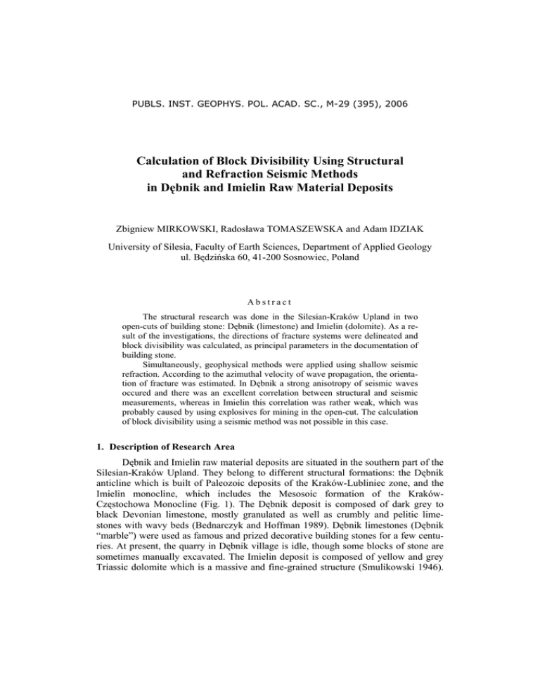 PUBLS. INST. GEOPHYS. POL. ACAD. SC., M-29 (395), 2006 Calculation of Block Divisibility Using Structural and Refraction Seismic Methods in Dębnik and Imielin Raw Material Deposits Zbigniew MIRKOWSKI, Radosława TOMASZEWSKA and Adam IDZIAK University of Silesia, Faculty of Earth Sciences, Department of Applied Geology ul. Będzińska 60, 41-200 Sosnowiec, Poland Abstract The structural research was done in the Silesian-Kraków Upland in two open-cuts of building stone: Dębnik (limestone) and Imielin (dolomite). As a result of the investigations, the directions of fracture systems were delineated and block divisibility was calculated, as principal parameters in the documentation of building stone. Simultaneously, geophysical methods were applied using shallow seismic refraction. According to the azimuthal velocity of wave propagation, the orientation of fracture was estimated. In Dębnik a strong anisotropy of seismic waves occured and there was an excellent correlation between structural and seismic measurements, whereas in Imielin this correlation was rather weak, which was probably caused by using explosives for mining in the open-cut. The calculation of block divisibility using a seismic method was not possible in this case. 1. Description of Research Area Dębnik and Imielin raw material deposits are situated in the southern part of the Silesian-Kraków Upland. They belong to different structural formations: the Dębnik anticline which is built of Paleozoic deposits of the Kraków-Lubliniec zone, and the Imielin monocline, which includes the Mesosoic formation of the KrakówCzęstochowa Monocline (Fig. 1). The Dębnik deposit is composed of dark grey to black Devonian limestone, mostly granulated as well as crumbly and pelitic limestones with wavy beds (Bednarczyk and Hoffman 1989). Dębnik limestones (Dębnik “marble”) were used as famous and prized decorative building stones for a few centuries. At present, the quarry in Dębnik village is idle, though some blocks of stone are sometimes manually excavated. The Imielin deposit is composed of yellow and grey Triassic dolomite which is a massive and fine-grained structure (Smulikowski 1946). The open-cut in Imielin works and it is a significant producer of crushed stone. In the past, blocks of stone were occasionally excavated at this site. 0 5 km Trzebinia Dębnik Chrzan ów Imi eli n Krzeszowice Devonian Carbonifer ous Permian Me sozo ic main faul ts Neogene Fig. 1. The geological map of the Silesian-Kraków region with measurement site locations (after Gradziński 1972). 2. Block Divisibility and Structural Measurements The definition of block divisibility has two meanings – in a geological and a mining sense (PN-88/B-04120). Geological block divisibility is characterized by rock materials in an outcrop or a bore-hole profiles. Mining block divisibility is the output of stone blocks in all materials excavated in an open-cut. Mining block divisibility is a principal parameter for using rocks as a building stone and is applied in geological documentation of the deposits. Block divisibility is calculated according to structural measurements using the formula (Bromowicz and Karwacki 1982): b = Px i Py i Pz i100% where Px, Py, and Pz are the probabilities that x-, y- and z-dimensions are higher than or equal to the limit. The dimension probabilities are shown in the diagram of cumulated frequency. When the three main fracture sets are not perpendicular to each other (blocks are non-orthogonal) the correction coefficient must be used: k = f (d , β ) where d is the form index and β is the angle deviation. The structural measurements were done by using a compass along a perpendicular line on the wells of the open-cut. In the Dębnik deposit two main fracture sets were observed: A – in azimuth range of 130-160o (average 144o) and B – 30-80o (Fig. 2). The fracture of the B-set is composed of two secondary sets of fractures: B1 – 30-40o (average 32o) and B2 – 50-80o (average 63o). This is a typical case for anticlinal forms. Dimensions of the average block from this deposit were 121 cm × 127 cm × 57 cm and the volume of this block was 0.88 m3. In the Dębnik deposit, blocks of stone have a non-orthogonal shape, so in this case a correction coefficient must be used and thus the block volume is 0.6 m3. The marginal volume of the block for this type of limestone established by Polish standard PN-B-11200 is 0.25 m3. The block divisibility in Dębnik is equal to 41%. N 1212 % 0 1010 B 88 66 44 n = 73 22 90 0 A 180 S Fig. 2. Rose-diagram of fractures in the Dębnik deposit. In the Imielin deposit two distinct directions of fracture occurred: 120-160o (average 144o) – system A and 40-80o (average 53o) – system B (Fig. 3). The block from this deposit has average dimensions of 134 cm × 132 cm × 124 cm and its volume is 2.2 m3. The marginal volume of the block for dolomite is 0.3 m3 (PN-B-11200). In the Imielin deposit, block divisibility is equal to 84%. 3. Method and Analysis of Seismic Measurements Seismic measurements were performed using a Terraloc MK6 (ABEM) seismograph. Measurement points were set up inside the quarry in Dębnik and outside the open-cut in Imielin. The oriented profiles were 36 m long in Dębnik and 44 m long in Imielin. The seismic waves were induced using a hammer. Shot-points were located at the initial, central and final points of the measuring profile. After each measurement cycle the profile was rotated by 20o. N 0 1212 % 1010 B 88 66 44 22 n = 133 90 0 A 180 S Fig. 3. Rose-diagram of fractures in the Imielin deposit. As a result of seismic measurements the values of the seismic wave velocity (Vp and Vs) were interpreted for each profile (Table 1). In the Dębnik deposit, wave velocity varied and the maximum of Vp (2626 m/s) was obtained for profile direction of 40o, whereas the maximum of Vs (1726 m/s) was at 60o. The velocities of seismic waves in Imielin are considerably less than in Dębnik, t