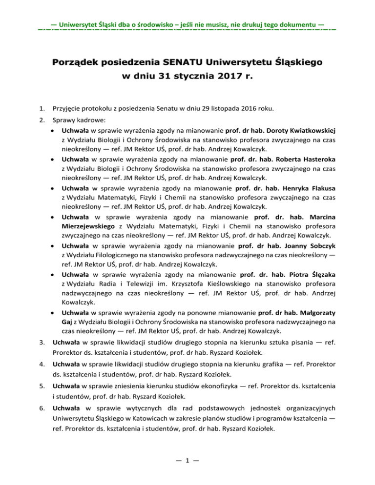 — Uniwersytet Śląski dba o środowisko – jeśli nie musisz, nie drukuj tego dokumentu — Porządek posiedzenia SENATU Uniwersytetu Śląskiego w dniu 31 stycznia 2017 r. 1. Przyjęcie protokołu z posiedzenia Senatu w dniu 29 listopada 2016 roku. 2. Sprawy kadrowe: · · · · · · · Uchwała w sprawie wyrażenia zgody na mianowanie prof. dr hab. Doroty Kwiatkowskiej z Wydziału Biologii i Ochrony Środowiska na stanowisko profesora zwyczajnego na czas nieokreślony — ref. JM Rektor UŚ, prof. dr hab. Andrzej Kowalczyk. Uchwała w sprawie wyrażenia zgody na mianowanie prof. dr. hab. Roberta Hasteroka z Wydziału Biologii i Ochrony Środowiska na stanowisko profesora zwyczajnego na czas nieokreślony — ref. JM Rektor UŚ, prof. dr hab. Andrzej Kowalczyk. Uchwała w sprawie wyrażenia zgody na mianowanie prof. dr. hab. Henryka Flakusa z Wydziału Matematyki, Fizyki i Chemii na stanowisko profesora zwyczajnego na czas nieokreślony — ref. JM Rektor UŚ, prof. dr hab. Andrzej Kowalczyk. Uchwała w sprawie wyrażenia zgody na mianowanie prof. dr. hab. Marcina Mierzejewskiego z Wydziału Matematyki, Fizyki i Chemii na stanowisko profesora zwyczajnego na czas nieokreślony — ref. JM Rektor UŚ, prof. dr hab. Andrzej Kowalczyk. Uchwała w sprawie wyrażenia zgody na mianowanie prof. dr hab. Joanny Sobczyk z Wydziału Filologicznego na stanowisko profesora nadzwyczajnego na czas nieokreślony — ref. JM Rektor UŚ, prof. dr hab. Andrzej Kowalczyk. Uchwała w sprawie wyrażenia zgody na mianowanie prof. dr. hab. Piotra Ślęzaka z Wydziału Radia i Telewizji im. Krzysztofa Kieślowskiego na stanowisko profesora nadzwyczajnego na czas nieokreślony — ref. JM Rektor UŚ, prof. dr hab. Andrzej Kowalczyk. Uchwała w sprawie wyrażenia zgody na ponowne mianowanie prof. dr hab. Małgorzaty Gaj z Wydziału Biologii i Ochrony Środowiska na stanowisko profesora nadzwyczajnego na czas nieokreślony — ref. JM Rektor UŚ, prof. dr hab. Andrzej Kowalczyk. 3. Uchwała w sprawie likwidacji studiów drugiego stopnia na kierunku sztuka pisania — ref. Prorektor ds. kształcenia i studentów, prof. dr hab. Ryszard Koziołek. 4. Uchwała w sprawie likwidacji studiów drugiego stopnia na kierunku grafika — ref. Prorektor ds. kształcenia i studentów, prof. dr hab. Ryszard Koziołek. 5. Uchwała w sprawie zniesienia kierunku studiów ekonofizyka — ref. Prorektor ds. kształcenia i studentów, prof. dr hab. Ryszard Koziołek. 6. Uchwała w sprawie wytycznych dla rad podstawowych jednostek organizacyjnych Uniwersytetu Śląskiego w Katowicach w zakresie planów studiów i programów kształcenia — ref. Prorektor ds. kształcenia i studentów, prof. dr hab. Ryszard Koziołek. — 1 — — Uniwersytet Śląski dba o środowisko – jeśli nie musisz, nie drukuj tego dokumentu — 7. Uchwała w sprawie zatwierdzenia zmiany planu rzeczowo-finansowego Uczelni na rok 2016 — ref. Prorektor ds. finansów i rozwoju, dr hab. prof. UŚ Michał Daszykowski. 8. Uchwała w sprawie prowizorium przychodów i kosztów Uczelni na rok 2017 — ref. Prorektor ds. finansów i rozwoju, dr hab. prof. UŚ Michał Daszykowski. 9. Uchwała w sprawie rozporządzenia nieruchomością należącą do Uniwersytetu, której wartość przekracza kwotę 100 tys. EURO (sto tysięcy EURO) (dotyczy wynajmu budynku stołówki w Sosnowcu) — ref. Prorektor ds. finansów i rozwoju, dr hab. prof. UŚ Michał Daszykowski. 10. Uchwała zmieniająca uchwałę w sprawie powołania składu Senackiej Komisji do spraw Kształcenia na kadencję 2016-2020 — ref. JM Rektor UŚ, prof. dr hab. Andrzej Kowalczyk. 11. Uchwała zmieniająca uchwałę w sprawie powołania składu Senackiej Komisji do spraw Współpracy z Zagranicą na kadencję 2016-2020 — ref. JM Rektor UŚ, prof. dr hab. Andrzej Kowalczyk. 12. Uchwała zmieniająca uchwałę w sprawie wyboru składu Uczelnianej Komisji Dyscyplinarnej do spraw Nauczycieli Akademickich na kadencję 2016-2020 — ref. JM Rektor UŚ, prof. dr hab. Andrzej Kowalczyk. 13. Sprawy bieżące. 14. Wolne wnioski. — 2 —
