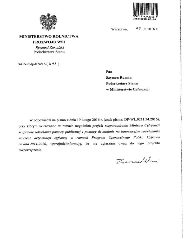 RPW/13232/2016 P Data:2016-03-09 Warszawa, ° ? .03.2016 r. MINISTERSTWO R O L N I C T W A I R O Z W O J U WSI Ryszard Zarudzki Podsekretarz Stanu SAR-str-lp-074/16(^ ) Pan Szymon Ruman Podsekretarz Stanu w Ministerstwie Cyfryzacji W odpowiedzi na pismo z dnia 19 lutego 2016 r. (znak pisma: DP-WL.0211.34.2016), przy ktorym skierowano w ramach uzgodnieh projekt rozporzqdzenia Ministra Cyfryzacji w sprawie udzielania pomocy publicznej i pomocy de minimis na innowacyjne rozwiqzania narzecz aktywizacji cyfrowej w ramach Program Operacyjnego Polska Cyfrowa na lata 2014-2020, uprzejmie informuj?, ze nie zgiaszam rozporzqdzenia. uwag do tego projektu