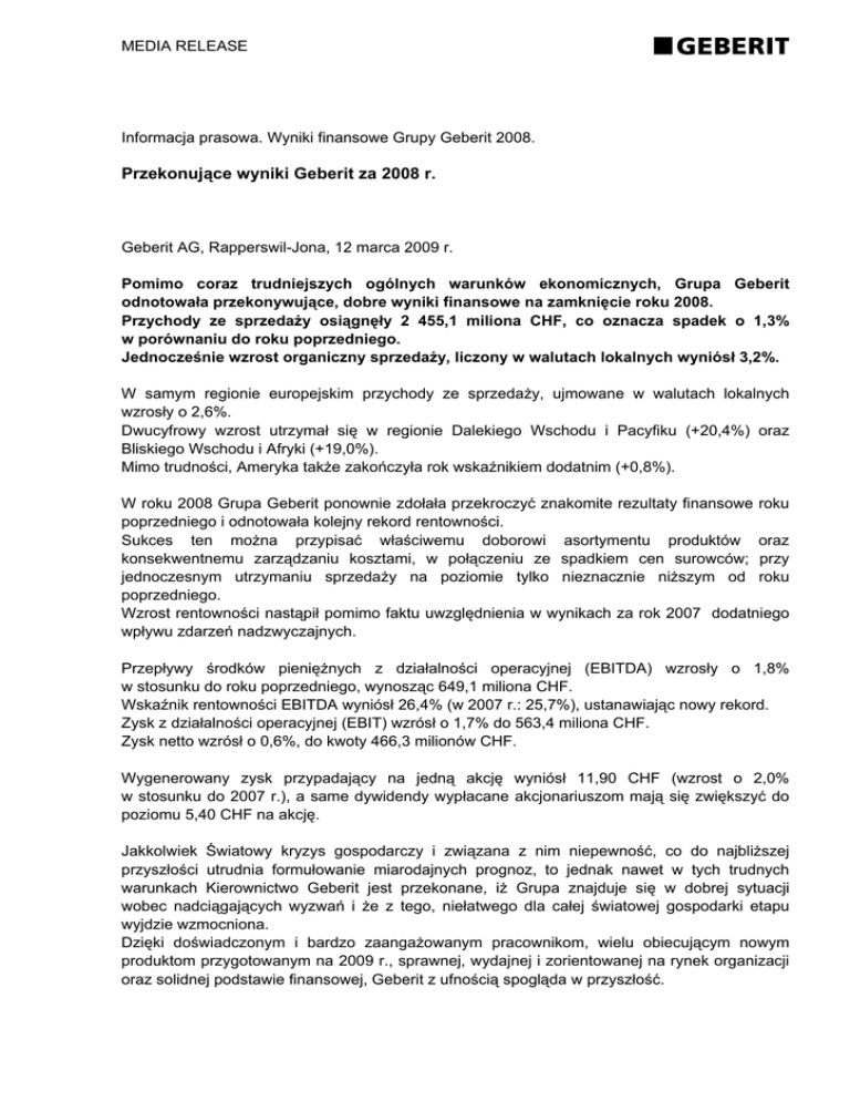 MEDIA RELEASE Informacja prasowa. Wyniki finansowe Grupy Geberit 2008. Przekonujące wyniki Geberit za 2008 r. Geberit AG, Rapperswil-Jona, 12 marca 2009 r. Pomimo coraz trudniejszych ogólnych warunków ekonomicznych, Grupa Geberit odnotowała przekonywujące, dobre wyniki finansowe na zamknięcie roku 2008. Przychody ze sprzedaży osiągnęły 2 455,1 miliona CHF, co oznacza spadek o 1,3% w porównaniu do roku poprzedniego. Jednocześnie wzrost organiczny sprzedaży, liczony w walutach lokalnych wyniósł 3,2%. W samym regionie europejskim przychody ze sprzedaży, ujmowane w walutach lokalnych wzrosły o 2,6%. Dwucyfrowy wzrost utrzymał się w regionie Dalekiego Wschodu i Pacyfiku (+20,4%) oraz Bliskiego Wschodu i Afryki (+19,0%). Mimo trudności, Ameryka także zakończyła rok wskaźnikiem dodatnim (+0,8%). W roku 2008 Grupa Geberit ponownie zdołała przekroczyć znakomite rezultaty finansowe roku poprzedniego i odnotowała kolejny rekord rentowności. Sukces ten można przypisać właściwemu doborowi asortymentu produktów oraz konsekwentnemu zarządzaniu kosztami, w połączeniu ze spadkiem cen surowców; przy jednoczesnym utrzymaniu sprzedaży na poziomie tylko nieznacznie niższym od roku poprzedniego. Wzrost rentowności nastąpił pomimo faktu uwzględnienia w wynikach za rok 2007 dodatniego wpływu zdarzeń nadzwyczajnych. Przepływy środków pieniężnych z działalności operacyjnej (EBITDA) wzrosły o 1,8% w stosunku do roku poprzedniego, wynosząc 649,1 miliona CHF. Wskaźnik rentowności EBITDA wyniósł 26,4% (w 2007 r.: 25,7%), ustanawiając nowy rekord. Zysk z działalności operacyjnej (EBIT) wzrósł o 1,7% do 563,4 miliona CHF. Zysk netto wzrósł o 0,6%, do kwoty 466,3 milionów CHF. Wygenerowany zysk przypadający na jedną akcję wyniósł 11,90 CHF (wzrost o 2,0% w stosunku do 2007 r.), a same dywidendy wypłacane akcjonariuszom mają się zwiększyć do poziomu 5,40 CHF na akcję. Jakkolwiek Światowy kryzys gospodarczy i związana z nim niepewność, co do najbliższej przyszłości utrudnia formułowanie miarodajnych prognoz, to jednak nawet w tych trudnych warunkach Kierownictwo Geberit jest przekonane, iż Grupa znajduje się w dobrej sytuacji wobec nadciągających wyzwań i że z tego, niełatwego dla całej światowej gospodarki etapu wyjdzie wzmocniona. Dzięki doświadczonym i bardzo zaangażowanym pracownikom, wielu obiecującym nowym produktom przygotowanym na 2009 r., sprawnej, wydajnej i zorientowanej na rynek organizacji oraz solidnej podstawie finansowej, Geberit z ufnością spogląda w przyszłość. MEDIA RELEASE Grupa Geberit zajmuje wiodącą pozycję na europejskim rynku technologii sanitarnych, dostarczając rozwiązania na całym świecie i osiągając przychody ze sprzedaży w wysokości 2,5 miliarda CHF. Zatrudnia 5 700 pracowników w 40 krajach na całym świecie. W Polsce Geberit zatrudnia 49 pracowników, oraz posiada swoją siedzibę w Warszawie wraz z nowocześnie wyposażonym centrum szkoleniowo-ekspozycyjnym. Dodatkowo Geberit Polska operuje w 2 biurach regionalnych, zlokalizowanych w Poznaniu i Krakowie. W ujęciu zgodnym z zasadami rachunkowości Grupy, w roku 2008 Geberit Polska osiągnął roczne przychody ze sprzedaży na poziomie 122 milionów PLN, wobec 110 mlilionów PLN w roku poprzednim, co oznacza wzrost organiczny sprzedaży o 11%. W celu uzyskania dalszych informacji prosimy o kontakt: Geberit Sp. z o.o. ul. Postępu 1 02-676 Warszawa T: 22/ 843 06 96 2