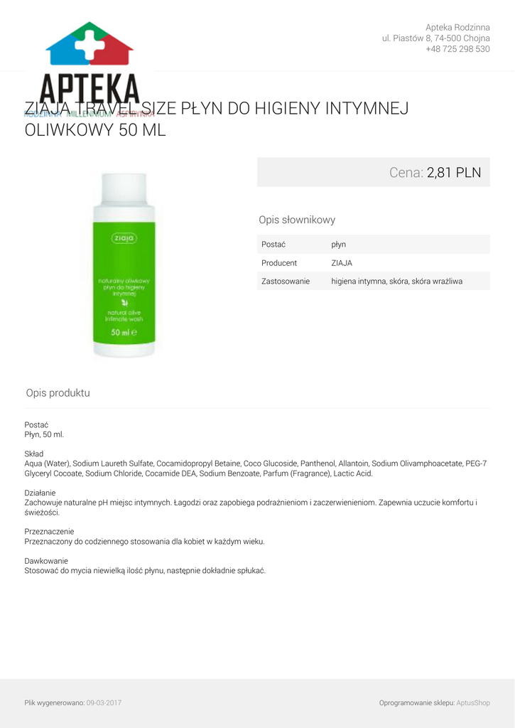 Apteka Rodzinna ul. Piastów 8, 74-500 Chojna +48 725 298 530 ZIAJA TRAVEL SIZE PŁYN DO HIGIENY INTYMNEJ OLIWKOWY 50 ML Cena: 2,81 PLN Opis słownikowy Postać płyn Producent ZIAJA Zastosowanie higiena intymna, skóra, skóra wrażliwa Opis produktu Postać Płyn, 50 ml. Skład Aqua (Water), Sodium Laureth Sulfate, Cocamidopropyl Betaine, Coco Glucoside, Panthenol, Allantoin, Sodium Olivamphoacetate, PEG-7 Glyceryl Cocoate, Sodium Chloride, Cocamide DEA, Sodium Benzoate, Parfum (Fragrance), Lactic Acid. Działanie Zachowuje naturalne pH miejsc intymnych. Łagodzi oraz zapobiega podrażnieniom i zaczerwienieniom. Zapewnia uczucie komfortu i świeżości. Przeznaczenie Przeznaczony do codziennego stosowania dla kobiet w każdym wieku. Dawkowanie Stosować do mycia niewielką ilość płynu, następnie dokładnie spłukać. Plik wygenerowano: 09-03-2017 Powered by TCPDF (www.tcpdf.org) Oprogramowanie sklepu: AptusShop