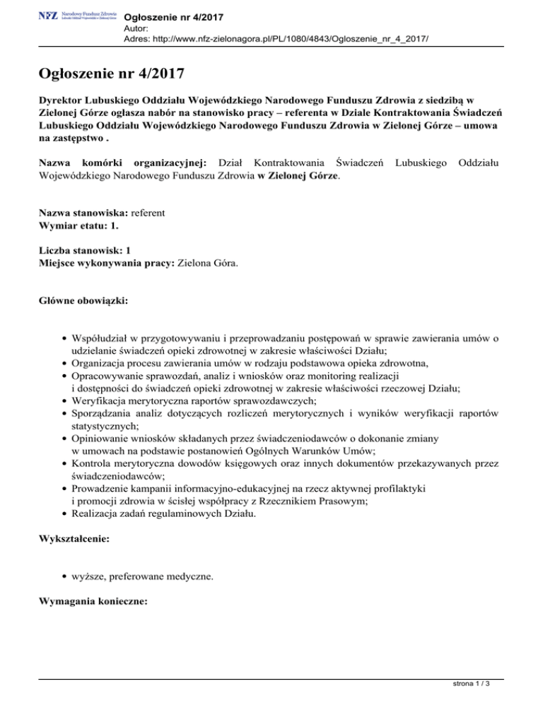 Ogłoszenie nr 4/2017 Autor: Adres: http://www.nfz-zielonagora.pl/PL/1080/4843/Ogloszenie_nr_4_2017/ Ogłoszenie nr 4/2017 Dyrektor Lubuskiego Oddziału Wojewódzkiego Narodowego Funduszu Zdrowia z siedzibą w Zielonej Górze ogłasza nabór na stanowisko pracy – referenta w Dziale Kontraktowania Świadczeń Lubuskiego Oddziału Wojewódzkiego Narodowego Funduszu Zdrowia w Zielonej Górze – umowa na zastępstwo . Nazwa komórki organizacyjnej: Dział Kontraktowania Świadczeń Wojewódzkiego Narodowego Funduszu Zdrowia w Zielonej Górze. Lubuskiego Oddziału Nazwa stanowiska: referent Wymiar etatu: 1. Liczba stanowisk: 1 Miejsce wykonywania pracy: Zielona Góra. Główne obowiązki: Współudział w przygotowywaniu i przeprowadzaniu postępowań w sprawie zawierania umów o udzielanie świadczeń opieki zdrowotnej w zakresie właściwości Działu; Organizacja procesu zawierania umów w rodzaju podstawowa opieka zdrowotna, Opracowywanie sprawozdań, analiz i wniosków oraz monitoring realizacji i dostępności do świadczeń opieki zdrowotnej w zakresie właściwości rzeczowej Działu; Weryfikacja merytoryczna raportów sprawozdawczych; Sporządzania analiz dotyczących rozliczeń merytorycznych i wyników weryfikacji raportów statystycznych; Opiniowanie wniosków składanych przez świadczeniodawców o dokonanie zmiany w umowach na podstawie postanowień Ogólnych Warunków Umów; Kontrola merytoryczna dowodów księgowych oraz innych dokumentów przekazywanych przez świadczeniodawców; Prowadzenie kampanii informacyjno-edukacyjnej na rzecz aktywnej profilaktyki i promocji zdrowia w ścisłej współpracy z Rzecznikiem Prasowym; Realizacja zadań regulaminowych Działu. Wykształcenie: wyższe, preferowane medyczne. Wymagania konieczne: strona 1 / 3 Ogłoszenie nr 4/2017 Autor: Adres: http://www.nfz-zielonagora.pl/PL/1080/4843/Ogloszenie_nr_4_2017/ Dobra umiejętność obsługi komputera i urządzeń powiązanych (drukarka, skaner, fax), znajomość pakietu Office (Word, Excel, Access) oraz poprawnego formułowania korespondencji urzędowej; Znajomość zasad funkcjonowania systemu ochrony zdrowia w Polsce; Umiejętność pracy w zespole; Wymagania pożądane: Systematyczność i samodzielność; Komunikatywność, Odporność na stres, Doświadczenie zawodowe w zakresie zbliżonym do dziedziny lub charakteru pracy na stanowisku, na które prowadzony jest nabór. Ponadto kandydaci do zatrudnienia powinni spełniać wymogi określone dla pracowników NFZ w art. 112 ustawy z dnia 27 sierpnia 2004 roku o świadczeniach opieki zdrowotnej finansowanych ze środków publicznych (tekst jednolity: Dz.U.2016.1793 ze zmianami). Wymagane dokumenty i oświadczenia: kopie dokumentów określających wykształcenie, kwalifikacje zawodowe i staż pracy, oświadczenie kandydata o wyrażeniu zgody na przetwarzanie danych osobowych do celów rekrutacji (wymagana klauzula: „Wyrażam zgodę na przetwarzanie moich danych osobowych zawartych w ofercie pracy, dla potrzeb niezbędnych do realizacji procesu rekrutacji, zgodnie z ustawą o ochronie danych osobowych”), życiorys z uwzględnieniem przebiegu kariery zawodowej i krótkim opisem zakresu obowiązków na zajmowanych stanowiskach, list motywacyjny. Dokumenty należy składać do dnia 03 lutego 2017 roku (liczy się data wpływu do LOW NFZ) pod adresem: Lubuski Oddział Wojewódzki Narodowego Funduszu Zdrowia, 65-057 Zielona Góra, ul. Podgórna 9B, IV piętro, pokój 405, z dopiskiem: oferta pracy – Dział Kontraktowania Świadczeń – umowa na zastępstwo – postępowanie nr 4. strona 2 / 3 Ogłoszenie nr 4/2017 Autor: Adres: http://www.nfz-zielonagora.pl/PL/1080/4843/Ogloszenie_nr_4_2017/ Dokumenty należy złożyć w zamkniętej kopercie, wszystkie strony oferty winny być ponumerowane i trwale złączone. Aplikacje niekompletne, niezgodne z wymogami zawartymi w ogłoszeniu oraz które wpłyną do Lubuskiego Oddziału Wojewódzkiego NFZ po upływie wyżej określonego terminu nie będą rozpatrywane w ramach prowadzonej rekrutacji. Kandydaci spełniający wymogi formalne zostaną powiadomieni o terminie rozmowy kwalifikacyjnej stosownym komunikatem na stronie internetowej Oddziału – www.nfz-zielonagora.pl. Komunikat opublikowany zostanie w zakładce „Nasz Oddział” – folder „Praca”. Dokumentów aplikacyjnych nie zwracamy. Dokumenty kandydatów do pracy, którzy nie zostaną zatrudnieni, zostaną zniszczone po zakończeniu rekrutacji na przedmiotowe stanowisko. Informacja telefoniczna: 068 3287634. strona 3 / 3 Powered by TCPDF (www.tcpdf.org)
