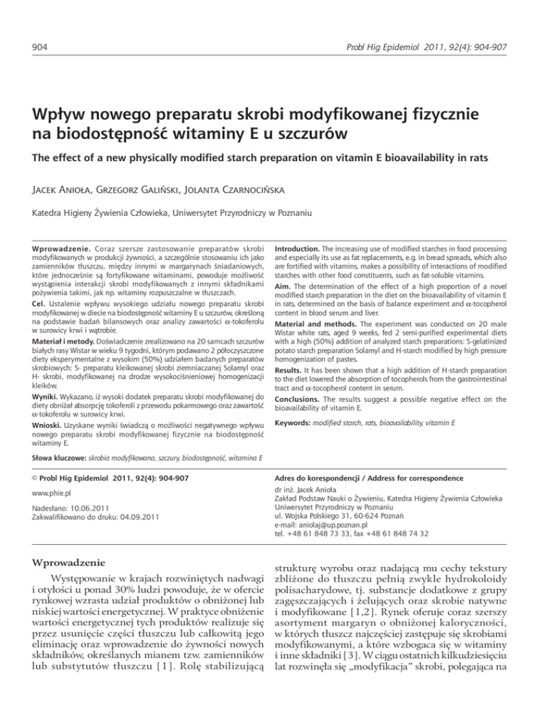 904 Probl Hig Epidemiol 2011, 92(4): 904-907 Wpływ nowego preparatu skrobi modyfikowanej fizycznie na biodostępność witaminy E u szczurów The effect of a new physically modified starch preparation on vitamin E bioavailability in rats Jacek Anioła, Grzegorz Galiński, Jolanta Czarnocińska Katedra Higieny Żywienia Człowieka, Uniwersytet Przyrodniczy w Poznaniu Wprowadzenie. Coraz szersze zastosowanie preparatów skrobi modyfikowanych w produkcji żywności, a szczególnie stosowaniu ich jako zamienników tłuszczu, między innymi w margarynach śniadaniowych, które jednocześnie są fortyfikowane witaminami, powoduje możliwość wystąpienia interakcji skrobi modyfikowanych z innymi składnikami pożywienia takimi, jak np. witaminy rozpuszczalne w tłuszczach. Cel. Ustalenie wpływu wysokiego udziału nowego preparatu skrobi modyfikowanej w diecie na biodostępność witaminy E u szczurów, określoną na podstawie badań bilansowych oraz analizy zawartości α-tokoferolu w surowicy krwi i wątrobie. Materiał i metody. Doświadczenie zrealizowano na 20 samcach szczurów białych rasy Wistar w wieku 9 tygodni, którym podawano 2 półoczyszczone diety eksperymentalne z wysokim (50%) udziałem badanych preparatów skrobiowych: S- preparatu kleikowanej skrobi ziemniaczanej Solamyl oraz H- skrobi, modyfikowanej na drodze wysokociśnieniowej homogenizacji kleików. Wyniki. Wykazano, iż wysoki dodatek preparatu skrobi modyfikowanej do diety obniżał absorpcję tokoferoli z przewodu pokarmowego oraz zawartość α-tokoferolu w surowicy krwi. Wnioski. Uzyskane wyniki świadczą o możliwości negatywnego wpływu nowego preparatu skrobi modyfikowanej fizycznie na biodostępność witaminy E. Introduction. The increasing use of modified starches in food processing and especially its use as fat replacements, e.g. in bread spreads, which also are fortified with vitamins, makes a possibility of interactions of modified starches with other food constituents, such as fat-soluble vitamins. Aim. The determination of the effect of a high proportion of a novel modified starch preparation in the diet on the bioavailability of vitamin E in rats, determined on the basis of balance experiment and α-tocopherol content in blood serum and liver. Material and methods. The experiment was conducted on 20 male Wistar white rats, aged 9 weeks, fed 2 semi-purified experimental diets with a high (50%) addition of analyzed starch preparations: S-gelatinized potato starch preparation Solamyl and H-starch modified by high pressure homogenization of pastes. Results. It has been shown that a high addition of H-starch preparation to the diet lowered the absorption of tocopherols from the gastrointestinal tract and α-tocopherol content in serum. Conclusions. The results suggest a possible negative effect on the bioavailability of vitamin E. Keywords: modified starch, rats, bioavailability, vitamin E Słowa kluczowe: skrobia modyfikowana, szczury, biodostępność, witamina E © Probl Hig Epidemiol 2011, 92(4): 904-907 www.phie.pl Nadesłano: 10.06.2011 Zakwalifikowano do druku: 04.09.2011 Wprowadzenie Występowanie w krajach rozwiniętych nadwagi i otyłości u ponad 30% ludzi powoduje, że w ofercie rynkowej wzrasta udział produktów o obniżonej lub niskiej wartości energetycznej. W praktyce obniżenie wartości energetycznej tych produktów realizuje się przez usunięcie części tłuszczu lub całkowitą jego eliminację oraz wprowadzenie do żywności nowych składników, określanych mianem tzw. zamienników lub substytutów tłuszczu [1]. Rolę stabilizującą Adres do korespondencji / Address for correspondence dr inż. Jacek Anioła Zakład Podstaw Nauki o Żywieniu, Katedra Higieny Żywienia Człowieka Uniwersytet Przyrodniczy w Poznaniu ul. Wojska Polskiego 31, 60-624 Poznań e-mail: [email protected] tel. +48 61 848 73 33, fax +48 61 848 74 32 strukturę wyrobu oraz nadającą mu cechy tekstury zbliżone do tłuszczu pełnią zwykle hydrokoloidy polisacharydowe, tj. substancje dodatkowe z grupy zagęszczających i żelujących oraz skrobie natywne i modyfikowane [1,2]. Rynek oferuje coraz szerszy asortyment margaryn o obniżonej kaloryczności, w których tłuszcz najczęściej zastępuje się skrobiami modyfikowanymi, a które wzbogaca się w witaminy i inne składniki [3]. W ciągu ostatnich kilkudziesięciu lat rozwinęła się „modyfikacja” skrobi, polegająca na Anioła J i wsp. Wpływ nowego preparatu skrobi modyfikowanej fizycznie na biodostępność witaminy E u szczurów nadawaniu preparatom skrobiowym nowych funkcjonalnych właściwości. Preparaty takie dodane do żywności modyfikują jej teksturę, konsystencję, wygląd, wilgotność i trwałość podczas przechowywania, a także są zamiennikami tłuszczu w produktach typu „light” o zmniejszonej wartości energetycznej [4,5]. Mimo szerokiego wykorzystywania dodatków funkcjonalnych w postaci preparatów skrobiowych, wciąż istnieje mało informacji na temat oddziaływania tego typu preparatów z innymi składnikami pożywienia. Cel badań Określenie wpływu wysokiego dodatku do diety nowego preparatu skrobi modyfikowanej w drodze wysokociśnieniowej homogenizacji kleików [6], który w badaniach in vitro [7] odznaczał się niską strawnością, na biodostępność witaminy E u szczurów, określoną na podstawie badań bilansowych oraz analizy zawartości a-tokoferolu w surowicy krwi i wątrobie. Materiały i metody Doświadczenie biologiczne Doświadczenie zrealizowano, za zgodą Lokalnej Komisji Etycznej nr 23/2008, na 20 samcach szczurów białych rasy Wistar w wieku 9 tygodni o średniej masie początkowej 278±20 g. Zwierzęta pochodzące z hodowli Uniwersytetu Medycznego w Poznaniu podzielono na 2 równoliczne grupy, które otrzymywały ad libitum diety eksperymentalne złożone z: preparatów skrobiowych (50%), kazeiny (20%), oleju słonecznikowego (10%), cukru (10%), skrobi ziemniaczanej (5%), mieszanek: witaminowe