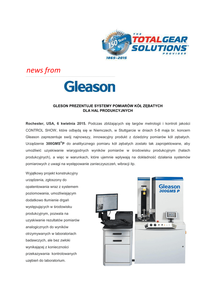 news from ------------------------------------------------------------------------------------------------------------------------------------------------------------------------------------------------------------------------------------------------------------------------------------------------------------------------------------------------------------------------------------------------------------------- GLESON PREZENTUJE SYSTEMY POMIARÓW KÓŁ ZĘBATYCH DLA HAL PRODUKCYJNYCH Rochester, USA, 6 kwietnia 2015. Podczas zbliżających się targów metrologii i kontroli jakości CONTROL SHOW, które odbędą się w Niemczech, w Stuttgarcie w dniach 5-8 maja br. koncern Gleason zaprezentuje swój najnowszy, innowacyjny produkt z dziedziny pomiarów kół zębatych. ® Urządzenie 300GMS P do analitycznego pomiaru kół zębatych zostało tak zaprojektowane, aby umożliwić uzyskiwanie wiarygodnych wyników pomiarów w środowisku produkcyjnym (halach produkcyjnych), a więc w warunkach, które ujemnie wpływają na dokładność działania systemów pomiarowych z uwagi na występowanie zanieczyszczeń, wibracji itp. Wyjątkowy projekt konstrukcyjny urządzenia, zgłoszony do opatentowania wraz z systemem poziomowania, umożliwiającym dodatkowo tłumienie drgań występujących w środowisku produkcyjnym, pozwala na uzyskiwanie rezultatów pomiarów analogicznych do wyników otrzymywanych w laboratoriach badawczych, ale bez zwłoki wynikającej z konieczności przekazywania kontrolowanych uzębień do laboratorium. Wahania termiczne, występujące w halach fabrycznych, są aktywnie kompensowane, co pozwala na uzyskiwanie możliwie najlepszych i najbardziej wiarygodnych wyników pomiarów. System identyfikuje wpływ środowiska produkcyjnego w czasie rzeczywistym i przedstawia wartości skompensowane. ® Urządzenie 300GMS P do analitycznego pomiaru kół zębatych zostało zaprojektowane i przetestowane pod kątem spełniania funkcji kompleksowego systemu kontroli kół zębatych na liniach produkcyjnych. Stanowi dobre rozwiązanie do miarodajnych, dokładnych kontroli kół zębatych dla tak wymagających odbiorców jak przemysł lotniczy, motoryzacyjny i zakładów produkujących małe przekładnie. ® Urządzenie 300GMS®P będące najnowszym uzupełnieniem serii maszyn GMS (dostępne modele dla kół o średnicy do 3000 mm) posiada funkcję pomiaru chropowatości powierzchni oraz pomiaru cech pryzmatycznych. Posiada również bogaty pakiet oprogramowania Gleason GAMA™3.0, który podobnie jak jego poprzednik GAMA™2.0, oferuje użytkownikom bardzo intuicyjny interfejs użytkownika i proste ekrany wejściowe do programowania detalu i wprowadzania danych narzędzia skrawającego. Pakiet GAMA™3.0 zawiera również przewodnik z tematyki kół zębatych, z edytowalnym słowniczkiem, zdjęciami i filmami. Te cechy, w połączeniu z łatwym montażem, zdalnym systemem kontroli i optymalizacją ruchów osi znacząco skracają czas cyklu wymaganego do pełnej kontroli niemal każdego koła zębatego lub narzędzia do produkcji kół, w porównaniu z innymi systemami pomiarowymi kół zębatych, będącymi na rynku. ® Urządzenie pomiarowe 300GMS P jest wyposażone w ergonomiczne stanowisko robocze operatora i zaawansowany interfejs operatora, co znacznie poprawia efektywność pracy na każdym etapie procesu kontroli. Zaawansowany interfejs umożliwia korzystanie z szeregu zaawansowanych funkcji będących w zasięgu ręki operatora, w tym ze stacji monitorowania środowiska z rejestracją temperatury i wilgotności, jak również możliwości wideo-połączeń, notesu oraz przekazywania komunikatów za pomocą wiadomości głosowych Gleason Connect® dla lepszego wsparcia zdalnej diagnozy, tworzenia standardowych instrukcji roboczych, narzędzi szkoleniowych online, komunikacji w wielu językach itp. Misją koncernu Gleason jest dostarczanie kompleksowych rozwiązań z zakresu kół zębatych dla swojej międzynarodowej bazy klientów. Gleason, jako “The Total Gear Solutions Provider ™” jest liderem w rozwoju, produkcji i sprzedaży maszyn do produkcji uzębień i odpowiedniego dla nich wyposażenia. Produkty tej firmy są wykorzystywane przez klientów m.in. w przemyśle samochodowym, transportowym, lotniczym, rolnictwie, górnictwie, energetyce i budownictwie. Gleason posiada zakłady produkcyjne w Stanach Zjednoczonych Ameryki Północnej, w Niemczech, Szwajcarii, Indiach, Chinach i Japonii, jak również posiada biura sprzedaży i obsługi klienta w Ameryce Północnej i Południowej, Europie oraz w regionie Azji i Pacyfiku.