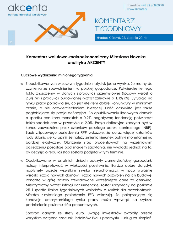 Hradec Králové, 22. sierpnia 2014 r. Komentarz walutowo-makroekonomiczny Miroslava Novaka, analityka AKCENTY Kluczowe wydarzenia minionego tygodnia • Z opublikowanych w zeszłym tygodniu statystyk jasno wynika, że mamy do czynienia ze spowolnieniem w polskiej gospodarce. Potwierdzenie tego faktu znajdziemy w danych z produkcji przemysłowej (lipcowy wzrost o 2,3% r/r) i produkcji budowlanej (wzrost zaledwie o 1,1% r/r). Sytuacja na rynku pracy poprawia się, co jest efektem dobrej koniunktury w minionym czasie, a nie odzwierciedleniem bieżącej. Dość oczywista jest także pogłębiająca się presja deflacyjna. Po opublikowaniu lipcowych danych o spadku cen konsumenckich o 0,2%, negatywną tendencję potwierdził także spadek cen w przemyśle o 2,0%. Presja deflacyjna zaczyna być w końcu zauważalna przez członków polskiego banku centralnego (NBP). Zapis z lipcowego posiedzenia RPP wskazuje, że coraz więcej członków rady skłania się ku opinii, że należy zmienić kierunek polityki monetarnej na bardziej elastyczny. Obniżenie stóp procentowych na wrześniowym posiedzeniu pozostaje pod znakiem zapytania, nie wygląda jednak na to, by decyzja o redukcji stóp została podjęta w tym terminie. • Opublikowane w ostatnich dniach odczyty z amerykańskiej gospodarki należy interpretować w większości pozytywnie. Bardzo dobre statystyki napłynęły przede wszystkim z rynku nieruchomości: w lipcu wyraźnie wzrosła liczba nowych domów i liczba nowych pozwoleń na ich budowę. Ponadto w górę zostały zrewidowane wcześniejsze dane za czerwiec. Międzyroczny wzrost inflacji konsumenckiej został utrzymany na poziomie 2% i spadła liczba tygodniowych wniosków o zasiłek dla bezrobotnych. Minutes z ostatniego posiedzenia FED wskazują, że polepszająca się kondycja amerykańskiego rynku pracy może wpłynąć na szybsze podniesienie poziomu stóp procentowych. Spośród danych ze strefy euro, uwagę inwestorów zwróciły przede wszystkim wstępne szacunki indeksów PMI z przemysłu i usług za sierpień. Spadła wartość indeksu PMI całej strefy, ponieważ zadowalające dane z Niemiec nie zrekompensowały słabych statystyk z Francji i państw z południa kontynentu. Kluczowe wydarzenia obecnego tygodnia • W tym tygodniu zostanie opublikowana lipcowa stopa bezrobocia z Polski. Zgodnie z medianą powinna spaść do 11,8%. Lipcowa sprzedaż detaliczna (publikacja we wtorek) pokaże, z jak silnym popytem wewnętrznym mamy do czynienia i jak wiele jest skłonny wydać polski konsument. W ujęciu międzyrocznym lipcowy wzrost sprzedaży detalicznej powinien poruszać się w granicy 2%. Interesująca będzie także obserwacja postępującego konfliktu na wschodzie Ukrainy. Wszelka ponowna eskalacja konfliktu będzie oznaczać osłabienie polskiej waluty. Powoli zbliża się także posiedzenie RPP. Wynik głosowania nad obniżeniem stóp procentowych pozostaje pod wielkim znakiem zapytania. Redukcja stóp do końca bieżącego roku o minimalnie 50 pkt. jest jednak bardzo prawdopodobna. • Z danych ze starego kontynentu uwagę będą przykuwać odczyty z Niemiec: indeks Ifo, inflacja konsumencka i bezrobocie. W strefie euro zostanie opublikowany wynik inflacji konsumenckiej za sierpień. Kalendarz ekonomiczny w USA także obejmuje interesujące dane, w tym dotyczące zamówień na dobra trwałego użytku, indeks zaufania konsumenckiego czy uaktualnione HDP za 2. kwartał. EURUSD • Na głównej parze walutowej euro znajdowało się pod presją sprzedających od początku minionego tygodnia, co doprowadziło do osłabienia wspólnej waluty europejskiej na prawie roczne minima. Najsłabszą wartość euro osiągnęło w czwartek rano. Przed planowanym piątkowym wystąpieniem J. Yellen handel przebiegał poniżej granicy 1,325 USD/EUR. • Długoterminowa prognoza kursu euro do dolara pozostaje niezmienna. Dywergencja polityki monetarnej prowadzonej przez FED i EBC, pogarszające się perspektywy na polepszenie koniunktury unijnej gospodarki (głównie Niemiec) i wzrastający spór pomiędzy UE a Rosją stanowią mocne argumenty za kontynuacją osłabienia wspólnej waluty do poziomu 1,30 USD/EUR w dalszych miesiącach br. EURPLN i USDPLN • W zeszłym tygodniu polski złoty umocnił tylko nieznacznie, głównie w poniedziałek. Przez resztę tygodnia handel przebiegał przeważnie w paśmie 4,18-4,19 PLN/EUR. Negatywny sentyment połączony z postępującym konfliktem na Ukrainie ucichł, a krajowa gospodarka nie miała dostatecznej siły na wyraźniejsze umocnienie złotego. Na 11miesięczne minima (3,164 PLN/USD) dostał się złoty na parze USDPLN. • Perspektywa na kurs eurozłotego pozostaje na ten tydzień umiarkowanie negatywna. Z jednej strony nie należy wykluczyć ponownej eskalacji kryzysu na Ukrainie. Z drugiej strony będzie przybywać gołębich tonów od członków RPP. Spowolnienie polskiej gospodarki w drugiej połowie roku, niski wzrost cen konsumpcyjnych (obecnie nawet ujemny) i niepewność co do dalszego rozwoju wypadków na Ukrainie stanowią argumenty wspierające spadek wartości złotego na EURPLN w perspektywie nadchodzących miesięcy br. Do końca roku złotówka straci mocniej na parze USDPLN. CEE • Korona w pierwszej połowie tygodnia osłabiała się i na parze walutowej z euro dostała się na jakiś czas powyżej poziomu 28,0 CZK/EUR. Powodów koronowych strat należy się doszukiwać w lipcowym posiedzeniu Czeskiego Banku Narodowego (ČNB). Węgierski forint przez większą część tygodnia poruszał się w paśmie 313-314 HUF/EUR.