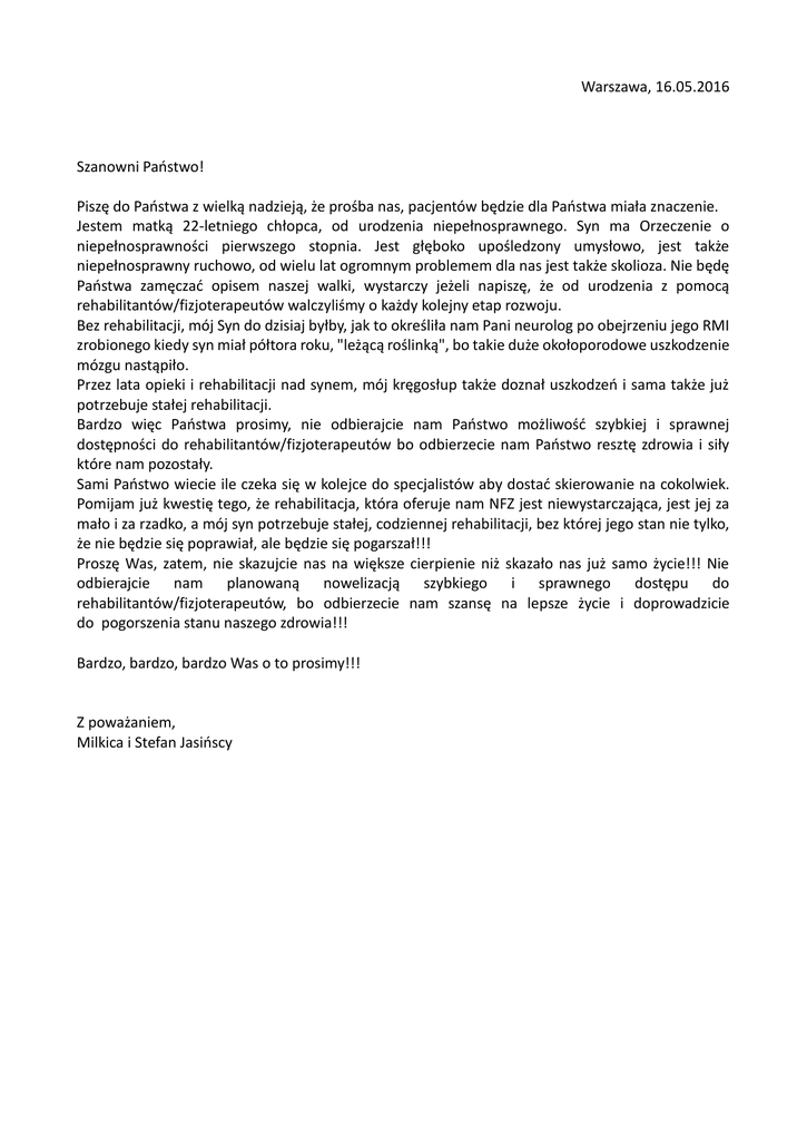 Warszawa, 16.05.2016 Szanowni Państwo! Piszę do Państwa z wielką nadzieją, że prośba nas, pacjentów będzie dla Państwa miała znaczenie. Jestem matką 22-letniego chłopca, od urodzenia niepełnosprawnego. Syn ma Orzeczenie o niepełnosprawności pierwszego stopnia. Jest głęboko upośledzony umysłowo, jest także niepełnosprawny ruchowo, od wielu lat ogromnym problemem dla nas jest także skolioza. Nie będę Państwa zamęczać opisem naszej walki, wystarczy jeżeli napiszę, że od urodzenia z pomocą rehabilitantów/fizjoterapeutów walczyliśmy o każdy kolejny etap rozwoju. Bez rehabilitacji, mój Syn do dzisiaj byłby, jak to określiła nam Pani neurolog po obejrzeniu jego RMI zrobionego kiedy syn miał półtora roku, "leżącą roślinką", bo takie duże okołoporodowe uszkodzenie mózgu nastąpiło. Przez lata opieki i rehabilitacji nad synem, mój kręgosłup także doznał uszkodzeń i sama także już potrzebuje stałej rehabilitacji. Bardzo więc Państwa prosimy, nie odbierajcie nam Państwo możliwość szybkiej i sprawnej dostępności do rehabilitantów/fizjoterapeutów bo odbierzecie nam Państwo resztę zdrowia i siły które nam pozostały. Sami Państwo wiecie ile czeka się w kolejce do specjalistów aby dostać skierowanie na cokolwiek. Pomijam już kwestię tego, że rehabilitacja, która oferuje nam NFZ jest niewystarczająca, jest jej za mało i za rzadko, a mój syn potrzebuje stałej, codziennej rehabilitacji, bez której jego stan nie tylko, że nie będzie się poprawiał, ale będzie się pogarszał!!! Proszę Was, zatem, nie skazujcie nas na większe cierpienie niż skazało nas już samo życie!!! Nie odbierajcie nam planowaną nowelizacją szybkiego i sprawnego dostępu do rehabilitantów/fizjoterapeutów, bo odbierzecie nam szansę na lepsze życie i doprowadzicie do pogorszenia stanu naszego zdrowia!!! Bardzo, bardzo, bardzo Was o to prosimy!!! Z poważaniem, Milkica i Stefan Jasińscy