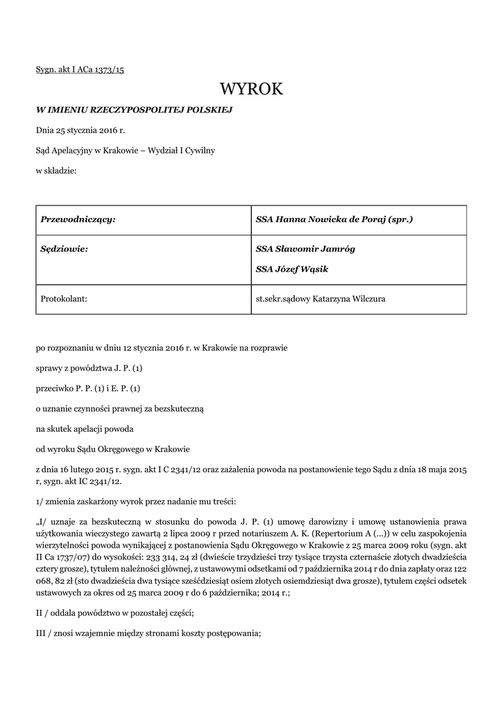 Sygn. akt I ACa 1373/15 WYROK W IMIENIU RZECZYPOSPOLITEJ POLSKIEJ Dnia 25 stycznia 2016 r. Sąd Apelacyjny w Krakowie – Wydział I Cywilny w składzie: Przewodniczący: SSA Hanna Nowicka de Poraj (spr.) Sędziowie: SSA Sławomir Jamróg SSA Józef Wąsik Protokolant: st.sekr.sądowy Katarzyna Wilczura po rozpoznaniu w dniu 12 stycznia 2016 r. w Krakowie na rozprawie sprawy z powództwa J. P. (1) przeciwko P. P. (1) i E. P. (1) o uznanie czynności prawnej za bezskuteczną na skutek apelacji powoda od wyroku Sądu Okręgowego w Krakowie z dnia 16 lutego 2015 r. sygn. akt I C 2341/12 oraz zażalenia powoda na postanowienie tego Sądu z dnia 18 maja 2015 r, sygn. akt IC 2341/12. 1/ zmienia zaskarżony wyrok przez nadanie mu treści: „I/ uznaje za bezskuteczną w stosunku do powoda J. P. (1) umowę darowizny i umowę ustanowienia prawa użytkowania wieczystego zawartą 2 lipca 2009 r przed notariuszem A. K. (Repertorium A (...)) w celu zaspokojenia wierzytelności powoda wynikającej z postanowienia Sądu Okręgowego w Krakowie z 25 marca 2009 roku (sygn. akt II Ca 1737/07) do wysokości: 233 314, 24 zł (dwieście trzydzieści trzy tysiące trzysta czternaście złotych dwadzieścia cztery grosze), tytułem należności głównej, z ustawowymi odsetkami od 7 października 2014 r do dnia zapłaty oraz 122 068, 82 zł (sto dwadzieścia dwa tysiące sześćdziesiąt osiem złotych osiemdziesiąt dwa grosze), tytułem części odsetek ustawowych za okres od 25 marca 2009 r do 6 października; 2014 r.; II / oddala powództwo w pozostałej części; III / znosi wzajemnie między stronami koszty postępowania; IV/ nakazuje ściągnąć od każdego z pozwanych na rzecz Skarbu Państwa – Sądu Okręgowego w Krakowie kwoty po 5 832, 85 zł. (pięć tysięcy osiemset trzydzieści dwa złote osiemdziesiąt pięć grosz) tytułem części opłaty od pozwu od ponoszenia której powód był zwolniony.” V/przyznaje od Skarbu Państwa – Sądu Okręgowego w Krakowie na rzecz adwokat E. G. kwotę 8 856 zł (osiem tysięcy osiemset pięćdziesiąt sześć złotych), w tym 1 656 zł podatku od towarów i usług, tytułem kosztów nieopłaconej pomocy prawnej udzielonej powodowi z urzędu.”; 2/ oddala apelację w pozostałej części; 3/ uchyla zaskarżone postanowienie; 4/ znosi pomiędzy stronami koszty postępowania apelacyjnego i zażaleniowego; 5/ przyznaje od Skarbu Państwa – Sądu Okręgowego w Krakowie na rzecz adwokat E. G. kwotę 9 963 zł (dziewięć tysięcy dziewięćset sześćdziesiąt trzy złote) w tym 1 863 zł podatku od towarów i usług, tytułem kosztów nieopłaconej pomocy prawnej udzielonej powodowi z urzędu w postępowaniu apelacyjnym i zażaleniowym. SSA Józef Wąsik SSA Hanna Nowicka de Poraj SSA Sławomir Jamróg I ACa 1373/15 UZASADNIENIE Powód J. P. (1) , wskazując jako pozwanych P. P. (1) i E. P. (1) domagał się uznania za bezskuteczną w stosunku do powoda umowę darowizny i umowę ustanowienia prawa użytkowania zawartą z dnia 2 lipca 2009r przed notariuszem A. K. w kancelarii notarialnej w K. Rep.A nr(...)na mocy której M. P. (1) darowała pozwanym prawo użytkowania wieczystego działki nr (...) oraz prawo własności stojącego na niej budynku położonego w K. przy ul. (...) – w celu zaspokojenia wierzytelności powoda, wynikającej z postanowienia Sądu Rejonowego dlaK.z dnia 16 marca 2007r – sygn. I Ns 2525/02/K zmienionego postanowieniem Sądu Okręgowego w Krakowie z dnia 25 marca 2009r sygn. II Ca 1737/07 tj. kwoty 555.541,00 zł. Pozwani P. P. (1) i E. P. (1) wnieśli o oddalenie powództwa i zasądzenie kosztów postępowania. W uzasadnieniu podali, że są dziećmi powoda i M. P. (1), że pomiędzy powodem a M. P. (1) doszło do sądowego podziału majątku, w wyniku którego M. P. (1) uzyskała na wyłączną własność przedmiotową nieruchomość za spłatą na rzecz powoda. Ostatecznie, w toku procesu, pozwani zarzucili, że nie istnieje wierzytelność, będąca przedmiotem ochrony. Wygasła ona na skutek jej potrącenia z wierzytelnościami dłużniczki M. P. (1) nabytymi w drodze cesji od innych wierzycieli powoda. Sąd Okręgowy w Krakowie wyrokiem z dnia 16 lutego 2015 r, sygn.. akt IC 2341/12, Oddalił powództwo i orzekł o kosztach postępowania adekwatnie do wyniku sporu. W uzasadnieniu Sąd Okręgowy ustalił co następuje. Postanowieniem Sądu Rejonowego dla K.z dnia 16 marca 2007r (I Ns 2525/11/K), zmienionym postanowieniem Sądu Okręgowego w Krakowie z dnia 25 marca 2009r (II Ca 1737/07) dokonano podziału majątku wspólnego M. P. (1) i J. P. (1) oraz zniesienia współwłasności J. S. w ten sposób że: przyznano M. P. (1) prawo użytkowania wieczystego działki nr (...) zabudowanej budynkiem mieszkalnym przy ul. (...) w K. i zasądzono od M. P. (1) na rzecz J. P. (1) tytułem spłaty kwotę 406.303,00 zł z ustawowymi odsetkami od 25 marca 2009r a ponadto zasądzono od J. S. na rzecz M. P. (1) kwotę 284.000,00 zł z ustawowymi odsetkami od 25 marca 2009r. Dnia 02 lipca 2009r M. P. (1) zawarła z pozwanymi (tj. dziećmi swymi i powoda) – umowę darowizn i ustanowienia prawa użytkowania, mocą której darowała każdemu z nich po ½ części udział w prawie użytkowania wieczystego działki nr (...) oraz w prawie stanowiącego odrębną własność budynku mieszkalnego płożonego na tej działce w K. przy ul . (...), dla której Sąd Rejonowy dla K.prowadzi księgę wieczystą nr (...). Ustanowiła jednocześnie na rzecz siebie samej prawo dożywotniego bezpłatnego użytkowania na prawie wieczystego użytkowania działki i prawie własności budynku. W 2013r powód wszczął przeciwko M. P. (1) postępowanie egzekucyjne celem wyegzekwowania od niej kwoty wynikającej z przywołanego wcześniej postanowienia o podział majątku wspólnego, ale został zawiadomiony przez komornika pismem z dnia 22.11.2013r, że egzekucja z nieruchomości jest bezskuteczna – bo nieruchomość nie należy już do dłużniczki. Pow