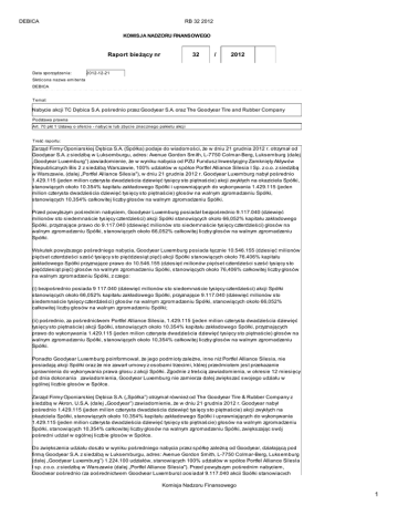 DEBICA RB 32 2012 KOMISJA NADZORU FINANSOWEGO Raport bieżący nr Data sporządzenia: 32 / 2012 2012-12-21 Skrócona nazwa emitenta DEBICA Temat Nabycie akcji TC Dębica S.A. pośrednio przez Goodyear S.A. oraz The Goodyear Tire and Rubber Company Podstawa prawna Art. 70 pkt 1 Ustawy o ofercie - nabyc ie lub zbyc ie znacznego pakietu akc ji Treść raportu: Zarząd Firmy Oponiarskiej Dębica S.A. (Spółka) podaje do wiadomości, że w dniu 21 grudnia 2012 r. otrzymał od Goodyear S.A. z siedzibą w Luksemburgu, adres: Avenue Gordon Smith, L-7750 Colmar-Berg, Luksemburg (dalej „Goodyear Luxemburg”) zawiadomienie, że w wyniku nabycia od PZU Fundusz Inwestycyjny Zamknięty Aktywów Niepublicznych Bis 2 z siedzibą Warszawie, 100% udziałów w spółce Portfel Alliance Silesia I Sp. z o.o. z siedzibą w Warszawie, (dalej „Portfel Alliance Silesia"), w dniu 21 grudnia 2012 r. Goodyear Luxemburg nabył pośrednio 1.429.115 (jeden milion czterysta dwadzieścia dziewięć tysięcy sto piętnaście) akcji zwykłych na okaziciela Spółki, stanowiących około 10.354% kapitału zakładowego Spółki i uprawniających do wykonywania 1.429.115 (jeden milion czterysta dwadzieścia dziewięć tysięcy sto piętnaście) głosów na walnym zgromadzeniu Spółki, stanowiących 10,354% całkowitej liczby głosów na walnym zgromadzeniu Spółki. Przed powyższym pośrednim nabyciem, Goodyear Luxemburg posiadał bezpośrednio 9.117.040 (dziewięć milionów sto siedemnaście tysięcy czterdzieści) akcji Spółki stanowiących około 66,052% kapitału zakładowego Spółki, przyznające prawo do 9.117.040 (dziewięć milionów sto siedemnaście tysięcy czterdzieści) głosów na walnym zgromadzeniu Spółki, stanowiących około 66,052% całkowitej liczby głosów na walnym zgromadzeniu Spółki. Wskutek powyższego pośredniego nabycia, Goodyear Luxemburg posiada łącznie 10.546.155 (dziesięć milionów pięćset czterdzieści sześć tysięcy sto pięćdziesiąt pięć) akcji Spółki stanowiących około 76.406% kapitału zakładowego Spółki przyznające prawo do 10.546.155 (dziesięć milionów pięćset czterdzieści sześć tysięcy sto pięćdziesiąt pięć) głosów na walnym zgromadzeniu Spółki, stanowiących około 76,406% całkowitej liczby głosów na walnym zgromadzeniu Spółki, z czego: (i) bezpośrednio posiada 9 117.040 (dziewięć milionów sto siedemnaście tysięcy czterdzieści) akcji Spółki stanowiących około 66,052% kapitału zakładowego Spółki, przyznające 9.117.040 (dziewięć milionów sto siedemnaście tysięcy czterdzieści) głosów na walnym zgromadzeniu Spółki, stanowiących około 66,052% całkowitej liczby głosów na walnym zgromadzeniu Spółki; (ii) pośrednio, za pośrednictwem Portfel Alliance Silesia, 1.429.115 (jeden milion czterysta dwadzieścia dziewięć tysięcy sto piętnaście) akcji Spółki, stanowiących około 10.354% kapitału zakładowego Spółki, przyznających prawo do wykonywania 1.429.115 (jeden milion czterysta dwadzieścia dziewięć tysięcy sto piętnaście) głosów na walnym zgromadzeniu Spółki, stanowiących około 10,354% całkowitej liczby głosów na walnym zgromadzeniu Spółki. Ponadto Goodyear Luxemburg poinformował, że jego podmioty zależne, inne niż Portfel Alliance Silesia, nie posiadają akcji Spółki oraz że nie zawarł umowy z osobami trzecimi, której przedmiotem jest przekazanie uprawnienia do wykonywania prawa głosu z akcji Spółki. Zgodnie z treścią zawiadomienia, w okresie 12 miesięcy od dnia dokonania zawiadomienia, Goodyear Luxemburg nie zamierza dalej zwiększać swojego udziału w ogólnej liczbie głosów w Spółce. Zarząd Firmy Oponiarskiej Dębica S.A. („Spółka”) otrzymał również od The Goodyear Tire & Rubber Company z siedzibą w Akron, U.S.A. (dalej „Goodyear”) zawiadomienie, że w dniu 21 grudnia 2012 r. Goodyear nabył pośrednio 1.429.115 (jeden milion czterysta dwadzieścia dziewięć tysięcy sto piętnaście) akcji zwykłych na okaziciela Spółki, stanowiących około 10.354% kapitału zakładowego Spółki i uprawniających do wykonywania 1.429.115 (jeden milion czterysta dwadzieścia dziewięć tysięcy sto piętnaście) głosów na walnym zgromadzeniu Spółki, stanowiących 10,354% całkowitej liczby głosów na walnym zgromadzeniu Spółki, zwiększając swój pośredni udział w ogólnej liczbie głosów w Spółce. Do zwiększenia udziału doszło w wyniku pośredniego nabycia przez spółkę zależną od Goodyear, działającą pod firmą Goodyear S.A. z siedzibą w Luksemburgu, adres: Avenue Gordon Smith, L-7750 Colmar-Berg, Luksemburg (dalej „Goodyear Luxemburg”) 1.224.100 udziałów, stanowiących 100% udziałów w spółce Portfel Alliance Silesla I sp. z o.o. z siedzibą w Warszawie (dalej „Portfel Alliance Silesia"). Przed powyższym pośrednim nabyciem, Goodyear pośrednio (za pośrednictwem Goodyear Luxemburg) posiadał 9.117.040 akcji Spółki stanowiących Komisja Nadzoru Finansowego 1 DEBICA RB 32 2012 Goodyear pośrednio (za pośrednictwem Goodyear Luxemburg) posiadał 9.117.040 akcji Spółki stanowiących około 66,052% kapitału zakładowego Spółki, przyznające prawo do 9.117.040 głosów na walnym zgromadzeniu Spółki, stanowiących około 66,052% całkowitej liczby głosów na walnym zgromadzeniu Spółki. Wskutek powyższego pośredniego nabycia, Goodyear posiada pośrednio (za pośrednictwem Goodyear Luxemburg oraz Portfel Alliance Silesia) łącznie 10.546.155 akcji Spółki stanowiących około 76,406% kapitału zakładowego Spółki przyznające prawo do 10.546.155 głosów na walnym zgromadzeniu Spółki, stanowiących około 76,406% całkowitej liczby głosów na walnym zgromadzeniu Spółki. Ponadto Goodyear poinformował, że jego podmioty zależne, inne niż Goodyear Luxemburg oraz Portfel Alliance Silesia nie posiadają akcji Spółki oraz że nie zawarł umowy z osobami trzecimi, której przedmiotem jest przekaz