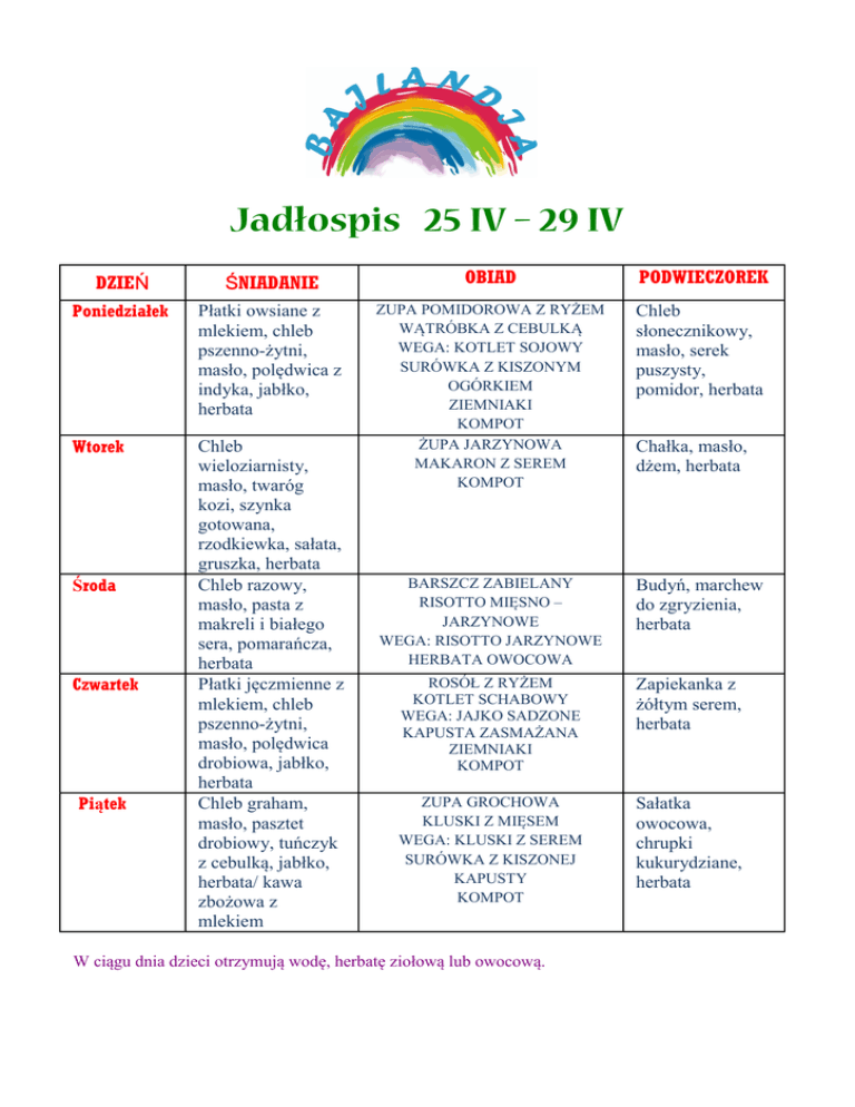 Jadłospis 25 IV – 29 IV DZIEŃ ŚNIADANIE OBIAD PODWIECZOREK Poniedziałek Płatki owsiane z mlekiem, chleb pszenno-żytni, masło, polędwica z indyka, jabłko, herbata Chleb słonecznikowy, masło, serek puszysty, pomidor, herbata Wtorek Chleb wieloziarnisty, masło, twaróg kozi, szynka gotowana, rzodkiewka, sałata, gruszka, herbata Chleb razowy, masło, pasta z makreli i białego sera, pomarańcza, herbata Płatki jęczmienne z mlekiem, chleb pszenno-żytni, masło, polędwica drobiowa, jabłko, herbata Chleb graham, masło, pasztet drobiowy, tuńczyk z cebulką, jabłko, herbata/ kawa zbożowa z mlekiem ZUPA POMIDOROWA Z RYŻEM WĄTRÓBKA Z CEBULKĄ WEGA: KOTLET SOJOWY SURÓWKA Z KISZONYM OGÓRKIEM ZIEMNIAKI KOMPOT ŻUPA JARZYNOWA MAKARON Z SEREM KOMPOT BARSZCZ ZABIELANY RISOTTO MIĘSNO – JARZYNOWE WEGA: RISOTTO JARZYNOWE HERBATA OWOCOWA Budyń, marchew do zgryzienia, herbata Środa Czwartek Piątek Chałka, masło, dżem, herbata ROSÓŁ Z RYŻEM KOTLET SCHABOWY WEGA: JAJKO SADZONE KAPUSTA ZASMAŻANA ZIEMNIAKI KOMPOT Zapiekanka z żółtym serem, herbata ZUPA GROCHOWA KLUSKI Z MIĘSEM WEGA: KLUSKI Z SEREM SURÓWKA Z KISZONEJ KAPUSTY KOMPOT Sałatka owocowa, chrupki kukurydziane, herbata W ciągu dnia dzieci otrzymują wodę, herbatę ziołową lub owocową.