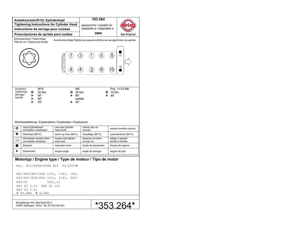Anziehvorschrift für Zylinderkopf Tightening Instructions for Cylinder Head Instructions de serrage pour culasse 353.264 passend für / suitable for adaptable à / adaptable a BMW Prescripciones de apriete para culatas Schraubenkopf / Head shape Tête de vis / Cabeza de tornillo Anziehen/ Tightening/ Serrage/ Apriete ❂ ➤ ➤ ➤ Anziehreihenfolge/Tightening sequence/Ordre de serrage/Orden de apriete M10 30 Nm 90° 90° 45° M9 Pos. 11/12 M9 ❂ 30 Nm ➤ 90° ❂ 10 Nm ➤ 90° entfällt ➤ 45° Zeichenerklärung / Explanations / Explication / Explicacion ❂ neue Zylinderkopfschrauben verwenden use new cylinder head bolts utiliser des vis neuves emplar tornillos nuevos ✱ Warmlauf (80°C) warm up time (80°C) chauffage (80°C) calentamiento (80°C) ❏ Schrauben einzeln lösen und wieder anziehen loosen and tighten each bolt deserrer et serrer vis par vis aflojar y apretar tornillo a tornillo ● Setzzeit relaxation time durée de tassement tiempo de espera ➤ Drehwinkel torque angle angle de serrage ángulo de giro Motortyp / Engine type / Type de moteur / Tipo de motor Mot. N43/N45N/N46N B20 02/2007® E81/E82/E87/E88 116i, 118i, 120i E90/E91/E92/E93 316i, 318i, 320i E60/61 520i,Li E83 X3 2.0i E84 X1 18i E85 Z4 2.0i Ø 84,8mm ¿ 0,5mm ElringKlinger AG, Max-Eyth-Str.2 72581 Dettingen / Erms. Tel. 07123/724 601 *353.264*