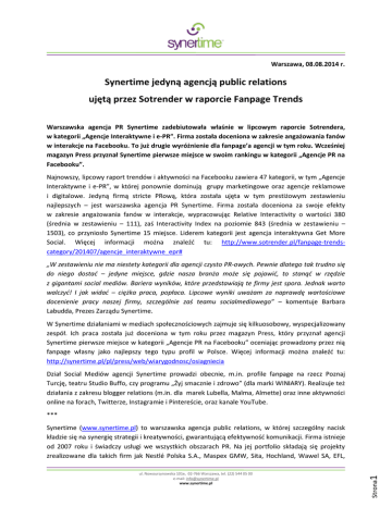 Warszawa, 08.08.2014 r. Synertime jedyną agencją public relations ujętą przez Sotrender w raporcie Fanpage Trends Warszawska agencja PR Synertime zadebiutowała właśnie w lipcowym raporcie Sotrendera, w kategorii „Agencje Interaktywne i e-PR”. Firma została doceniona w zakresie angażowania fanów w interakcje na Facebooku. To już drugie wyróżnienie dla fanpage’a agencji w tym roku. Wcześniej magazyn Press przyznał Synertime pierwsze miejsce w swoim rankingu w kategorii „Agencje PR na Facebooku”. Najnowszy, lipcowy raport trendów i aktywności na Facebooku zawiera 47 kategorii, w tym „Agencje Interaktywne i e-PR”, w której ponownie dominują grupy marketingowe oraz agencje reklamowe i digitalowe. Jedyną firmą stricte PRową, która została ujęta w tym prestiżowym zestawieniu najlepszych – jest warszawska agencja PR Synertime. Firma została doceniona za swoje efekty w zakresie angażowania fanów w interakcje, wypracowując Relative Interactivity o wartości 380 (średnia w zestawieniu – 111), zaś Interactivity Index na poziomie 843 (średnia w zestawieniu – 1503), co przyniosło Synertime 15 miejsce. Liderem kategorii jest agencja interaktywna Get More Social. Więcej informacji można znaleźć tu: http://www.sotrender.pl/fanpage-trendscategory/201407/agencje_interaktywne_epr# „W zestawieniu nie ma niestety kategorii dla agencji czysto PR-owych. Pewnie dlatego tak trudno się do niego dostać – jedyne miejsce, gdzie nasza branża może się pojawić, to stanąć w rzędzie z gigantami social mediów. Bariera wyników, które przedstawiają te firmy jest spora. Jednak warto walczyć! I jak widać – ciężka praca, popłaca. Lipcowe wyniki uważam za naprawdę wartościowe docenienie pracy naszej firmy, szczególnie zaś teamu socialmediowego” – komentuje Barbara Labudda, Prezes Zarządu Synertime. W Synertime działaniami w mediach społecznościowych zajmuje się kilkuosobowy, wyspecjalizowany zespół. Ich praca została już doceniona w tym roku przez magazyn Press, który przyznał agencji Synertime pierwsze miejsce w kategorii „Agencje PR na Facebooku” oceniając prowadzony przez nią fanpage własny jako najlepszy tego typu profil w Polsce. Więcej informacji można znaleźć tu: http://synertime.pl/pl/press/web/wiarygodnosc/osiagniecia Dział Social Mediów agencji Synertime prowadzi obecnie, m.in. profile fanpage na rzecz Poznaj Turcję, teatru Studio Buffo, czy programu „Żyj smacznie i zdrowo” (dla marki WINIARY). Realizuje też działania z zakresu blogger relations (m.in. dla marek Lubella, Malma, Almette) oraz inne aktywności online na forach, Twitterze, Instagramie i Pintereście, oraz kanale YouTube. *** ul. Nowoursynowska 101e, 02-766 Warszawa, tel. (22) 544 05 00 e-mail: [email protected] www.synertime.pl Strona1 Synertime (www.synertime.pl) to warszawska agencja public relations, w której szczególny nacisk kładzie się na synergię strategii i kreatywności, gwarantującą efektywność komunikacji. Firma istnieje od 2007 roku i świadczy usługi we wszystkich obszarach PR. Na jej portfolio składają się projekty zrealizowane dla takich firm jak Nestlé Polska S.A., Maspex GMW, Sita, Hochland, Wawel SA, EFL, ul. Nowoursynowska 101e, 02-766 Warszawa, tel. (22) 544 05 00 e-mail: [email protected] www.synertime.pl Strona2 Budimex, Expander, Wienerberger, Yoskine oraz wielu miast i regionów oraz fundacji. Agencja jest laureatem Złotych Spinaczy – najważniejszej nagrody dla działań public relations w Polsce. Projekty Synertime zostały uznane za najlepsze w różnych kategoriach w latach 2008, 2009, a także 2011, kiedy firma otrzymała też wyróżnienia w kategorii event społeczny oraz w kategorii specjalnej – efektywność.