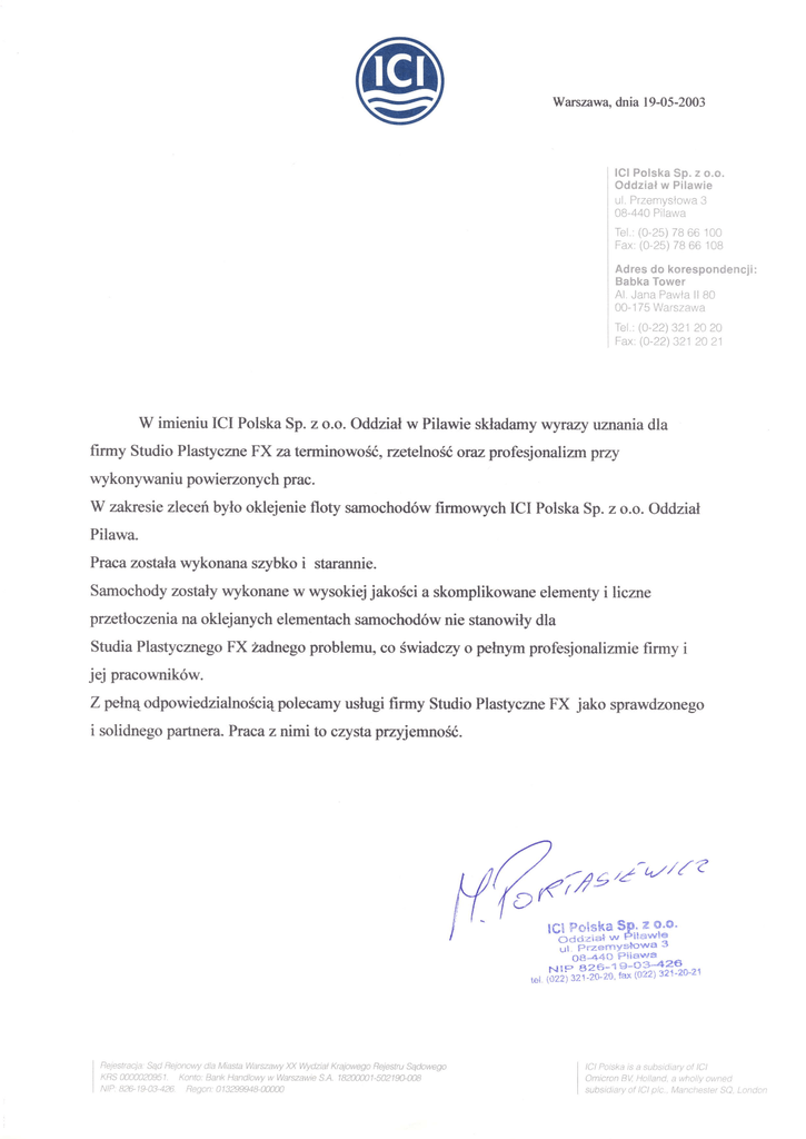 Warszawa,dnia 19-05-2003 lCl Polska Sp. z o.o. oddział w Pi|awie ul. Przemys'fowa3 OB-440Pilawa Tel (0-25)78 66 100 Fax: (0-25)78 66 l0B Adres do korespondencji : Babka Tower Al. Jana Pawta ll B0 0O-l75 Warszawa fel : (O-22)321 20 20 Fax (O-22)321 2A 21 W imięniu ICI Polska Sp. z o.o. oddział w Pilawie składamy:vqtlazyuznania dla firmy Studio Plastyczre FXzaterminowość,ruetelność, orazprofesjonaliarlprzy wykonywaniu powierzonychprac. W zakręsięz|e'cetlbyłooklejenie floty samochodówfirmowych ICI Polska Sp. z o.o. oddział Pilawa. Praca zastaławykonanaszybko i starannie. SamochodyzostaĘ w wysokiej jakościa skomplikowaneelementyi liczne przetłoczeniana oklejanych ęlemęntachsamochodównie starrowiĘdla Sfudia PlastycznegoFX żadnegoproblemu,co świadczyo pełnymprofesjonalizmiefirmy i jej pracowników. Z pełnąodpowiędzialnościąpolecamy usługifir-y sfudio Plastyczne FX jako sprawdzonego solidnego partnera.Praca z nimi to czysta przyjemność. ,') , ,l/ ,/ .n49 /f-ą/i/? M',1'"nK" '' '"alsl?5i-sBiffi I u| PrzerĘvsłowa 5 .-. .uir;Ę#?HB*ł:*,, Rejestracje' sąd Rejonowy dla Miasta Warszawy XX Wydział Krajawega Bejestru sqdawega KRS 0A0a02A951. Kanto Bank Handlow w Warszawte S.A. 18200Aa1-50219G0A8 NlP 826'19 03,126 Beqcn A13299918 0AAC0 I tCt POisfa is a subsidiary of lCt Onicron BV, Hallan(1. a v/holiy avr'ned I 1 subsidiarv af lCl Dlc lr'laocltesler SO L.ndan