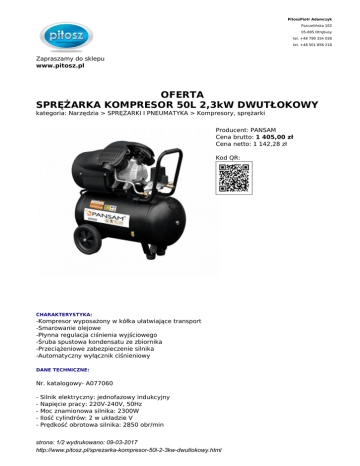 PitoszPiotr Adamczyk Pszczelińska 102 05-805 Otrębusy tel. +48 790 354 038 tel. +48 501 858 218 Zapraszamy do sklepu www.pitosz.pl OFERTA SPRĘŻARKA KOMPRESOR 50L 2,3kW DWUTŁOKOWY kategoria: Narzędzia > SPRĘŻARKI I PNEUMATYKA > Kompresory, sprężarki Producent: PANSAM Cena brutto: 1 405,00 zł Cena netto: 1 142,28 zł Kod QR: CHARAKTERYSTYKA: -Kompresor wyposażony w kółka ułatwiające transport -Smarowanie olejowe -Płynna regulacja ciśnienia wyjściowego -Śruba spustowa kondensatu ze zbiornika -Przeciążeniowe zabezpieczenie silnika -Automatyczny wyłącznik ciśnieniowy DANE TECHNICZNE: Nr. katalogowy- A077060 - Silnik elektryczny: jednofazowy indukcyjny Napięcie pracy: 220V-240V, 50Hz Moc znamionowa silnika: 2300W Ilość cylindrów: 2 w układzie V Prędkość obrotowa silnika: 2850 obr/min strona: 1/2 wydrukowano: 09-03-2017 http://www.pitosz.pl/sprezarka-kompresor-50l-2-3kw-dwutlokowy.html - Maksymalne ciśnienie tłoczenia: 8 bar Wydajność powietrza 400l/min Pojemność zbiornika powietrza; 50l Masa: 43kg. strona: 2/2 wydrukowano: 09-03-2017 http://www.pitosz.pl/sprezarka-kompresor-50l-2-3kw-dwutlokowy.html