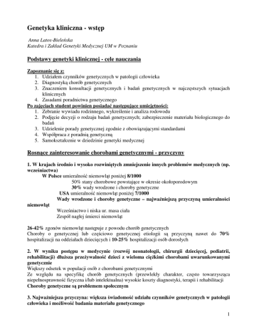 Genetyka kliniczna - wstęp Anna Latos-Bieleńska Katedra i Zakład Genetyki Medycznej UM w Poznaniu Podstawy genetyki klinicznej - cele nauczania Zapoznanie się z: 1. Udziałem czynników genetycznych w patologii człowieka 2. Diagnostyką chorób genetycznych 3. Znaczeniem konsultacji genetycznych i badań genetycznych w najczęstszych sytuacjach klinicznych 4. Zasadami poradnictwa genetycznego Po zajęciach student powinien posiadać następujące umiejętności: 1. Zebranie wywiadu rodzinnego, wykreślenie i analiza rodowodu 2. Podjęcie decyzji o rodzaju badań genetycznych; zabezpieczenie materiału biologicznego do badań 3. Udzielenie porady genetycznej zgodnie z obowiązującymi standardami 4. Współpraca z poradnią genetyczną 5. Samokształcenie w dziedzinie genetyki medycznej Rosnące zainteresowanie chorobami genetycznymi - przyczyny 1. W krajach średnio i wysoko rozwiniętych zmniejszenie innych problemów medycznych (np. wcześniactwa) W Polsce umieralność niemowląt poniżej 8/1000 50% stany chorobowe powstające w okresie okołoporodowym 30% wady wrodzone i choroby genetyczne USA umieralność niemowląt poniżej 7/1000 Wady wrodzone i choroby genetyczne – najważniejszą przyczyną umieralności niemowląt Wcześniactwo i niska ur. masa ciała Zespół nagłej śmierci niemowląt 26-42% zgonów niemowląt następuje z powodu chorób genetycznych Choroby o genetycznej lub częściowo genetycznej etiologii są przyczyną nawet do 70% hospitalizacji na oddziałach dziecięcych i 10-25% hospitalizacji osób dorosłych 2. W wyniku postępu w medycynie (rozwój neonatologii, chirurgii dziecięcej, pediatrii, rehabilitacji) dłuższa przeżywalność dzieci z wieloma ciężkimi chorobami uwarunkowanymi genetycznie Większy odsetek w populacji osób z chorobami genetycznymi Ze względu na specyfikę chorób genetycznych (przewlekły charakter, często towarzysząca niepełnosprawność fizyczna i/lub intelektualna) wysokie koszty diagnostyki, terapii i rehabilitacji Choroby genetyczne są problemem społecznym 3. Najważniejsza przyczyna: większa świadomość udziału czynników genetycznych w patologii człowieka i możliwość badania materiału genetycznego 1 „Gdy historycy będą kiedyś oceniać przełom drugiego i trzeciego tysiąclecia, zapewne stwierdzą, że najważniejszym osiągnięciem naukowym naszych czasów było całkowite poznanie genetycznej instrukcji budowy i funkcjonowania człowieka”. (Francis Collins) Skutki poznania genomu człowieka • • • • • • • • • nowe, inne myślenie o organizmie człowieka w warunkach fizjologii i patologii Współczesnego lekarza obowiązuje myślenie genetyczne! zidentyfikowanie genów dla poszczególnych chorób genetycznych; znaczna poprawa diagnostyki genetycznej i poradnictwa genetycznego zmiana klasyfikacji chorób, wyodrębnienie podgrup w ramach dotychczas jednorodnej jednostki chorobowej, wyjaśnienie zróżnicowania objawów klinicznych i zróżnicowanej odpowiedzi na terapię identyfikacja nowych chorób genetycznych (wiele chorób, tzw. idiopatycznych?) indywidualny dobór leku w zależności od defektu molekularnego; dzięki badaniom z zakresu farmakogenomiki indywidualny dobór leku i dawki leku w zależności od genetycznie uwarunkowanego metabolizmu leku (medycyna indywidualna) szerokie stosowanie testów genetycznych, które ulegną ogromnemu uproszczeniu i zautomatyzowaniu identyfikacja genetycznych predyspozycji do częstych chorób wieku dorosłego (medycyna przewidująca) Całkowicie nowe metody terapii oparte na nowych punktach uchwytu; terapia genowa, zwierzęta transgeniczne, komórki macierzyste Rodzaje chorób uwarunkowanych genetycznie 1. Choroby spowodowane aberracjami chromosomowymi 0,6% noworodków rodzi się z aberracją chromosomową o znaczeniu klinicznym (charakterystyczny fenotyp w przypadku aberracji niezrównoważonych) 2. Choroby spowodowane mutacjami pojedynczych genów Dotyczą 2,4% populacji (największa różnorodność kliniczna – kilka tysięcy różnych chorób!) Szczególna forma – choroby spowodowane mutacjami w genomie mitochondrialnym 3. Choroby uwarunkowane wieloczynnikowo Do 20 roku życia ujawniają się u ok. 5% populacji (większość izolowanych wad wrodzonych, wiele częstych chorób wieku dorosłego) Nadciśnienie tętnicze 10% populacji Miażdżyca wysoki % Łuszczyca 1-2% populacji Skaza atopowa 25% Schizofrenia 1% Choroba maniakalno-depresyjna 1-2% Gościec przewlekły postępujący 1% Choroba Alzheimera 5-10% Cukrzyca typu 2 3-7% (osób dorosłych) Nowotwory 25% Nawet do 65% populacji ogólnej zachoruje w trakcie całego życia na chorobę o genetycznej lub częściowo genetycznej etiologii 2 Znajomość genetyki staje się dla lekarza pierwszego kontaktu i lekarza specjalisty koniecznością! Zagadnienia genetyki z poszczególnych specjalnościach lekarskich Położnictwo i ginekologia •Zaburzenia determinacji płci •Genetyczne przyczyny niepłodności małżeńskiej •Metody wspomaganego rozrodu •Diagnostyka preimplantacyjna •Diagnostyka prenatalna chorób genetycznych •Genetyczne przyczyny poronień samoistnych •Choroby genetyczne kobiety mające znaczenie dla przebiegu ciąży •Nowotwory złośliwe w ginekologii Neonatologia •Genetycznie uwarunkowane wrodzone wady rozwojowe Ponad 2% noworodków rodzi się z przynajmniej jedną poważną wadą rozwojową •Choroby metaboliczne ujawniające się w okresie noworodkowym Pediatria •Wady wrodzone •Choroby metaboliczne •Upośledzenie umysłowe •Genetycznie uwarunkowane choroby neurologiczne •Genetycznie uwarunkowane choroby serca, nerek, układu pokarmowego i in. Ok. 80-90% chorób o podłożu wyłącznie genetycznym (aberracje chromosomowe i choroby jednogenowe) manifestuje się klinicznie w wieku rozwojowym Interna •Problemy internistyczne w wielu chorobach o wyłącznie genetycznej etiologii (np. z. Marfana, z. Ehlersa-Danlosa) •W wielu chorobach wieku d