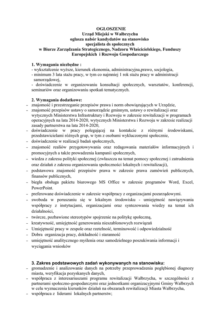 OGŁOSZENIE Urząd Miejski w Wałbrzychu ogłasza nabór kandydatów na stanowisko specjalista ds społecznych w Biurze Zarządzania Strategicznego, Nadzoru Właścicielskiego, Funduszy Europejskich i Rozwoju Gospodarczego 1. Wymagania niezbędne : - wykształcenie wyższe, kierunek ekonomia, administracyjna,prawo, socjologia, - minimum 3 lata stażu pracy, w tym co najmniej 1 rok stażu pracy w administracji samorządowej, - doświadczenie w organizowaniu konsultacji społecznych, warsztatów, konferencji, seminariów oraz organizowaniu spotkań tematycznych. – – – – – – – – – – – – – – – – – – 2. Wymagania dodatkowe: znajomość i przestrzeganie przepisów prawa i norm obowiązujących w Urzędzie, znajomość przepisów ustawy o samorządzie gminnym, ustawy o rewitalizacji oraz wytycznych Ministerstwa Infrastruktury i Rozwoju w zakresie rewitalizacji w programach operacyjnych na lata 2014-2020, wytycznych Ministerstwa i Rozwoju w zakresie realizacji zasady partnerstwa na lata 2014-2020, doświadczenie w pracy polegającej na kontakcie z różnymi środowiskami, przedstawicielami różnych grup, w tym z osobami wykluczonymi społecznie, doświadczenie w realizacji badań społecznych, znajomość realiów przygotowywania oraz redagowania materiałów informacyjnych i promocyjnych a także prowadzenia kampanii społecznych, wiedza z zakresu polityki społecznej (zwłaszcza na temat pomocy społecznej i zatrudnienia oraz działań z zakresu organizowania społeczności lokalnych i rewitalizacji), podstawowa znajomość przepisów prawa w zakresie prawa zamówień publicznych, finansów publicznych, biegła obsługa pakietu biurowego MS Office w zakresie programów Word, Excel, PowerPoint. preferowane doświadczenie w zakresie współpracy z organizacjami pozarządowymi. swoboda w poruszaniu się w lokalnym środowisku - umiejętność nawiązywania współpracy z instytucjami, organizacjami oraz syntezowania wiedzy na temat ich działalności, twórcze, pozbawione stereotypów spojrzenie na politykę społeczną, kreatywność, umiejętność generowania nieszablonowych rozwiązań Umiejętność pracy w zespole oraz rzetelność, terminowość i odpowiedzialność Dobra organizacja pracy, dokładność i staranność umiejętność analitycznego myślenia oraz samodzielnego poszukiwania informacji i wyciągania wniosków 3. Zakres podstawowych zadań wykonywanych na stanowisku: gromadzenie i analizowanie danych na potrzeby przeprowadzenia pogłębionej diagnozy miasta, weryfikacja pozyskanych danych, współpraca z interesariuszami programu rewitalizacji Wałbrzycha, w szczególności z partnerami społeczno-gospodarczymi oraz jednostkami organizacyjnymi Gminy Wałbrzych w celu wyznaczenia kierunków działań na obszarach rewitalizacji Miasta Wałbrzycha, współpraca z liderami lokalnych partnerstw; – – – – – – – – prowadzenie spraw związanych z opracowywaniem, wdrażaniem, monitorowaniem realizacji i aktualizowania Gminnego Programu Rewitalizacji Miasta Wałbrzycha, pozyskiwanie informacji o uwarunkowaniach i możliwościach rozwoju Gminy w zakresie działań rewitalizacyjnych, działania informacyjno-promocyjne związane z tworzeniem, realizacją i monitorowaniem wdrażania Gminnego Programu Rewitalizacji Miasta Wałbrzycha, współpraca w opracowaniu i wdrożeniu jednolitych zasad prowadzenia działań związanych z rewitalizacją i renowacją obszarów miejskich na terenie Gminy Wałbrzych przygotowywanie materiałów edukacyjnych dotyczących Gminnego Programu Rewitalizacji Wałbrzycha, wsparcie działań Biura Zarządzania Strategicznego, Nadzoru Właścicielskiego, Funduszy Europejskich i Rozwoju Gospodarczego w zakresie pozyskiwania środków z dostępnych źródeł przewidzianych na zadania rewitalizacyjne, współpraca z administracją rządową oraz samorządową w zakresie pozyskiwania funduszy zewnętrznych do współfinansowania Programu, współpraca z ekspertami w zakresie przygotowywania Programu 4. Warunki pracy na stanowisku: Specjalista ds społecznych w Biurze Zarządzania Strategicznego, Nadzoru Właścicielskiego, Funduszy Europejskich i Rozwoju Gospodarczego – to stanowisko administracyjno–biurowe, dla którego, w zakresie podstawowych zadań wynikających dla Biura Zarządzania Strategicznego, Nadzoru Właścicielskiego, Funduszy Europejskich i Rozwoju Gospodarczego w Urzędzie Miejskim w Wałbrzychu, uwzględnia się pracę w terenie, poza biurem. Pracownik zatrudniony na w/w stanowisku, poza pracą w terenie, wykonywać będzie prace biurowe z obsługą sprzętu przystosowanego do zadań np. monitor ekranowy, niszczarka, ksero, drukarka, telefon i fax. Pomieszczenia Biura spełniają wymagania w zakresie bezpieczeństwa pracy. 5. Wymagane dokumenty: 1. Życiorys z przebiegiem pracy zawodowej, zawierający w szczególności informację o stażu pracy, potwierdzony własnoręcznym podpisem, 2. List motywacyjny potwierdzony własnoręcznym podpisem, 3. kopia dokumentów potwierdzających wymagane wykształcenie 4. kopia dokumentów potwierdzających wymagany staż pracy: tj. – świadectwa pracy – w przypadku pozostawania w stosunku pracy- zaświadczenie o zatrudnieniu, zawierające okres zatrudnienia – dokument potwierdzający staż absolwencki z Powiatowego Urzędu Pracy 5. Oświadczenie o treści: „wyrażam zgody na przetwarzanie danych osobowych zawartych w ofercie pracy dla potrzeb niezbędnych do realizacji procesu rekrutacji w Urzędzie Miejskim w Wałbrzychu zgodnie z ustawą z dnia 29 sierpnia 1997 r. o ochronie danych osobowych ( Dz.U. z 2014.1182 ) oraz ustawą z dnia 21 listopada 2008 r. o pracownikach samorządowych (Dz.U. z 2014.1202)” potwierdzone własnoręcznym podpisem. Treść tego oświadczenia powinna być zawarta także w liście motywacyjnym oraz życiorysie z przebiegiem pracy zawodowej. 6. Oświadczenie o treści: „ nie byłam (byłem) skazana (y) prawomocnym wyrokiem s