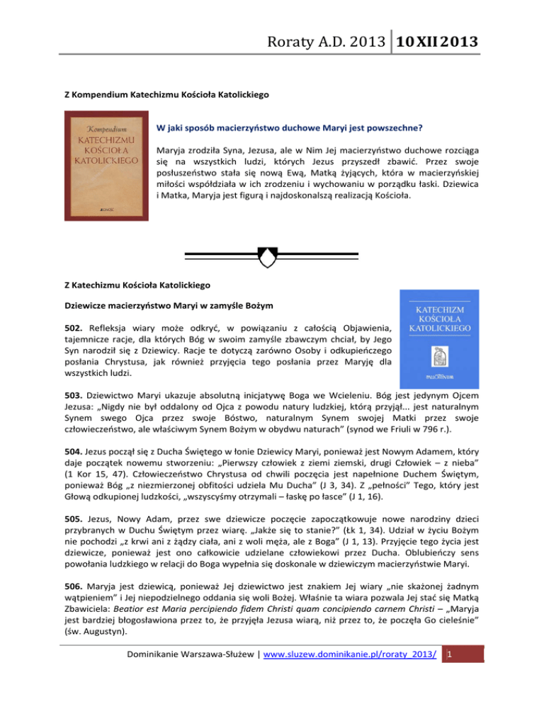 Roraty A.D. 2013 10 XII 2013 Z Kompendium Katechizmu Kościoła Katolickiego W jaki sposób macierzyństwo duchowe Maryi jest powszechne? Maryja zrodziła Syna, Jezusa, ale w Nim Jej macierzyństwo duchowe rozciąga się na wszystkich ludzi, których Jezus przyszedł zbawić. Przez swoje posłuszeństwo stała się nową Ewą, Matką żyjących, która w macierzyńskiej miłości współdziała w ich zrodzeniu i wychowaniu w porządku łaski. Dziewica i Matka, Maryja jest figurą i najdoskonalszą realizacją Kościoła. Z Katechizmu Kościoła Katolickiego Dziewicze macierzyństwo Maryi w zamyśle Bożym 502. Refleksja wiary może odkryć, w powiązaniu z całością Objawienia, tajemnicze racje, dla których Bóg w swoim zamyśle zbawczym chciał, by Jego Syn narodził się z Dziewicy. Racje te dotyczą zarówno Osoby i odkupieńczego posłania Chrystusa, jak również przyjęcia tego posłania przez Maryję dla wszystkich ludzi. 503. Dziewictwo Maryi ukazuje absolutną inicjatywę Boga we Wcieleniu. Bóg jest jedynym Ojcem Jezusa: „Nigdy nie był oddalony od Ojca z powodu natury ludzkiej, którą przyjął... jest naturalnym Synem swego Ojca przez swoje Bóstwo, naturalnym Synem swojej Matki przez swoje człowieczeństwo, ale właściwym Synem Bożym w obydwu naturach” (synod we Friuli w 796 r.). 504. Jezus począł się z Ducha Świętego w łonie Dziewicy Maryi, ponieważ jest Nowym Adamem, który daje początek nowemu stworzeniu: „Pierwszy człowiek z ziemi ziemski, drugi Człowiek – z nieba” (1 Kor 15, 47). Człowieczeństwo Chrystusa od chwili poczęcia jest napełnione Duchem Świętym, ponieważ Bóg „z niezmierzonej obfitości udziela Mu Ducha” (J 3, 34). Z „pełności” Tego, który jest Głową odkupionej ludzkości, „wszyscyśmy otrzymali – łaskę po łasce” (J 1, 16). 505. Jezus, Nowy Adam, przez swe dziewicze poczęcie zapoczątkowuje nowe narodziny dzieci przybranych w Duchu Świętym przez wiarę. „Jakże się to stanie?” (Łk 1, 34). Udział w życiu Bożym nie pochodzi „z krwi ani z żądzy ciała, ani z woli męża, ale z Boga” (J 1, 13). Przyjęcie tego życia jest dziewicze, ponieważ jest ono całkowicie udzielane człowiekowi przez Ducha. Oblubieńczy sens powołania ludzkiego w relacji do Boga wypełnia się doskonale w dziewiczym macierzyństwie Maryi. 506. Maryja jest dziewicą, ponieważ Jej dziewictwo jest znakiem Jej wiary „nie skażonej żadnym wątpieniem” i Jej niepodzielnego oddania się woli Bożej. Właśnie ta wiara pozwala Jej stać się Matką Zbawiciela: Beatior est Maria percipiendo fidem Christi quam concipiendo carnem Christi – „Maryja jest bardziej błogosławiona przez to, że przyjęła Jezusa wiarą, niż przez to, że poczęła Go cieleśnie” (św. Augustyn). Dominikanie Warszawa-Służew | www.sluzew.dominikanie.pl/roraty_2013/ 1 Roraty A.D. 2013 10 XII 2013 507. Maryja jest równocześnie dziewicą i matką, ponieważ jest figurą i najdoskonalszą realizacją Kościoła. „Kościół... dzięki przyjmowanemu z wiarą słowu Bożemu sam także staje się matką: przez przepowiadanie bowiem i chrzest rodzi do nowego i nieśmiertelnego życia synów z Ducha Świętego poczętych i z Boga zrodzonych. Kościół jest także dziewicą, która nieskazitelnie i w czystości dochowuje wiary danej Oblubieńcowi”. Dominikanie Warszawa-Służew | www.sluzew.dominikanie.pl/roraty_2013/ 2