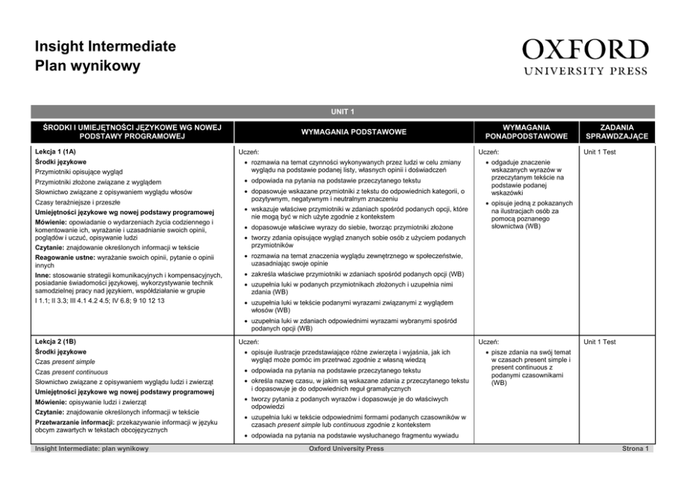 Insight Intermediate Plan wynikowy UNIT 1 ŚRODKI I UMIEJĘTNOŚCI JĘZYKOWE WG NOWEJ PODSTAWY PROGRAMOWEJ Lekcja 1 (1A) WYMAGANIA PODSTAWOWE Uczeń: Uczeń: Przymiotniki opisujące wygląd rozmawia na temat czynności wykonywanych przez ludzi w celu zmiany wyglądu na podstawie podanej listy, własnych opinii i doświadczeń Przymiotniki złożone związane z wyglądem odpowiada na pytania na podstawie przeczytanego tekstu Słownictwo związane z opisywaniem wyglądu włosów dopasowuje wskazane przymiotniki z tekstu do odpowiednich kategorii, o pozytywnym, negatywnym i neutralnym znaczeniu Środki językowe Czasy teraźniejsze i przeszłe Umiejętności językowe wg nowej podstawy programowej Mówienie: opowiadanie o wydarzeniach życia codziennego i komentowanie ich, wyrażanie i uzasadnianie swoich opinii, poglądów i uczuć, opisywanie ludzi Czytanie: znajdowanie określonych informacji w tekście WYMAGANIA PONADPODSTAWOWE wskazuje właściwe przymiotniki w zdaniach spośród podanych opcji, które nie mogą być w nich użyte zgodnie z kontekstem dopasowuje właściwe wyrazy do siebie, tworząc przymiotniki złożone ZADANIA SPRAWDZAJĄCE Unit 1 Test odgaduje znaczenie wskazanych wyrazów w przeczytanym tekście na podstawie podanej wskazówki opisuje jedną z pokazanych na ilustracjach osób za pomocą poznanego słownictwa (WB) tworzy zdania opisujące wygląd znanych sobie osób z użyciem podanych przymiotników Reagowanie ustne: wyrażanie swoich opinii, pytanie o opinii innych Inne: stosowanie strategii komunikacyjnych i kompensacyjnych, posiadanie świadomości językowej, wykorzystywanie technik samodzielnej pracy nad językiem, współdziałanie w grupie rozmawia na temat znaczenia wyglądu zewnętrznego w społeczeństwie, uzasadniając swoje opinie I 1.1; II 3.3; III 4.1 4.2 4.5; IV 6.8; 9 10 12 13 uzupełnia luki w tekście podanymi wyrazami związanymi z wyglądem włosów (WB) zakreśla właściwe przymiotniki w zdaniach spośród podanych opcji (WB) uzupełnia luki w podanych przymiotnikach złożonych i uzupełnia nimi zdania (WB) uzupełnia luki w zdaniach odpowiednimi wyrazami wybranymi spośród podanych opcji (WB) Lekcja 2 (1B) Uczeń: Uczeń: Czas present simple opisuje ilustracje przedstawiające różne zwierzęta i wyjaśnia, jak ich wygląd może pomóc im przetrwać zgodnie z własną wiedzą Czas present continuous odpowiada na pytania na podstawie przeczytanego tekstu Słownictwo związane z opisywaniem wyglądu ludzi i zwierząt Umiejętności językowe wg nowej podstawy programowej określa nazwę czasu, w jakim są wskazane zdania z przeczytanego tekstu i dopasowuje je do odpowiednich reguł gramatycznych Środki językowe Mówienie: opisywanie ludzi i zwierząt Czytanie: znajdowanie określonych informacji w tekście Przetwarzanie informacji: przekazywanie informacji w języku obcym zawartych w tekstach obcojęzycznych Insight Intermediate: plan wynikowy Unit 1 Test pisze zdania na swój temat w czasach present simple i present continuous z podanymi czasownikami (WB) tworzy pytania z podanych wyrazów i dopasowuje je do właściwych odpowiedzi uzupełnia luki w tekście odpowiednimi formami podanych czasowników w czasach present simple lub continuous zgodnie z kontekstem odpowiada na pytania na podstawie wysłuchanego fragmentu wywiadu Oxford University Press Strona 1 Słuchanie: znajdowanie określonych informacji w tekście Inne: stosowanie strategii komunikacyjnych, posiadanie świadomości językowej, wykorzystywanie technik samodzielnej pracy nad językiem, współdziałanie w grupie I 1.1 1.13; II 2.3 3.3; III 4.1; V 8.1; 9 10 12 13 opisuje wybraną osobę z ilustracji przedstawiającej tłum ludzi idących ulicą na podstawie podanych pytań i wskazuje właściwą osobę opisaną przez kolegę/koleżankę określa czas, który powinien być użyty po podanych początkach zdań (WB) dopasowuje właściwe połówki zdań do siebie (WB) uzupełnia luki w dialogu odpowiednimi formami podanych czasowników w czasach present simple lub continuous zgodnie z kontekstem (WB) uzupełnia luki w dialogu odpowiednimi formami podanych czasowników w czasach present simple lub continuous i własnymi pomysłami (WB) Lekcja 3 (1C) Środki językowe Słownictwo związane z wyglądem zewnętrznym człowieka Słownictwo związane z opisem osobowości i charakteru Wyrażenia służące do spekulowania na temat różnych osób Czasowniki modalne Umiejętności językowe wg nowej podstawy programowej Słuchanie: znajdowanie określonych informacji w tekście, określanie głównej myśli tekstu Mówienie: wyrażanie i uzasadnianie swoich opinii i poglądów Reagowanie ustne: aktywne uczestniczenie w rozmowie i dyskusji, proponowanie, odrzucanie i przyjmowanie propozycji i sugestii, wyrażanie swoich opinii ni preferencji, pytanie o opinie i preferencje innych Inne: stosowanie strategii komunikacyjnych i kompensacyjnych, posiadanie świadomości językowej, wykorzystywanie technik samodzielnej pracy nad językiem, współdziałanie w grupie I 1.1; II 2.1 2.3; IV 6.6 6.8; 9 10 12 13 Poziom rozszerzony: IV 6.2 Uczeń: Uczeń: rozmawia na temat znaczenia podanych czynników dla robienia pierwszego wrażenia wskazuje właściwe z podanych czynników na podstawie wysłuchanego wywiadu Unit 1 Test pisze dialog, w którym spekuluje na temat zawartości prezentu (WB) wskazuje zdania prawdziwe i fałszywe na podstawie wysłuchanego wywiadu i poprawia błędy w zdaniach fałszywych dopasowuje podane pary przymiotników do właściwych definicji i wskazuje te o negatywnym znaczeniu uzupełnia luki w zdaniach właściwymi spośród podanych przymiotników zgodnie z kontekstem rozmawia na temat sposobów na zrobienie dobrego pierwszego wrażenia i ustala najlepsze trzy wskazówki wybiera przymiotniki, które mógłby żyć do opisania osób pokazanych na ilustracji i uzasadnia swój wybór wskazuje właściwe osoby spośród pokazanych na ilustracjach na podstawie wysłuchanych