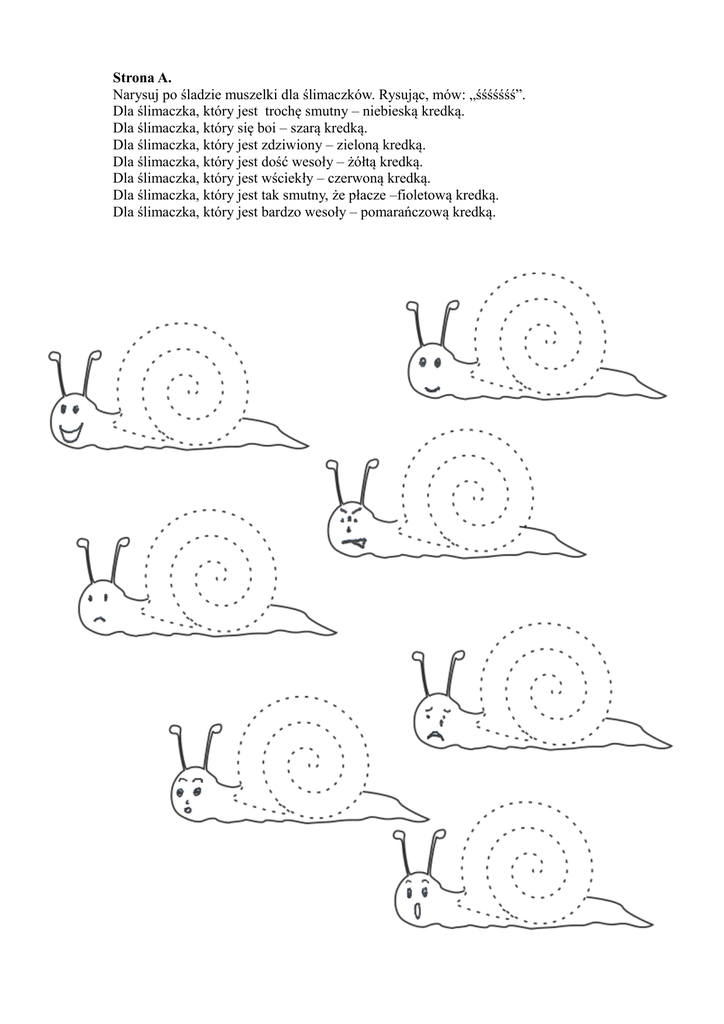 Strona A. Narysuj po śladzie muszelki dla ślimaczków. Rysując, mów: „śśśśśśś”. Dla ślimaczka, który jest trochę smutny – niebieską kredką. Dla ślimaczka, który się boi – szarą kredką. Dla ślimaczka, który jest zdziwiony – zieloną kredką. Dla ślimaczka, który jest dość wesoły – żółtą kredką. Dla ślimaczka, który jest wściekły – czerwoną kredką. Dla ślimaczka, który jest tak smutny, że płacze –fioletową kredką. Dla ślimaczka, który jest bardzo wesoły – pomarańczową kredką. Strona B. Narysuj po linii muszelkę Twojego ślimaczka. Jaki masz dziś nastrój – który z małych ślimaczków czuje się tak jak Ty? Narysuj ślimaczkowi buzię – taką, jaką dziś masz, lub taką, jaką byś chciał mieć. Wytnij swojego ślimaczka i zrób z nim opaskę na czoło. Strona C Elementy do wycięcia ślimaczków do ćwiczeń oddechowych