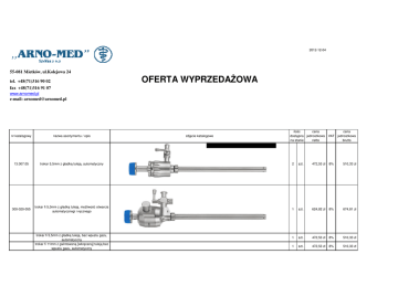 2012-12-04 55-081 Mietków, ul.Kolejowa 24 OFERTA WYPRZEDAśOWA tel. +48(71)316 90 02 fax +48(71)316 91 07 www.arnomed.pl e-mail: [email protected] cena VAT jednostkowa brutto nazwa asortymentu / opis 13.007.05 trokar 5,5mm z gładką tuleją, automatyczny 2 szt. 472,53 zł 8% 510,33 zł 300-020-055 trokar fi 5,0mm z gładką tuleją, moŜliwość otwarcia automatycznegi i ręcznego 1 szt. 624,82 zł 8% 674,81 zł 1 szt. 472,53 zł 8% 510,33 zł 1 szt. 472,53 zł 8% 510,33 zł trokar fi 5,5mm z gładką tuleją, bez wpustu gazu, automatyczny trokar fi 11mm z gwintowaną [wkręcaną] tuleją bez wpustu gazu, automatyczny zdjęcie katalogowe ilośc cena dostępna jednostkowa na stanie netto nr katalogowy 13.050.05 obturator (gwóźdź) fi 5,5mm, dł. 100mm, piramidalny 1 szt. 109,12 zł 8% 117,85 zł 13.050.11 obturator (gwóźdź) fi 11mm, dł. 100mm, piramidalny 3 szt. 72,75 zł 8% 78,57 zł 300-015-011 obturator (gwóźdź) fi 11mm, dł. 100mm, piramidalny 3 szt. 101,83 zł 8% 109,98 zł 300-018-355 obturator (gwóźdź) fi 5,5mm dł. 60mm, ostry 2 szt. 97,18 zł 8% 104,95 zł 12.050.05 obturator (gwóźdź) fi 5,5mm, dł. 100mm, piramidalny 1 szt. 95,00 zł 8% 102,60 zł 12.050.11 obturator (gwóźdź) fi 11mm, dł. 100mm, piramidalny 1 szt. 97,00 zł 8% 104,76 zł 13.060.11 obturator bezpieczny [automatycznie chowane ostrza] fi 11mm z trzema ostrzami tnącymi dł. 100mm 1 szt. 603,70 zł 8% 651,99 zł 13.061.05 obturator bezpeczny [automatycznie chowane ostrze] fi 5,5mm z jednym ostrzem tnącym dł. 100mm - powystawowy 2 szt. 367,50 zł 8% 396,90 zł 16.062.11 obturator bezpieczny typ VERESS fi 11mm, dł. 100mm 1 szt. 317,50 zł 8% 342,90 zł 1 szt. 99,40 zł 8% 107,36 zł 2 szt. 54,83 zł 8% 59,22 zł 1 szt. 43,86 zł 8% 47,37 zł 7 szt. 54,51 zł 8% 58,87 zł 300-216-011 13.032.05 13.032.07 13.032.11 tuleja do trokaru fi 11mm, dł. 150mm, gładka z uszczelką tuleja do trokaru fi 5,5mm dł. 100mm, gładka z uszczelką tuleja do trokaru fi 7,0mm dł. 100mm, gładka z uszczelką tuleja do trokaru fi 11mm dł. 100mm, gładka z uszczelką 13.034.11 tuleja do trokaru fi 11mm dł. 100mm, gwintowana (wkręcana) z uszczelką 4 szt. 71,99 zł 8% 77,75 zł 13.070.11 tuba redukcyjna 11mm - 5,5mm 1 szt. 75,38 zł 8% 81,41 zł 13.076.11 redukcja metalowa 11mm - 5,0mm 1 szt. 123,35 zł 8% 133,22 zł 13.076.12 redukcja metalowa 12,5mm - 5,0mm 1 szt. 123,35 zł 8% 133,22 zł 300-021-010 redukcja metalowa z klipsem zapinanym na trzonie trokara 10mm - 5,0mm 1 szt. 236,43 zł 8% 255,34 zł 300-021-011 redukcja metalowa z klipsem zapinanym na trzonie trokara 11mm - 5,5mm 2 szt. 209,41 zł 8% 226,16 zł 29-00565 redukcja 11/5mm "easy" plastikowa 1 szt. 62,79 zł 8% 67,81 zł 15.000.05 końcówka ssąco-płucząca fi 5 mm dł. 330mm 1 szt. 95,83 zł 8% 103,50 zł 15.000.10 końcówka ssąco-płucząca fi 10mm dł. 330mm 1 szt. 101,55 zł 8% 109,67 zł 15.010.10 końcówka ssąco-płucząca fi 10mm, dł.330mm z końcówką typ LUER LOCK 1 szt. 360,28 zł 8% 389,10 zł 15.004.00 uchwyt ssąco-płuczący dwydroŜny 1 szt. 438,38 zł 8% 473,45 zł 15.006.00 uchwyt ssąco - płuczący z suwakiem regulującym przepływ 2 szt. 551,25 zł 8% 595,35 zł 16.003.33 elektroda monopolarna - haczyk 90 stopni fi 5mm, dł. 330mm z końcówką LUER LOCK 3 szt. 81,20 zł 8% 87,69 zł 16.027.33 elektroda monopolarna - haczyk 45 stopni fi 5mm, dł. 330mm 2 szt. 74,97 zł 8% 80,97 zł 16.023.33 elektroda monopolarna - haczyk 90 stopni fi 5mm, dł. 330mm 2 szt. 117,66 zł 8% 127,08 zł 19.20 rączka metalowa 1 szt. 191,10 zł 8% 206,39 zł 19.22 rączka metalowa z zamkiem 1 szt. 170,10 zł 8% 183,71 zł 19.240 rączka węglowa z przyłęczem do HF 6 szt. 202,02 zł 8% 218,18 zł 300-750-001 rączka węglowa z przyłęczem do HF 1 szt. 616,05 zł 8% 665,33 zł 19.260 rączka węglowa z przyłęczem do HF wraz z zamkiem 2 szt. 253,47 zł 8% 273,75 zł 19.22/33 rączka metalowa ze spręŜyną 1 szt. 170,10 zł 8% 183,71 zł 19.52/33 metalowy szaft fi 10mm dł. 33cm 1 szt. 89,96 zł 8% 97,16 zł 19.60/22 metalowy szaf, izolowany fi 5,0mm dł. 22cm 2 szt. 76,17 zł 8% 82,26 zł 19.61/33 metalowy szaft, izolowany fi 10mm - 5mm (zwęŜający się od 10mm do 5mm) dł. 33cm 3 szt. 118,13 zł 8% 127,58 zł 19.62/33 metalowy szaf, izolowany fi 10mm dł. 33cm 1 szt. 22,62 zł 8% 24,43 zł 19.60.33 metalowy szaf, izolowany fi 5,0mm dł. 33cm 9 szt. 103,43 zł 8% 111,70 zł 19.80/5 nakrętki na szaft fi 5,0mm 8 014.33 wkład roboczy - długi grasper atraumatyczny fi 5mm, dł. 33cm 5 016.33 wkład roboczy - długi, wypukły grasper atraumatyczny fi 5mm, dł. 33cm 1 018.33 wkład roboczy - grasper z okienkiem fi 5mm, dł. 33cm 1 024.33 wkład roboczy - disektor MICRO-MARYLAND fi 5mm, dł. 33cm 2 092.33 wkład roboczy - grasper z zabkami (micro) fi 5mm, dł. 33cm 094.33 wkład roboczy - graster tzw. "ZĄB SZCZURA" fi 5mm, dł. 33cm szt. 52,50 zł 8% 56,70 zł 264,06 zł 8% 285,19 zł 268,80 zł 8% 290,30 zł 303,64 zł 8% 327,93 zł szt. 268,80 zł 8% 290,30 zł 1 szt. 294,00 zł 8% 317,52 zł 1 szt. 299,25 zł 8% 323,19 zł szt. 096.33 wkład roboczy - grasper 1x2 ząnki, jedno ramię ruchome fi 5mm, dł. 33cm 4 szt. 299,25 zł 8% 323,19 zł 156.33 wkład roboczy - grasper BABCOCK fi 10mm, dł. 33cm 1 szt. 299,25 zł 8% 323,19 zł 200.33 wkład roboczy - mikronoŜyczki, proste, końce ostre, jedno ramię ruchome fi 5mm, dł. 33cm 1 szt. 522,34 zł 8% 564,13 zł 210.33 wkład roboczy - noŜyczki METZENBAUM zakrzywione, kóńce tępe fi 5mm, dł. 33cm 2 szt. 106,92 zł 8% 115,48 zł 214.33 wkład roboczy - noŜyczki ENDO, zakrzyione, kóńce tępe fi 5mm, dł. 33cm 1 szt. 111,06 zł 8% 119,94 zł 218.33 wkład roboczy - noŜyczki METZENBAUM, zakrzywione, z grubymi ostrzami fi 5mm, dł. 33cm 3 szt. 112,00 zł 8% 120,96 zł 300-400-067 wkład roboczy - noŜyczki METZENBAUM, zakrzywione, końce tępe dł. ostrzy 12mm fi 5mm, dł. 33cm 1 szt. 401,59 zł 8% 433,72 zł 25.300.33 igłotrzymacz EASY-KNOT fi 5mm, dł. 330mm z kanałem płuczącym 2 szt
