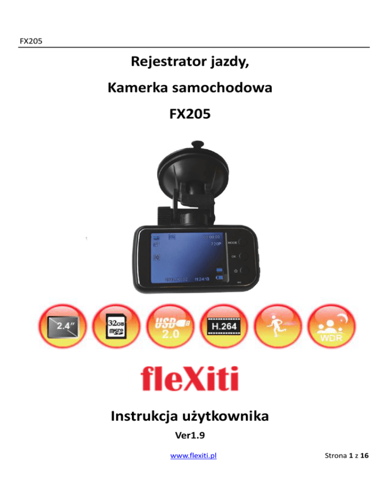FX205 Rejestrator jazdy, Kamerka samochodowa FX205 Instrukcja użytkownika Ver1.9 www.flexiti.pl Strona 1 z 16 FX205 Wstęp Cyfrowa kamera FX205 HD (wysokiej rozdzielczości) jest wykonana z wykorzystaniem najnowszych technologii. Może służyć zarówno, jako kamera HD, kamera internetowa jak również jako profesjonalna kamerka samochodowa. Kamerka samochodowa (rejestrator jazdy) nagrywa w rozdzielczości do 1920x1080P, a zdjęcia są wykonywanie z rozdzielczością do 3 mega pikseli. Używając karty SDHC jako pamięci do przechowywania nagrań, przy równoczesnym małym poborze energii, kamera HD może nagrywać obraz wideo, audio i robić zdjęcia, po czym zapisywać je na karcie pamięci.. Wideo może być sprawdzane bezpośrednio na wyświetlaczu, a oglądane na ekranie telewizora podłączonego za pomocą kabla HDMI, lub oglądane i kopiowane za pomocą komputera. Kamerka nagrywa bardzo wyrazisty i doskonały obraz , jeden z najładniejszych w tej klasie urządzeń. FX205 również lepiej nagrywa nocą i o zmierzchu niż urządzenia zaopatrzone w diody doświetlające LED. Uwaga: Kamerka nie jest produktem wodoodpornym, wobec czego powinna być instalowana i użytkowana tylko i wyłącznie wewnątrz samochodu lub w pomieszczeniu. www.flexiti.pl Strona 2 z 16 FX205 Zawartość opakowania kamerka FX205 Przykładowy montaż rejestratora FX205 w samochodzie www.flexiti.pl Strona 3 z 16 FX205 1. Szybki start i. Wyłącz silnik samochodu lub odłącz kamerę od zasilania. ii. Włóż kartę MicroSD w slot. [Uwaga] Wymagana karty MicroSD klasa 6 lub wyższa, i o pojemności nie mniejszej niż 1 GB. Urządzenie obsługuje karty MicroSD o pojemności 32GB maksymalnie. [Uwaga] Należy dobrze umyć szybę samochodu nim przylepisz uchwyt. Zabrudzona I wilgotna szyba może powodować że uchwyt będzie się odklejał. iii. Podłącz kamerę na stałe do instalacji 12V lub do gniazda zapalniczki. [Uwaga] Kabel zasilający USB nie powinien zwisać na przedniej szybie samochodu. Kamera wymaga zasialnia 5V, w kablu zapalniczki nastepuje zamiana napięcia z 12V na 5V iv. Zależnie od potrzeb wyreguluj ustawienie kamery. v. Uruchom silnik. Jeżeli kamera jest ustawiona I zainstalowana prawidłowo (domyślnie jest), kamera automatycznie wejdzie w tryb nagrywania w momencie uruchomienia silnika. Sprawdź na ekranie LCD obraz, dostosuj również ustawienia dostępne w Menu urządzenia. Przydatne informacje Aby nagrania z kamerki były prawidłowe i bez zacięć należy zastosować dobrej jakości kartę MicroSD, o dużej prędkości zapisu. Czytaj więcej tu... Dobrze zaprogramowana kamerka samochodowa po uruchomieniu samochodu zaczyna automatycznie rejestrację, a kończy kilkanaście sekund po wyłączeniu silnika (nie wymaga ingerencji) Uaktywnienie opcji wykrywania ruchu może spowodować nieciągłość nagrania, gdyż kamerka nagrywać będzie tylko w przypadku wykrycia ruchu. Tryb ten pozwala oszczędzać miejsce na karcie MicroSD, jednakże nie zapewnia ciągłości. Kamera automatycznie nagrywa wszystkie nagranie w trybie cyklicznym. Oznacza to że w przypadku braku wolnego miejsca kasowane będą najstarsze nagrania, a w ich miejsce nagrywane nowe. Kamera zaopatrzona jest również w detekcję niskiego napięcia baterii, i w razie wykrycia takiej sytuacji automatycznie kończy zapis. Umiejscowienie kamerki za lusterkiem powoduje że kamerka nie przeszkadza kierowcy w czasie jazdy, a równocześnie doskonale nagrywa. Nie każdy obszar okna samochodu jest wycierany wycieraczką, należy na to zwrócić uwagę w czasie montażu. Szyba samochodu, szczególnie przyciemniana może powodować refleksy i odbicia deski rozdzielczej, dlatego należy starać się umieścić obiektyw kamery jak najbliżej szyby samochodu. Doświetlenie nocne, czy też nazywane inaczej "night vision" jest tylko elementem marketingu Chińskich producentów. Zakres takiego doświetlenia zamyka się w obszarze do 1 metra (a czasami dużo mniej) i jego funkcjonalność jest znikoma. Nie są nam znane kamerki samochodowe które rzeczywiście "widzą" w nocy (kamery noktowizyjne to potrafią, jest to jednak zupełnie inna półka cenowa).Jakość obrazu nocą zależeć będzie głównie od oświetlenia zewnętrznego np. lampy uliczne, reflektory samochodów. Kamera FX205 pomimo braku diod doświetlających nagrywa lepiej o zmierzchu i przy słabym oświetleniu niż kamery zaopatrzone w diody LED. www.flexiti.pl Strona 4 z 16 FX205 Cechy rejestratora: Szerokokątny obiektyw o kącie widzenia 120 stopni. Zaawansowana technologia WDR, polepszona jakość nagrań również o zmierzchu (nie wymaga diod doświetlających) Rozdzielczość: 1920×1080P FULL HD , doskonały obraz Zaawansowany kodek kompresji H.264 Aparat, zdjęcia w rozdzielczości 4X zoom cyfrowy, ostrość od 12cm do nieskończoności. 2,4 calowy wyświetlacz LCD, podgląd w czasie nagrywania. Złącze HDMI. 4 rodzajów jakości nagrywanego materiału wideo. płynny obraz wideo 30/ 60 ramek na sekundę Specjalny, przegubowy samochodowy uchwyt mocujący do szyby. G-sensor do zabezpieczenia nagrań w razie kolizji Zabezpieczenie nagrań, nawet w przypadku nagłego wypadku nagrania wideo są 3 mega pikseli. zabezpieczone. Spójność nagrań wideo (brak przerw w nagraniach). Zasilanie bezpośrednio z gniazdka zapalniczki, szybkie podłączenie I nagrywanie w czasie jazdy. Automatyczne uruchamianie nagrywania w momencie uruchomienia silnika (również automatyczne wyłączanie po jego wyłączenia) Nagrywanie w pętli, z możliwością ustawienia długości fragmentów wideo. Możliwość sprawdzania nagranego wideo. Nagrywanie daty i czasu na nagranym materiale wideo. Ustawiany czas nagrywanych sekwencji wideo. Funkcja zdjęć Ładowanie akumulatorka poprzez złącze USB. Nagrywania na karcie MicroSD min Class 6, o pojemności do 32GB. www.flexiti.pl Strona 5 z 16 FX205 Opis przycisków i złączy Funkcje przycisków Przycisk MODE (tryb pracy): W czasie oczekiwania prz