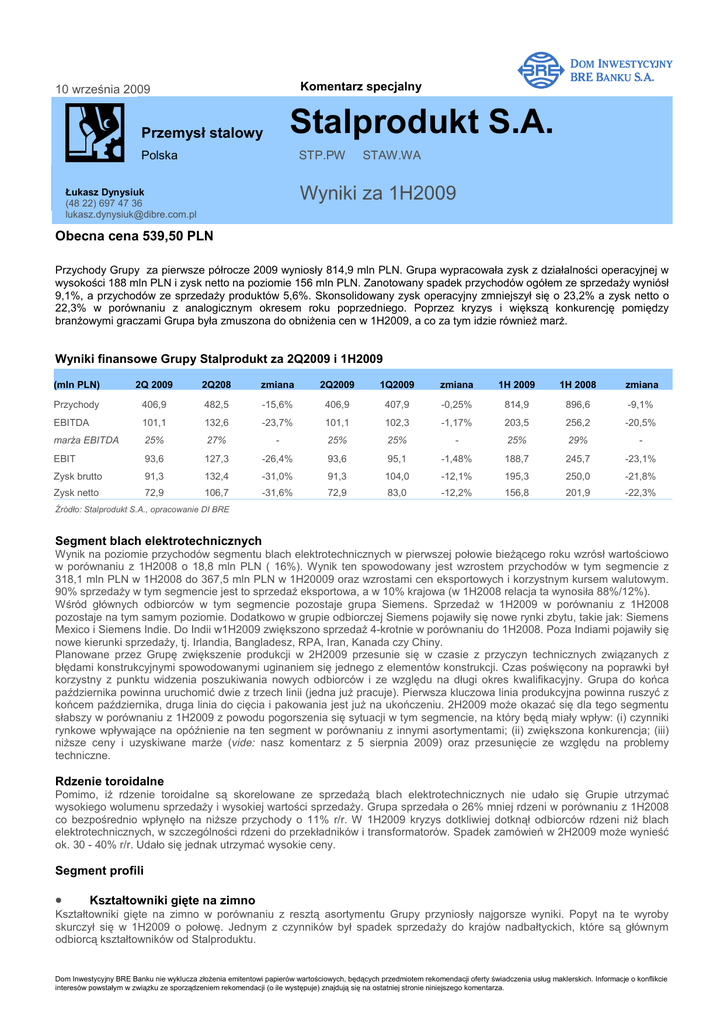 Komentarz specjalny BRE Bank Securities BRE Bank Securities Komentarz specjalny 10 września 2009 Stalprodukt S.A. Przemysł stalowy Polska STP.PW STAW.WA Wyniki za 1H2009 Łukasz Dynysiuk (48 22) 697 47 36 [email protected] Obecna cena 539,50 PLN Przychody Grupy za pierwsze półrocze 2009 wyniosły 814,9 mln PLN. Grupa wypracowała zysk z działalności operacyjnej w wysokości 188 mln PLN i zysk netto na poziomie 156 mln PLN. Zanotowany spadek przychodów ogółem ze sprzedaży wyniósł 9,1%, a przychodów ze sprzedaży produktów 5,6%. Skonsolidowany zysk operacyjny zmniejszył się o 23,2% a zysk netto o 22,3% w porównaniu z analogicznym okresem roku poprzedniego. Poprzez kryzys i większą konkurencję pomiędzy branżowymi graczami Grupa była zmuszona do obniżenia cen w 1H2009, a co za tym idzie również marż. Wyniki finansowe Grupy Stalprodukt za 2Q2009 i 1H2009 (mln PLN) 2Q 2009 2Q208 zmiana 2Q2009 1Q2009 zmiana 1H 2009 1H 2008 zmiana Przychody 406,9 482,5 -15,6% 406,9 407,9 -0,25% 814,9 896,6 -9,1% EBITDA 101,1 132,6 -23,7% 101,1 102,3 -1,17% 203,5 256,2 -20,5% marża EBITDA 25% 27% - 25% 25% - 25% 29% - EBIT 93,6 127,3 -26,4% 93,6 95,1 -1,48% 188,7 245,7 -23,1% Zysk brutto 91,3 132,4 -31,0% 91,3 104,0 -12,1% 195,3 250,0 -21,8% Zysk netto 72,9 106,7 -31,6% 72,9 83,0 -12,2% 156,8 201,9 -22,3% Źródło: Stalprodukt S.A., opracowanie DI BRE Segment blach elektrotechnicznych Wynik na poziomie przychodów segmentu blach elektrotechnicznych w pierwszej połowie bieżącego roku wzrósł wartościowo w porównaniu z 1H2008 o 18,8 mln PLN ( 16%). Wynik ten spowodowany jest wzrostem przychodów w tym segmencie z 318,1 mln PLN w 1H2008 do 367,5 mln PLN w 1H20009 oraz wzrostami cen eksportowych i korzystnym kursem walutowym. 90% sprzedaży w tym segmencie jest to sprzedaż eksportowa, a w 10% krajowa (w 1H2008 relacja ta wynosiła 88%/12%). Wśród głównych odbiorców w tym segmencie pozostaje grupa Siemens. Sprzedaż w 1H2009 w porównaniu z 1H2008 pozostaje na tym samym poziomie. Dodatkowo w grupie odbiorczej Siemens pojawiły się nowe rynki zbytu, takie jak: Siemens Mexico i Siemens Indie. Do Indii w1H2009 zwiększono sprzedaż 4-krotnie w porównaniu do 1H2008. Poza Indiami pojawiły się nowe kierunki sprzedaży, tj. Irlandia, Bangladesz, RPA, Iran, Kanada czy Chiny. Planowane przez Grupę zwiększenie produkcji w 2H2009 przesunie się w czasie z przyczyn technicznych związanych z błędami konstrukcyjnymi spowodowanymi uginaniem się jednego z elementów konstrukcji. Czas poświęcony na poprawki był korzystny z punktu widzenia poszukiwania nowych odbiorców i ze względu na długi okres kwalifikacyjny. Grupa do końca października powinna uruchomić dwie z trzech linii (jedna już pracuje). Pierwsza kluczowa linia produkcyjna powinna ruszyć z końcem października, druga linia do cięcia i pakowania jest już na ukończeniu. 2H2009 może okazać się dla tego segmentu słabszy w porównaniu z 1H2009 z powodu pogorszenia się sytuacji w tym segmencie, na który będą miały wpływ: (i) czynniki rynkowe wpływające na opóźnienie na ten segment w porównaniu z innymi asortymentami; (ii) zwiększona konkurencja; (iii) niższe ceny i uzyskiwane marże (vide: nasz komentarz z 5 sierpnia 2009) oraz przesunięcie ze względu na problemy techniczne. Rdzenie toroidalne Pomimo, iż rdzenie toroidalne są skorelowane ze sprzedażą blach elektrotechnicznych nie udało się Grupie utrzymać wysokiego wolumenu sprzedaży i wysokiej wartości sprzedaży. Grupa sprzedała o 26% mniej rdzeni w porównaniu z 1H2008 co bezpośrednio wpłynęło na niższe przychody o 11% r/r. W 1H2009 kryzys dotkliwiej dotknął odbiorców rdzeni niż blach elektrotechnicznych, w szczególności rdzeni do przekładników i transformatorów. Spadek zamówień w 2H2009 może wynieść ok. 30 - 40% r/r. Udało się jednak utrzymać wysokie ceny. Segment profili • Kształtowniki gięte na zimno Kształtowniki gięte na zimno w porównaniu z resztą asortymentu Grupy przyniosły najgorsze wyniki. Popyt na te wyroby skurczył się w 1H2009 o połowę. Jednym z czynników był spadek sprzedaży do krajów nadbałtyckich, które są głównym odbiorcą kształtowników od Stalproduktu. Dom Inwestycyjny2009 BRE Banku nie wyklucza złożenia emitentowi papierów wartościowych, będących przedmiotem rekomendacji oferty świadczenia usług maklerskich. Informacje o konflikcie 10 września interesów powstałym w związku ze sporządzeniem rekomendacji (o ile występuje) znajdują się na ostatniej stronie niniejszego komentarza. Komentarz specjalny BRE Bank Securities • Produkty z Centrum Serwisowego W 1H2009 Grupa zanotowała spadek wolumenów (6,3% vs 1H2008) i wartości (24% vs 1H2008) sprzedaży produktów oferowanych z centrum serwisowego. • Ochronne bariery drogowe Pierwsze sześć miesięcy bieżącego roku przyniosły Grupie dobre wyniki w zakresie sprzedaży ochronnych barier drogowych. W porównaniu do analogicznego okresu roku poprzedniego wzrost wolumenów sprzedaży i wartości wyniósł prawie 30%. Tak znaczny wzrost w warunkach branżowej dekoniunktury wynikał z realizacji umów długoterminowych zawartych jeszcze w roku 2008. Finalizowane były, np. umowy dotyczące autostrady A-4 (odcinek Zgorzelec - Wykroty i odcinek Wielicka - Szarów oraz autostrady A-1 (odcinek Sośnica - Bełk). Struktura sprzedaży tego asortymentu uległa zmianie zwiększając udział eksportu, który obecnie stanowi 18% przychodów ze sprzedaży (1H2008 wynosił ok. 10%). Grupa planuje jeszcze bardziej zintensyfikować sprzedaż na zagranicznych rynkach. W 2H2009 uważamy, że ze względu na spadek cen surowców można spodziewać się spadku średniej ceny sprzedaży w związku z realizacją kolejnych kontraktów podpisanych w 2009 roku. Dane dotyczące segmentów operacyjnych z 1H2009 (lewy) i 1H2008 (prawy) 400 500 367,5 434,5 450 335,7 325,4 350 400 363,1 300 250 m ln P LN m ln PLN 350 201,1 200 166,3 150 3