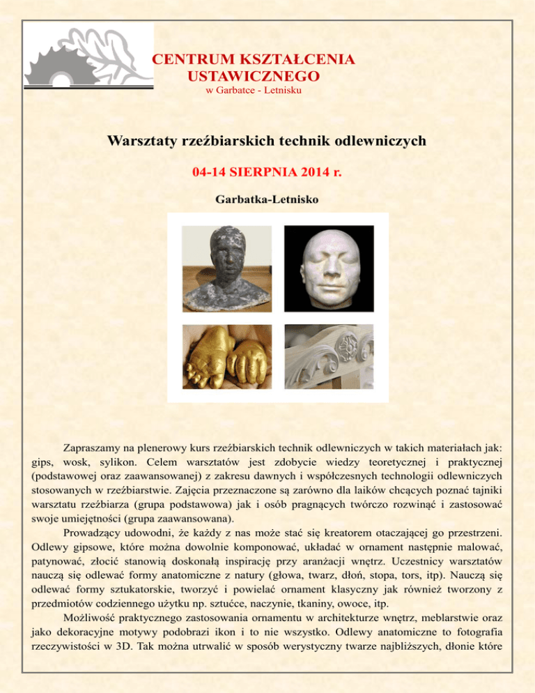CENTRUM KSZTAŁCENIA USTAWICZNEGO w Garbatce - Letnisku Warsztaty rzeźbiarskich technik odlewniczych 04-14 SIERPNIA 2014 r. Garbatka-Letnisko Zapraszamy na plenerowy kurs rzeźbiarskich technik odlewniczych w takich materiałach jak: gips, wosk, sylikon. Celem warsztatów jest zdobycie wiedzy teoretycznej i praktycznej (podstawowej oraz zaawansowanej) z zakresu dawnych i współczesnych technologii odlewniczych stosowanych w rzeźbiarstwie. Zajęcia przeznaczone są zarówno dla laików chcących poznać tajniki warsztatu rzeźbiarza (grupa podstawowa) jak i osób pragnących twórczo rozwinąć i zastosować swoje umiejętności (grupa zaawansowana). Prowadzący udowodni, że każdy z nas może stać się kreatorem otaczającej go przestrzeni. Odlewy gipsowe, które można dowolnie komponować, układać w ornament następnie malować, patynować, złocić stanowią doskonałą inspirację przy aranżacji wnętrz. Uczestnicy warsztatów nauczą się odlewać formy anatomiczne z natury (głowa, twarz, dłoń, stopa, tors, itp). Nauczą się odlewać formy sztukatorskie, tworzyć i powielać ornament klasyczny jak również tworzony z przedmiotów codziennego użytku np. sztućce, naczynie, tkaniny, owoce, itp. Możliwość praktycznego zastosowania ornamentu w architekturze wnętrz, meblarstwie oraz jako dekoracyjne motywy podobrazi ikon i to nie wszystko. Odlewy anatomiczne to fotografia rzeczywistości w 3D. Tak można utrwalić w sposób werystyczny twarze najbliższych, dłonie które kochamy. Być może tak realizuje się odwieczne marzenie człowieka o zatrzymaniu czasu. Uczestnicy zdobędą niezbędne wiadomości i umiejętności potrzebne w dalszej samodzielnej działalności artystycznej – metody, technologie, niepublikowane tajniki warsztatu. Organizatorzy zapewniają wszystkie potrzebne materiały oraz zestaw narzędzi z pracowni Artysty jak również miłą atmosferę podczas warsztatów oraz pełną ciekawych miejsc okolicę. Uczestnicy powinni posiadać: ubranie robocze, (przewiewne i cieplejsze – zależnie od pogody), rękawice ochronne (ogrodnicze-gumowe), krem ochronny do twarzy i rąk i dobry humor. Liczba miejsc na warsztatach: 12 (grupa minimalna 8 osób) Pełny koszt (uczestnictwo, noclegi i wyżywienie): ok. 1250 zł. – koszt uzależniony jest od ilości osób i może się wahać w granicach 5-10%. Podczas warsztatów można korzystać z całej oferty lub oddzielnie: ►Koszt udziału w zajęciach – ok. 700 zł/os. ►Koszt całodziennego wyżywienia – ok. (35zł/os) (obiad - 20, śniad.- 8, kol.- 7) zł. ►Koszt zakwaterowania w Schronisku – ok. 20 zł. doba/os. Uwaga W przypadku grupy mniejszej niż 8 osób kurs może się rozpocząć, ale na nowych uzgodnionych wspólnie z zainteresowanymi warunkach. Decyzja o rozpoczęciu kursu podana będzie najpóźniej do 15 czerwca 2014r. Chętni do wzięcia udziału w kursie proszeni są o pobranie i wypełnienie formularza zgłoszeniowego i przesłania go e-mailem na adres: [email protected] Formularz zgłoszeniowy można pobrać ze strony: www.drzewna.com - zakładka CKU - Kursy letnie 2014 lub pisząc na mail: [email protected] Po otrzymaniu maila potwierdzającego przyjęcie zgłoszenia, kandydaci będą poproszeni o dokonanie wpłaty 600 zł na podane konto. Pozostała część kwoty będzie rozliczona na pierwszych zajęciach. KONTO KURSU: BS. Zwoleń o/Garbatka: 32 9157 0002 0040 0403 6025 0001 z dopiskiem „RZEŹBA I ODLEW” Organizatorzy zapewniają zakwaterowanie w Schronisku Młodzieżowym Zespołu Szkół Ponadgimnazjalnych (pokoje 24 osobowe, wspólna łazienka). Istnieje możliwość noclegów o lepszym standardzie w kwaterach prywatnych na terenie Garbatki. Szczegółowych informacji udzielamy na prośbę zainteresowanych. Zajęcia odbędą się w Warsztatach Zespołu Szkół Ponadgimnazjalnych w Garbatce-Letnisko, ul. H. Lewandowicz 4; 26-930 Garbatka Letnisko. Rozpoczną się 04 VIII (poniedziałek) o godz. 11.00 i zakończą 14 VII (czwartek) obiadem. Warsztaty poprowadzi: Adam Gugała