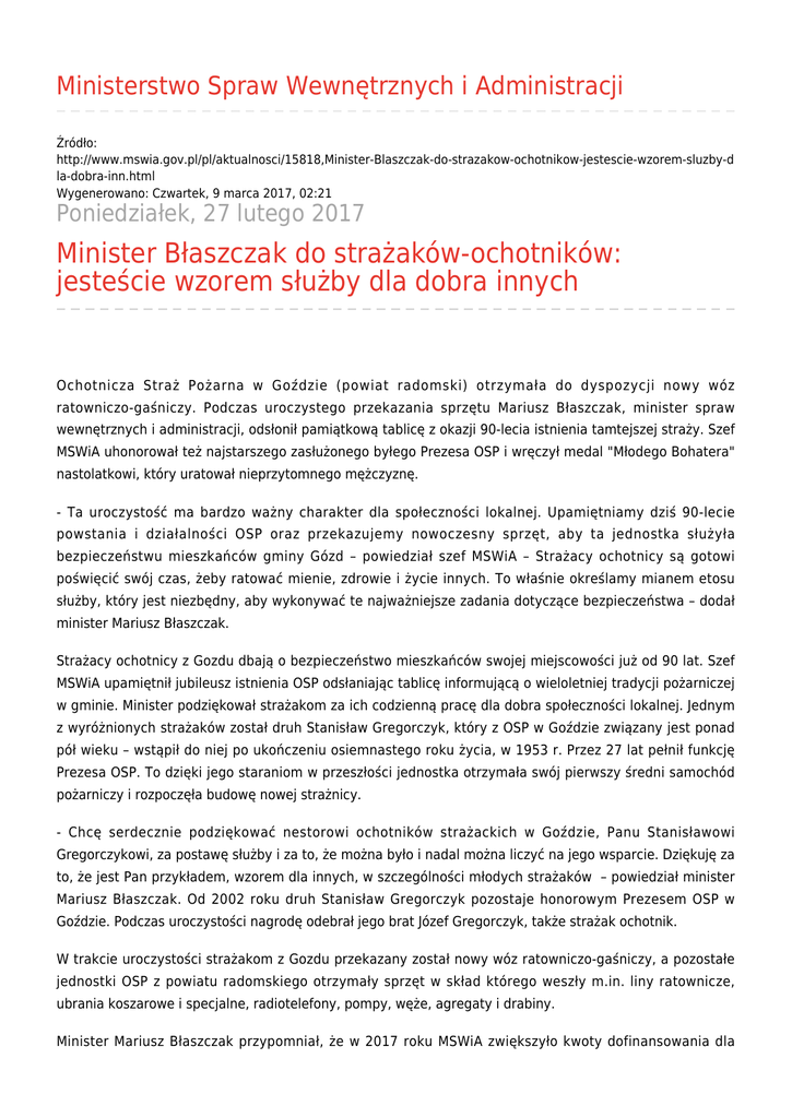 Ministerstwo Spraw Wewnętrznych i Administracji Źródło: http://www.mswia.gov.pl/pl/aktualnosci/15818,Minister-Blaszczak-do-strazakow-ochotnikow-jestescie-wzorem-sluzby-d la-dobra-inn.html Wygenerowano: Czwartek, 9 marca 2017, 02:21 Poniedziałek, 27 lutego 2017 Minister Błaszczak do strażaków-ochotników: jesteście wzorem służby dla dobra innych Ochotnicza Straż Pożarna w Goździe (powiat radomski) otrzymała do dyspozycji nowy wóz ratowniczo-gaśniczy. Podczas uroczystego przekazania sprzętu Mariusz Błaszczak, minister spraw wewnętrznych i administracji, odsłonił pamiątkową tablicę z okazji 90-lecia istnienia tamtejszej straży. Szef MSWiA uhonorował też najstarszego zasłużonego byłego Prezesa OSP i wręczył medal "Młodego Bohatera" nastolatkowi, który uratował nieprzytomnego mężczyznę. - Ta uroczystość ma bardzo ważny charakter dla społeczności lokalnej. Upamiętniamy dziś 90-lecie powstania i działalności OSP oraz przekazujemy nowoczesny sprzęt, aby ta jednostka służyła bezpieczeństwu mieszkańców gminy Gózd – powiedział szef MSWiA – Strażacy ochotnicy są gotowi poświęcić swój czas, żeby ratować mienie, zdrowie i życie innych. To właśnie określamy mianem etosu służby, który jest niezbędny, aby wykonywać te najważniejsze zadania dotyczące bezpieczeństwa – dodał minister Mariusz Błaszczak. Strażacy ochotnicy z Gozdu dbają o bezpieczeństwo mieszkańców swojej miejscowości już od 90 lat. Szef MSWiA upamiętnił jubileusz istnienia OSP odsłaniając tablicę informującą o wieloletniej tradycji pożarniczej w gminie. Minister podziękował strażakom za ich codzienną pracę dla dobra społeczności lokalnej. Jednym z wyróżnionych strażaków został druh Stanisław Gregorczyk, który z OSP w Goździe związany jest ponad pół wieku – wstąpił do niej po ukończeniu osiemnastego roku życia, w 1953 r. Przez 27 lat pełnił funkcję Prezesa OSP. To dzięki jego staraniom w przeszłości jednostka otrzymała swój pierwszy średni samochód pożarniczy i rozpoczęła budowę nowej strażnicy. - Chcę serdecznie podziękować nestorowi ochotników strażackich w Goździe, Panu Stanisławowi Gregorczykowi, za postawę służby i za to, że można było i nadal można liczyć na jego wsparcie. Dziękuję za to, że jest Pan przykładem, wzorem dla innych, w szczególności młodych strażaków – powiedział minister Mariusz Błaszczak. Od 2002 roku druh Stanisław Gregorczyk pozostaje honorowym Prezesem OSP w Goździe. Podczas uroczystości nagrodę odebrał jego brat Józef Gregorczyk, także strażak ochotnik. W trakcie uroczystości strażakom z Gozdu przekazany został nowy wóz ratowniczo-gaśniczy, a pozostałe jednostki OSP z powiatu radomskiego otrzymały sprzęt w skład którego weszły m.in. liny ratownicze, ubrania koszarowe i specjalne, radiotelefony, pompy, węże, agregaty i drabiny. Minister Mariusz Błaszczak przypomniał, że w 2017 roku MSWiA zwiększyło kwoty dofinansowania dla Ochotniczych Straży Pożarnych. - Udowodniliśmy, że można gospodarować środkami publicznymi w sposób rzetelny. W odróżnieniu do naszych poprzedników potrafimy wygospodarować niezbędne pieniądze po to, aby było bezpiecznie i aby ci, którzy są za bezpieczeństwo odpowiedzialni mieli do tego odpowiedni sprzęt i środki - powiedział szef MSWiA. W 2016 roku na rzecz tych OSP, które nie należą do Krajowego Systemu Ratowniczo-Gaśniczego przekazana została kwota 36 mln zł, natomiast w 2017 roku aż 43 mln zł, czyli o 7 mln zł więcej. Dodatkowe środki otrzymały też te jednostki OSP, które są elementem Krajowego Systemu Ratowniczo-Gaśniczego. W 2015 i 2016 r. MSWiA przekazało im po 73 mln zł dotacji. W 2017 r., kwota ta wzrosła o ponad 8,1 mln zł do poziomu 81,1 mln złotych. Przekazanie wozu strażackiego jednostce OSP Gózd Przekazanie wozu strażackiego jednostce OSP Gózd Przekazanie wozu strażackiego jednostce OSP Gózd Przekazanie wozu strażackiego jednostce OSP Gózd Przekazanie wozu strażackiego jednostce OSP Gózd Przekazanie wozu strażackiego jednostce OSP Gózd