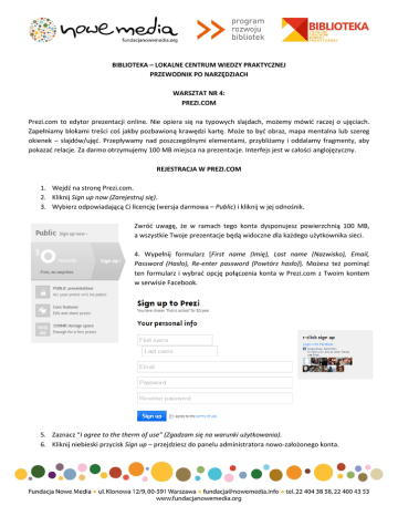 BIBLIOTEKA – LOKALNE CENTRUM WIEDZY PRAKTYCZNEJ PRZEWODNIK PO NARZĘDZIACH WARSZTAT NR 4: PREZI.COM Prezi.com to edytor prezentacji online. Nie opiera się na typowych slajdach, możemy mówić raczej o ujęciach. Zapełniamy blokami treści coś jakby pozbawioną krawędzi kartę. Może to być obraz, mapa mentalna lub szereg okienek – slajdów/ujęć. Przepływamy nad poszczególnymi elementami, przybliżamy i oddalamy fragmenty, aby pokazać relacje. Za darmo otrzymujemy 100 MB miejsca na prezentacje. Interfejs jest w całości anglojęzyczny. REJESTRACJA W PREZI.COM 1. Wejdź na stronę Prezi.com. 2. Kliknij Sign up now (Zarejestruj się). 3. Wybierz odpowiadającą Ci licencję (wersja darmowa – Public) i kliknij w jej odnośnik. Zwróć uwagę, że w ramach tego konta dysponujesz powierzchnią 100 MB, a wszystkie Twoje prezentacje będą widoczne dla każdego użytkownika sieci. 4. Wypełnij formularz [First name (Imię), Last name (Nazwisko), Email, Password (Hasło), Re-enter password (Powtórz hasło)]. Możesz też pominąć ten formularz i wybrać opcję połączenia konta w Prezi.com z Twoim kontem w serwisie Facebook. 5. Zaznacz “I agree to the therm of use” (Zgadzam się na warunki użytkowania). 6. Kliknij niebieski przycisk Sign up – przejdziesz do panelu administratora nowo-założonego konta. 7. Po zalogowaniu się na swoje konto możesz ustawić subdomenę, pod jaką będą publikowane Twoje prezentacje. To ostatni człon adresu widocznego w przeglądarce, np. www.prezi.com/user/twojanazwa. Aby to zrobić, kliknij w odnośnik Customize public profile (Ustaw profil publiczny) lub kliknij w nazwę Twojego konta widoczną w prawym górnym rogu, a dalej odnośnik Settings & Account (Ustawienia i konto). Edytowalne pole subdomeny znajdziesz po przewinięciu strony w dół. FUNKCJONALNOŚCI PREZI.COM – KROK PO KROKU 1. Po zalogowaniu się na konto (w przyszłości), kliknij w zakładkę Your prezis (Twoje prezentacje). Na początku nie znajdziesz w niej żadnej prezentacji, ale z czasem zapewne ich przybędzie. W tym miejscu znajdziesz się automatycznie z chwilą założenia konta. Aby rozpocząć prace nad nową prezentacją kliknij przycisk New prezi (Nowe prezi). 2. Następnie wybierz jeden z dostępnych szablonów prezentacji. To gotowe wzorce, sformatowane pod konkretne rodzaje tematycznych prezentacji – wybierz ten, który najlepiej odpowiada Twojej wizji. Zawsze zresztą będziesz mógł / mogła go zmodyfikować. Prezi oferuje obecnie 58 szablonów. Najprostszy z nich (pierwszy) to po prostu czysta karta. Po dokonaniu wyboru kliknij przycisk Choose (Wybierz). 3. Przyjrzyjmy się temu, jak zorganizowany jest pulpit roboczy. U góry ekranu poziomo rozmieszczone są ikony głównego menu. Pierwsza ikona Present (Zaprezentuj) pozwala na natychmiastowe przejście z trybu edycji do trybu prezentacji, po to aby np. na bieżąco podejrzeć efekty naszej pracy. Obok niej znajdują się strzałki cofnij / ponów, do cofania lub ponawiania ostatnio wykonanych operacji. Dalej znajduje się ikona dyskietki – kliknij w nią zawsze, gdy chcesz zachować swoją pracę. Na szczęście Prezi.com automatycznie zachowuje to, co robisz, a więc ryzyko, że stracisz swoją pracę jest bardzo małe. Obok dyskietki znajduje się zresztą informacja o dokładnej godzinie, gdy program po raz ostatni zachował Twoją pracę (lub zrobiłeś/aś to sam). Przyjrzyjmy się bliżej kolejnym pozycjom menu – w kilku blokach zebrane są narzędzia, z których skorzystasz w toku pracy w Prezi.com. Frames & Arrows (Ramki i strzałki) Jak się dalej przekonasz ramka to jeden z kluczowych elementów Prezi. To nią obejmujesz obszar, który odpowiada rozmiarowi prezentowanego slajdu. Innymi słowy tylko to, co obejmiesz ramką znajdzie się w danym ujęciu / slajdzie. Mamy kilka rodzajów ramek – różnią się wyłącznie kształtem; wszystkie są widoczne w prezentacji poza czwartą (Invisible). Jeśli chcesz narysować strzałkę lub linię (np. prowadzącą od ujęcia do ujęcia) skorzystaj z opcji Draw arrow / line. Jeśli zaś chcesz coś podkreślić lub zakreślić wybierz opcję Highlighter (marker). Insert (Wstaw) W tym bloku znajdują się opcje pozwalające na wstawienie różnych mediów do prezentacji, np. zdjęć, grafik, filmów czy dźwięków. Wstawianie zdjęć lub grafik (Image), muzyki odtwarzanej w tle prezentacji (Background Music), plików w innych formatach, np. wideo lub PDF (From file), prezentacji w slajdach PowerPoint odbywa się w ten sam sposób – wybierasz w menu właściwy odnośnik a następnie wskazujesz plik w zasobach dysku Twojego komputera. Możesz też dodać wykres (Diagram) z 68 propozycji gotowych schematów lub symbol albo kształt (Symbols & Shapes) ze zbioru 220 dostępnych. W takiej sytuacji po prostu kliknij właściwy odnośnik i wybierz interesującą Ciebie grafikę. Jeżeli chcesz wstawić film z YouTube, po wybraniu odnośnika wklej link do filmu w pole okna, które wyświetli się na ekranie komputera. Template (Szablon) Tutaj uzyskasz dostęp do opcji pozwalających na modyfikację wybranego przez Ciebie szablonu. Jeżeli wybierzesz odnośnik Change template (Zmień szablon) trafisz ponownie do wyboru szablonu, w jakim tworzysz prezentację. Jeżeli chcesz pozostać przy już wybranym szablonie, możesz zmienić jego domyślne style (kolor tła, zestaw czcionek, kolory obiektów) – aby to zrobić, wskaż po prostu jedną z 20 propozycji lub wybierz powrót do domyślnych ustawień (Revert to original), jeśli zbytnio zagalopowałeś/aś się we wcześniejszych modyfikacjach. Jeżeli chcesz zmienić szczegółowe ustawienia obecnie wykorzystywanego szablonu, kliknij odnośnik Customize Current Theme (Dostosuj obecny szablon). Zwróć uwagę, że dowolnie zmodyfikowany szablon możesz zachować jako Twój własny wzór i w ten sposób ułatwić sobie pracę, jeśli planujesz skorzystać z tych ustawień w pracach nad odrębną 