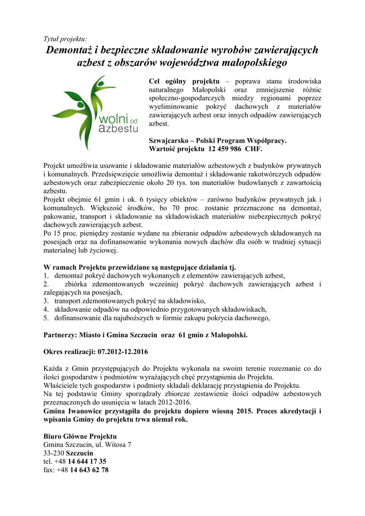 Tytuł projektu: Demontaż i bezpieczne składowanie wyrobów zawierających azbest z obszarów województwa małopolskiego Cel ogólny projektu – poprawa stanu środowiska naturalnego Małopolski oraz zmniejszenie różnic społeczno-gospodarczych miedzy regionami poprzez wyeliminowanie pokryć dachowych z materiałów zawierających azbest oraz innych odpadów zawierających azbest. Szwajcarsko – Polski Program Współpracy. Wartość projektu 12 459 986 CHF. Projekt umożliwia usuwanie i składowanie materiałów azbestowych z budynków prywatnych i komunalnych. Przedsięwzięcie umożliwia demontaż i składowanie rakotwórczych odpadów azbestowych oraz zabezpieczenie około 20 tys. ton materiałów budowlanych z zawartością azbestu. Projekt obejmie 61 gmin i ok. 6 tysięcy obiektów – zarówno budynków prywatnych jak i komunalnych. Większość środków, bo 70 proc. zostanie przeznaczone na demontaż, pakowanie, transport i składowanie na składowiskach materiałów niebezpiecznych pokryć dachowych zawierających azbest. Po 15 proc. pieniędzy zostanie wydane na zbieranie odpadów azbestowych składowanych na posesjach oraz na dofinansowanie wykonania nowych dachów dla osób w trudniej sytuacji materialnej lub życiowej. W ramach Projektu przewidziane są następujące działania tj. 1. demontaż pokryć dachowych wykonanych z elementów zawierających azbest, 2. zbiórka zdemontowanych wcześniej pokryć dachowych zawierających azbest i zalegających na posesjach, 3. transport zdemontowanych pokryć na składowisko, 4. składowanie odpadów na odpowiednio przygotowanych składowiskach, 5. dofinansowanie dla najuboższych w formie zakupu pokrycia dachowego, Partnerzy: Miasto i Gmina Szczucin oraz 61 gmin z Małopolski. Okres realizacji: 07.2012-12.2016 Każda z Gmin przystępujących do Projektu wykonała na swoim terenie rozeznanie co do ilości gospodarstw i podmiotów wyrażających chęć przystąpienia do Projektu. Właściciele tych gospodarstw i podmioty składali deklarację przystąpienia do Projektu. Na tej podstawie Gminy sporządzały zbiorcze zestawienie ilości odpadów azbestowych przeznaczonych do usunięcia w latach 2012-2016. Gmina Iwanowice przystąpiła do projektu dopiero wiosną 2015. Proces akredytacji i wpisania Gminy do projektu trwa niemal rok. Biuro Główne Projektu Gmina Szczucin, ul. Witosa 7 33-230 Szczucin tel. +48 14 644 17 35 fax: +48 14 643 62 78 Najczęstsze pytania Najczęściej zadawane pytania odnośnie projektu „Demontaż i bezpieczne składowanie wyrobów zawierających azbest z obszaru województwa małopolskiego”. Czy mogę sam zdemontować azbest ze swojej posesji? Samodzielny demontaż wyrobów azbestowych jest prawnie zabroniony. W związku z ryzykiem utraty zdrowia jakie niesie ze sobą samodzielny demontaż wyrobów azbestowych na własnej nieruchomości, zdecydowanie odradzamy tego typu działania. Gdzie należy się zgłosić chcąc usunąć wyroby zawierające azbest? Należy się udać do urzędu gminy (w gminach partnerskich jest wyznaczony koordynator ds. usuwania azbestu) właściwego ze względu na lokalizację występowania wyrobów zawierających azbest. W gminie Iwanowice koordynatorem ds. usuwania azbestu jest pani Ewa Pieronek. Jakie dokumenty należy złożyć, aby ubiegać się o demontaż pokrycia dachowego w Projekcie? a) Wszystkich informacji dotyczących uczestnictwa w Projekcie osób fizycznych udziela gminny koordynator ds. usuwania azbestu w gminie partnerskiej. b) Wyczerpujące informacje znajdują się na stronie Projektu www.wolniodazbestu.pl w zakładce „Usuwanie azbestu”. Jakie załączniki należy złożyć do wniosku gdy azbest występuje na dachu? Wraz z WNIOSKIEM WNIOSKODAWCY Osoby fizycznej Beneficjenta Ostatecznego (Załącznik nr 6 do Regulaminu Projektu) należy złożyć poniższe dokumenty: a) Kserokopia dokumentacji związanej ze zgłoszeniem robot budowlanych (nie dotyczy sytuacji wyłącznego odbioru odpadu już zdjętego). c) Oświadczenie o pokryciu kosztów niekwalifikowanych(w przypadku prowadzenia działalności gospodarczej w budynku objętym projektem). d) Ocena stanu i możliwości bezpiecznego użytkowania wyrobów zawierających azbest – zał. Nr 16 (nie dotyczy sytuacji odbioru odpadu już zdjętego). Jakie załączniki należy złożyć do wniosku gdy azbest zalega na posesji? a) W przypadku zdemontowania pokrycia dachowego zawierającego azbest przed 6 maja 2004 r. wystarczy złożyć sam wniosek. b) W przypadku zdemontowania pokrycia dachowego zawierającego azbest po 6 maja 2004 r. należy złożyć „Oświadczenie o usunięciu wyrobów zawierających azbest po dniu 6.05.2004 r. Czy na wniosku są potrzebne podpisy współwłaścicieli? NIE. Wystarczającym jest podpis wnioskodawcy wymienionego w pierwszej części wniosku, który oświadczy o posiadanym prawie do dysponowania nieruchomością. Czy mogę zrezygnować z udziału w projekcie po złożeniu wniosku? TAK, należy taką informację przekazać na piśmie do gminnego koordynatora Projektu. Koordynator w gminie partnerskiej informuje Biuro Główne Projektu i wykonawcę o tym fakcie. Czy grożą mi jakieś konsekwencje finansowe jeżeli zrezygnuję z realizacji wniosku? Na etapie złożenia wniosku nie grożą żadne konsekwencje finansowe. Konsekwencje finansowe mogą zostać wyciągnięte po podpisaniu umowy.