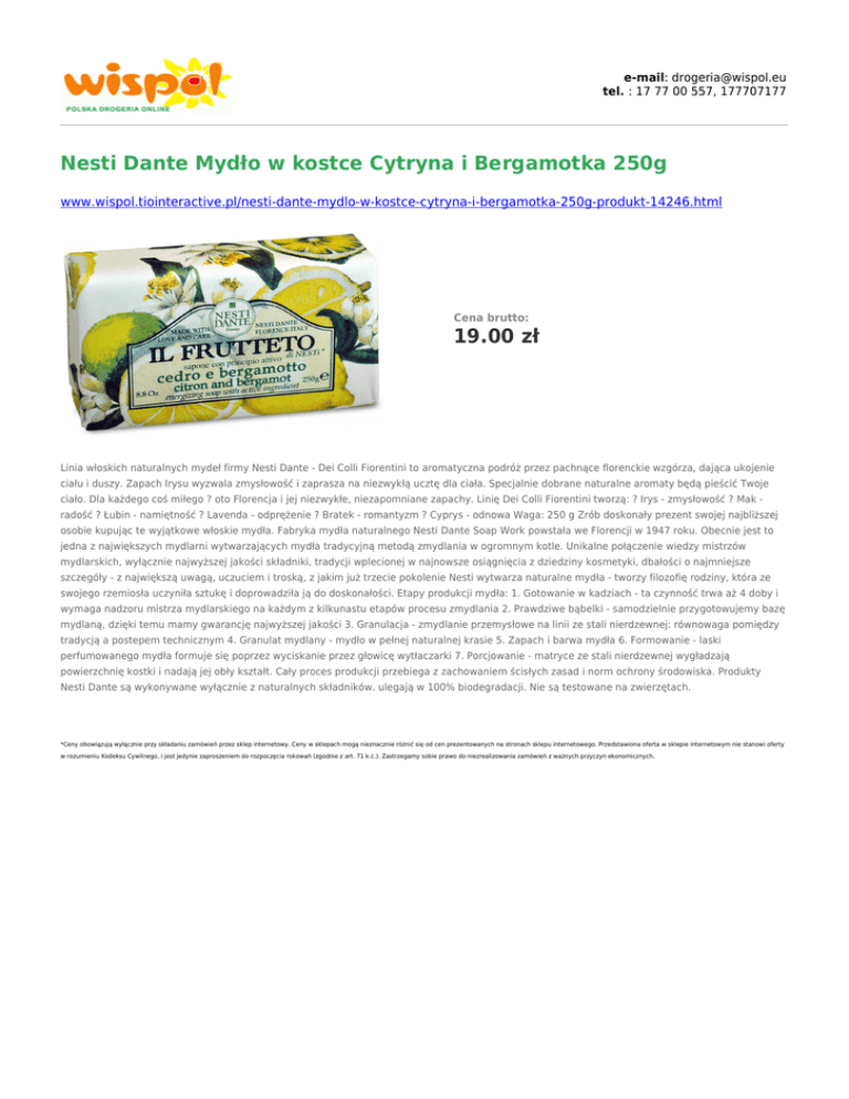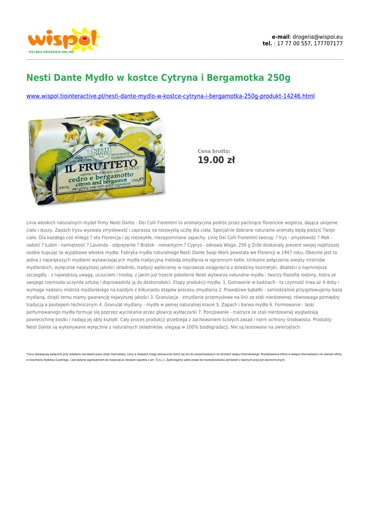 e-mail: [email protected] tel. : 17 77 00 557, 177707177 Nesti Dante Mydło w kostce Cytryna i Bergamotka 250g www.wispol.tiointeractive.pl/nesti-dante-mydlo-w-kostce-cytryna-i-bergamotka-250g-produkt-14246.html Cena brutto: 19.00 zł Linia włoskich naturalnych mydeł firmy Nesti Dante - Dei Colli Fiorentini to aromatyczna podróż przez pachnące florenckie wzgórza, dająca ukojenie ciału i duszy. Zapach Irysu wyzwala zmysłowość i zaprasza na niezwykłą ucztę dla ciała. Specjalnie dobrane naturalne aromaty będą pieścić Twoje ciało. Dla każdego coś miłego ? oto Florencja i jej niezwykłe, niezapomniane zapachy. Linię Dei Colli Fiorentini tworzą: ? Irys - zmysłowość ? Mak radość ? Łubin - namiętność ? Lavenda - odprężenie ? Bratek - romantyzm ? Cyprys - odnowa Waga: 250 g Zrób doskonały prezent swojej najbliższej osobie kupując te wyjątkowe włoskie mydła. Fabryka mydła naturalnego Nesti Dante Soap Work powstała we Florencji w 1947 roku. Obecnie jest to jedna z największych mydlarni wytwarzających mydła tradycyjną metodą zmydlania w ogromnym kotle. Unikalne połączenie wiedzy mistrzów mydlarskich, wyłącznie najwyższej jakości składniki, tradycji wplecionej w najnowsze osiągnięcia z dziedziny kosmetyki, dbałości o najmniejsze szczegóły - z największą uwagą, uczuciem i troską, z jakim już trzecie pokolenie Nesti wytwarza naturalne mydła - tworzy filozofię rodziny, która ze swojego rzemiosła uczyniła sztukę i doprowadziła ją do doskonałości. Etapy produkcji mydła: 1. Gotowanie w kadziach - ta czynność trwa aż 4 doby i wymaga nadzoru mistrza mydlarskiego na każdym z kilkunastu etapów procesu zmydlania 2. Prawdziwe bąbelki - samodzielnie przygotowujemy bazę mydlaną, dzięki temu mamy gwarancję najwyższej jakości 3. Granulacja - zmydlanie przemysłowe na linii ze stali nierdzewnej: równowaga pomiędzy tradycją a postepem technicznym 4. Granulat mydlany - mydło w pełnej naturalnej krasie 5. Zapach i barwa mydła 6. Formowanie - laski perfumowanego mydła formuje się poprzez wyciskanie przez głowicę wytłaczarki 7. Porcjowanie - matryce ze stali nierdzewnej wygładzają powierzchnię kostki i nadają jej obły kształt. Cały proces produkcji przebiega z zachowaniem ścisłych zasad i norm ochrony środowiska. Produkty Nesti Dante są wykonywane wyłącznie z naturalnych składników. ulegają w 100% biodegradacji. Nie są testowane na zwierzętach. *Ceny obowiązują wyłącznie przy składaniu zamówień przez sklep internetowy. Ceny w sklepach mogą nieznacznie różnić się od cen prezentowanych na stronach sklepu internetowego. Przedstawiona oferta w sklepie internetowym nie stanowi oferty w rozumieniu Kodeksu Cywilnego, i jest jedynie zaproszeniem do rozpoczęcia rokowań (zgodnie z art. 71 k.c.). Zastrzegamy sobie prawo do niezrealizowania zamówień z ważnych przyczyn ekonomicznych.