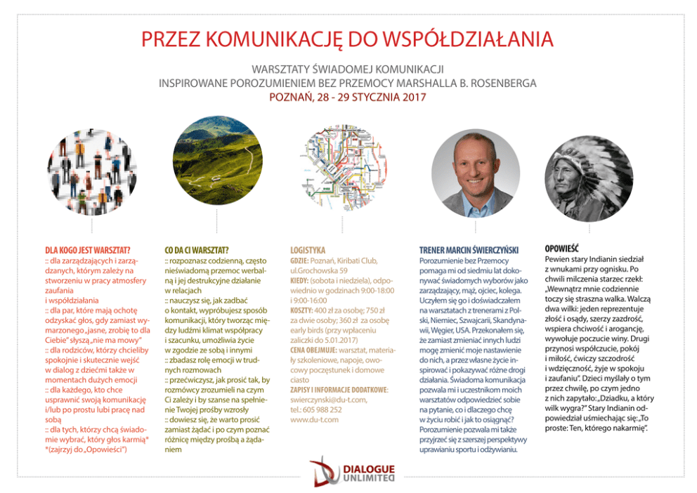 PRZEZ KOMUNIKACJĘ DO WSPÓŁDZIAŁANIA WARSZTATY ŚWIADOMEJ KOMUNIKACJI INSPIROWANE POROZUMIENIEM BEZ PRZEMOCY MARSHALLA B. ROSENBERGA POZNAŃ, 28 - 29 STYCZNIA 2017 DLA KOGO JEST WARSZTAT? :: dla zarządzających i zarządzanych, którym zależy na stworzeniu w pracy atmosfery zaufania i współdziałania :: dla par, które mają ochotę odzyskać głos, gdy zamiast wymarzonego „jasne, zrobię to dla Ciebie” słyszą „nie ma mowy” :: dla rodziców, którzy chcieliby spokojnie i skutecznie wejść w dialog z dziećmi także w momentach dużych emocji :: dla każdego, kto chce usprawnić swoją komunikację i/lub po prostu lubi pracę nad sobą :: dla tych, którzy chcą świadomie wybrać, który głos karmią* *(zajrzyj do „Opowieści”) CO DA CI WARSZTAT? :: rozpoznasz codzienną, często nieświadomą przemoc werbalną i jej destrukcyjne działanie w relacjach :: nauczysz się, jak zadbać o kontakt, wypróbujesz sposób komunikacji, który tworząc między ludźmi klimat współpracy i szacunku, umożliwia życie w zgodzie ze sobą i innymi :: zbadasz rolę emocji w trudnych rozmowach :: przećwiczysz, jak prosić tak, by rozmówcy zrozumieli na czym Ci zależy i by szanse na spełnienie Twojej prośby wzrosły :: dowiesz się, że warto prosić zamiast żądać i po czym poznać różnicę między prośbą a żądaniem LOGISTYKA GDZIE: Poznań, Kiribati Club, ul.Grochowska 59 KIEDY: (sobota i niedziela), odpowiednio w godzinach 9:00-18:00 i 9:00-16:00 KOSZTY: 400 zł za osobę; 750 zł za dwie osoby; 360 zł za osobę early birds (przy wpłaceniu zaliczki do 5.01.2017) CENA OBEJMUJE: warsztat, materiały szkoleniowe, napoje, owocowy poczęstunek i domowe ciasto ZAPISY I INFORMACJE DODATKOWE: [email protected], tel.: 605 988 252 www.du-t.com TRENER MARCIN ŚWIERCZYŃSKI Porozumienie bez Przemocy pomaga mi od siedmiu lat dokonywać świadomych wyborów jako zarządzający, mąż, ojciec, kolega. Uczyłem się go i doświadczałem na warsztatach z trenerami z Polski, Niemiec, Szwajcarii, Skandynawii, Węgier, USA. Przekonałem się, że zamiast zmieniać innych ludzi mogę zmienić moje nastawienie do nich, a przez własne życie inspirować i pokazywać różne drogi działania. Świadoma komunikacja pozwala mi i uczestnikom moich warsztatów odpowiedzieć sobie na pytanie, co i dlaczego chcę w życiu robić i jak to osiągnąć? Porozumienie pozwala mi także przyjrzeć się z szerszej perspektywy uprawianiu sportu i odżywianiu. OPOWIEŚĆ Pewien stary Indianin siedział z wnukami przy ognisku. Po chwili milczenia starzec rzekł: „Wewnątrz mnie codziennie toczy się straszna walka. Walczą dwa wilki: jeden reprezentuje złość i osądy, szerzy zazdrość, wspiera chciwość i arogancję, wywołuje poczucie winy. Drugi przynosi współczucie, pokój i miłość, ćwiczy szczodrość i wdzięczność, żyje w spokoju i zaufaniu”. Dzieci myślały o tym przez chwilę, po czym jedno z nich zapytało: „Dziadku, a który wilk wygra?” Stary Indianin odpowiedział uśmiechając się: „To proste: Ten, którego nakarmię”.