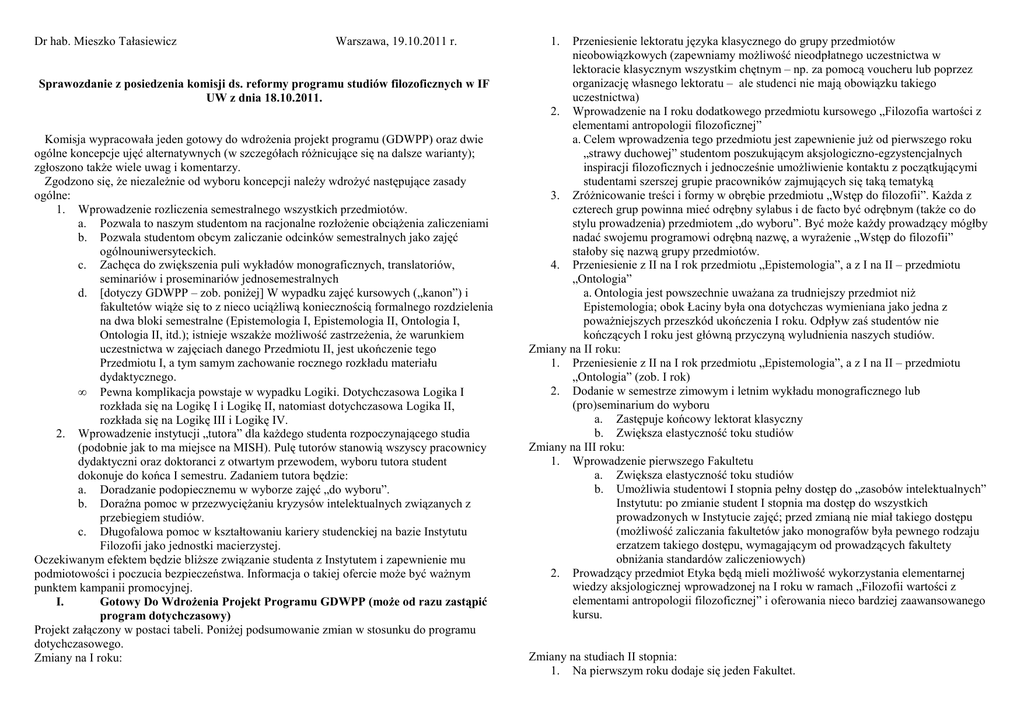 Sprawozdanie z posiedzenia komisji ds. reformy programu studiów filozoficznych w IF