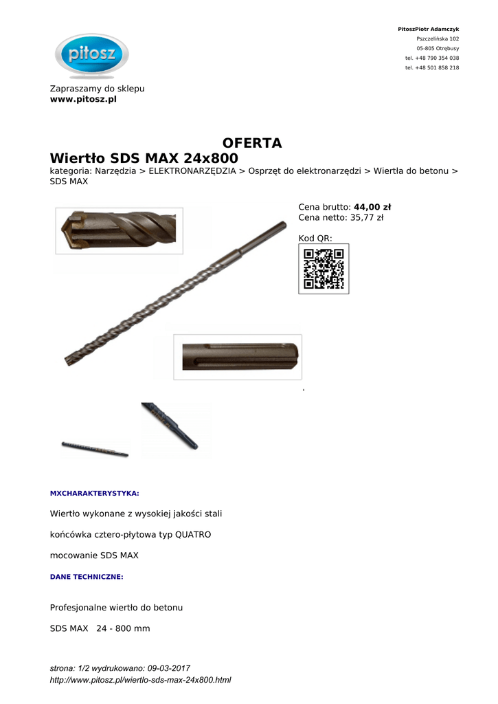PitoszPiotr Adamczyk Pszczelińska 102 05-805 Otrębusy tel. +48 790 354 038 tel. +48 501 858 218 Zapraszamy do sklepu www.pitosz.pl OFERTA Wiertło SDS MAX 24x800 kategoria: Narzędzia > ELEKTRONARZĘDZIA > Osprzęt do elektronarzędzi > Wiertła do betonu > SDS MAX Cena brutto: 44,00 zł Cena netto: 35,77 zł Kod QR: MXCHARAKTERYSTYKA: Wiertło wykonane z wysokiej jakości stali końcówka cztero-płytowa typ QUATRO mocowanie SDS MAX DANE TECHNICZNE: Profesjonalne wiertło do betonu SDS MAX 24 - 800 mm strona: 1/2 wydrukowano: 09-03-2017 http://www.pitosz.pl/wiertlo-sds-max-24x800.html strona: 2/2 wydrukowano: 09-03-2017 http://www.pitosz.pl/wiertlo-sds-max-24x800.html