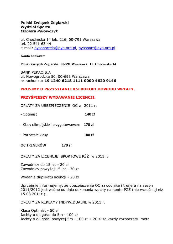 Polski Związek Żeglarski Wydział Sportu Elżbieta Polowczyk ul. Chocimska 14 lok. 216, 00-791 Warszawa tel. 22 541 63 44 e-mail: [email protected], [email protected] Konto bankowe: Polski Związek Żeglarski 00-791 Warszawa Ul. Chocimska 14 BANK PEKAO S.A ul. Nowogrodzka 50, 00-693 Warszawa nr rachunku: 19 1240 6218 1111 0000 4620 9146 PROSIMY O PRZYSYŁANIE KSEROKOPI DOWODU WPŁATY. PRZYŚPIESZY WYDAWANIE LICENCJI. OPŁATY ZA UBEZPIECZENIE OC w 2011 r. - Optimist 140 zł - Klasy olimpijskie i przygotowawcze 170 zł - Pozostałe klasy OC TRENERÓW 180 zł 170 zł. OPŁATY ZA LICENCJE SPORTOWE PŻŻ w 2011 r. Zawodnicy do 15 lat - 20 zł Zawodnicy powyżej 15 lat - 30 zł Wydanie duplikatu licencji - 20 zł Uprzejmie informujemy, że ubezpieczenie OC zawodnika i trenera na sezon 2011/2012 jest ważne od dnia dokonania wpłaty na konto PZŻ (nie wcześniej niż 15.03.2011r.). OPŁATY ZA REKLAMY INDYWIDUALNE w 2011 r. Klasa Optimist - 50 zł Jachty o długości do 5m - 100 zł Jachty o długości powyżej 5m - 100 zł + 20 zł za każdy rozpoczęty metr ORGANIZACJA REGAT - OPŁATY 1. Organizatorami regat sportowych i rekreacyjnych rozgrywanych na terenie jurysdykcji Polskiego Związku Żeglarskiego mogą być: - Międzynarodowa Federacja Żeglarska (ISAF); - Polski Związek Żeglarski (PZŻ); - Okręgowe Związki Żeglarskie (OZŻ); - Kluby sportowe i stowarzyszenia zrzeszone w PZŻ; - Inne organizacje we współpracy z PZŻ, OZŻ, klubem sportowym i stowarzyszeniem zrzeszonym w PZŻ. LICENCJE PZŻ NA PRZEPROWADZENIE REGAT SPORTOWYCH 1. Organizatorzy regat sportowych muszą uzyskać licencję PZŻ na przeprowadzenie regat. 2. licencje na przeprowadzenie regat sportowych wydaje pzż na wniosek organizatora wysłany nie później niż 14 dni przed rozpoczęciem regat. WYSOKOŚCI OPŁAT ZA LICENCJE WYSTAWIANE PRZEZ PZŻ NA PRZEPROWADZENIE REGAT SPORTOWYCH, WRAZ Z KOSZTAMI UBEZPIECZEŃ OC ORGANIZATORA, SĄ NASTĘPUJĄCE: Organizowanie regat sportowych bez sponsora tytularnego lub sponsorów wymagających noszenia reklam na jachtach lub deskach – 200 PLN. Organizowanie regat sportowych posiadających sponsora tytularnego lub sponsorów wymagających noszenia swoich reklam na jachtach lub deskach – 500 PLN. Organizowanie głównych regat krajowych – 600 PLN. Organizowanie regat rangi mistrzostw świata, mistrzostw Europy, pucharu świata, pucharu Europy – do negocjacji w zależności od sponsorów – minimum 600 PLN. Licencja bez ubezpieczenia 50 PLN. LICENCJE PZŻ NA PRZEPROWADZENIE REGAT REKREACYJNYCH Wysokość opłat za licencje wystawione przez PZŻ na przeprowadzenie regat rekreacyjnych wraz z kosztami ubezpieczeń OC organizatora są następujące: * organizacja regat rekreacyjnych bez sponsora tytularnego lub sponsorów wymagających noszenia reklam na jachtach lub deskach – 200 PLN * organizacja regat rekreacyjnych posiadających sponsora tytularnego lub sponsorów wymagających noszenia reklam na jachtach lub deskach – 500 PLN * organizacja głównych regat krajowych– 1.000 PLN LICENCJE NA PREGAT REKREACYJNYCH WYDAJE PZŻ NA WNIOSEK ORGANIZATORA WYSŁANY NIE PÓŹNIEJ NIŻ 14 DNI PRZED ROZPOCZĘCIEM REGAT.
