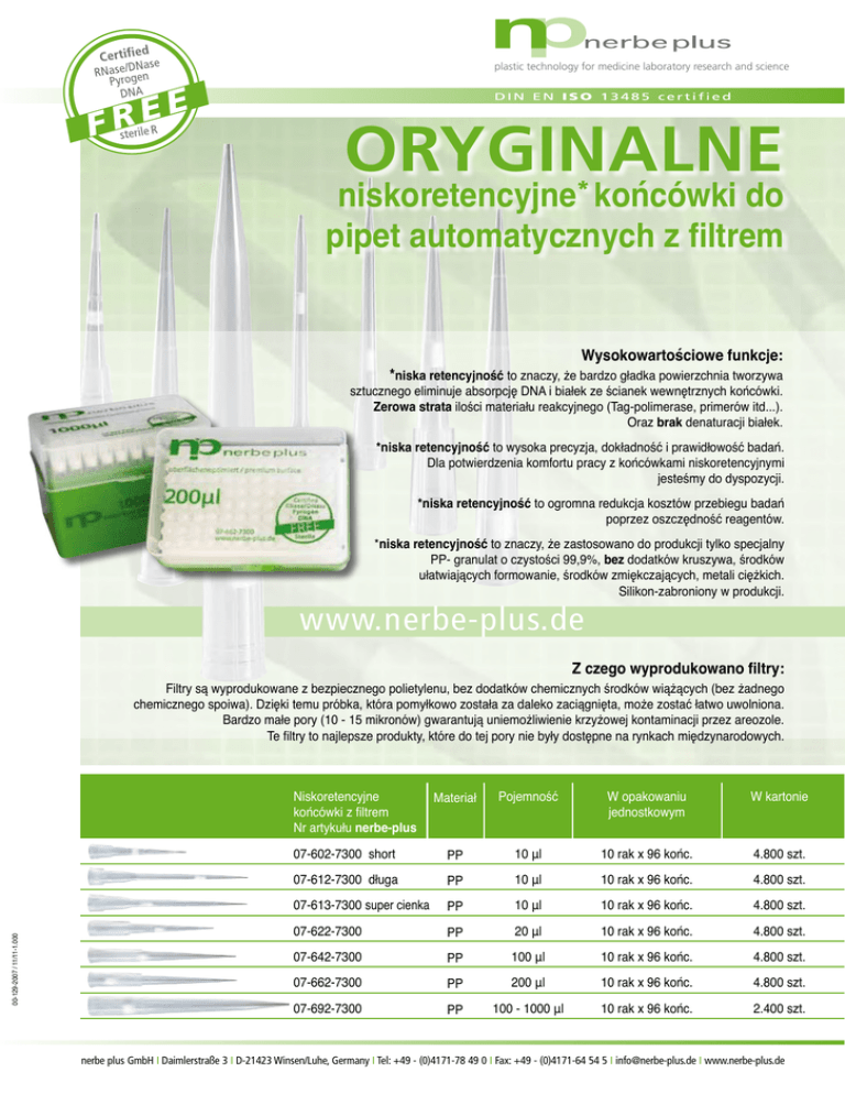 plastic technology for medicine laboratory research and science ORYGINALNE niskoretencyjne końcówki do pipet automatycznych z filtrem Wysokowartościowe funkcje: *niska retencyjność to znaczy, że bardzo gładka powierzchnia tworzywa sztucznego eliminuje absorpcję DNA i białek ze ścianek wewnętrznych końcówki. Zerowa strata ilości materiału reakcyjnego (Tag-polimerase, primerów itd...). Oraz brak denaturacji białek. *niska retencyjność to wysoka precyzja, dokładność i prawidłowość badań. Dla potwierdzenia komfortu pracy z końcówkami niskoretencyjnymi jesteśmy do dyspozycji. *niska retencyjność to ogromna redukcja kosztów przebiegu badań poprzez oszczędność reagentów. *niska retencyjność to znaczy, że zastosowano do produkcji tylko specjalny PP- granulat o czystości 99,9%, bez dodatków kruszywa, środków ułatwiających formowanie, środków zmiękczających, metali ciężkich. Silikon-zabroniony w produkcji. www.nerbe-plus.de Z czego wyprodukowano filtry: Filtry są wyprodukowane z bezpiecznego polietylenu, bez dodatków chemicznych środków wiążących (bez żadnego chemicznego spoiwa). Dzięki temu próbka, która pomyłkowo została za daleko zaciągnięta, może zostać łatwo uwolniona. Bardzo małe pory (10 - 15 mikronów) gwarantują uniemożliwienie krzyżowej kontaminacji przez areozole. Te filtry to najlepsze produkty, które do tej pory nie były dostępne na rynkach międzynarodowych. Materiał Pojemność W opakowaniu jednostkowym W kartonie 07-602-7300 short PP 10 μl 10 rak x 96 końc. 4.800 szt. 07-612-7300 długa PP 10 μl 10 rak x 96 końc. 4.800 szt. 07-613-7300 super cienka PP 10 μl 10 rak x 96 końc. 4.800 szt. 07-622-7300 PP 20 μl 10 rak x 96 końc. 4.800 szt. 07-642-7300 PP 100 μl 10 rak x 96 końc. 4.800 szt. 07-662-7300 PP 200 μl 10 rak x 96 końc. 4.800 szt. 07-692-7300 PP 100 - 1000 μl 10 rak x 96 końc. 2.400 szt. 00-129-2007 / 11/11-1.000 Niskoretencyjne końcówki z filtrem Nr artykułu nerbe-plus nerbe plus GmbH I Daimlerstraße 3 I D-21423 Winsen/Luhe, Germany I Tel: +49 - (0)4171-78 49 0 I Fax: +49 - (0)4171-64 54 5 I [email protected] I www.nerbe-plus.de