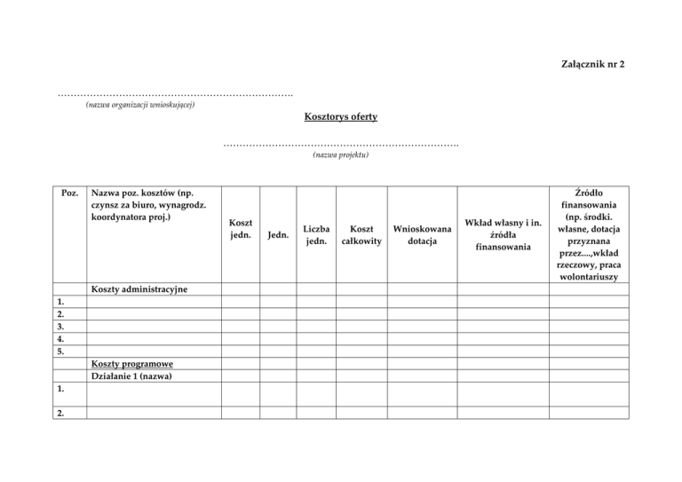 Załącznik nr 2 ………………………………………………………………. (nazwa organizacji wnioskującej) Kosztorys oferty ………………………………………………………………. (nazwa projektu) Poz. Nazwa poz. kosztów (np. czynsz za biuro, wynagrodz. koordynatora proj.) Koszty administracyjne 1. 2. 3. 4. 5. Koszty programowe Działanie 1 (nazwa) 1. 2. Koszt jedn. Jedn. Liczba jedn. Koszt całkowity Wnioskowana dotacja Wkład własny i in. źródła finansowania Źródło finansowania (np. środki. własne, dotacja przyznana przez....,wkład rzeczowy, praca wolontariuszy 3. 4. 5. 6. 7. Działanie 2 (nazwa) 1. 2. 3. 4. 5. OGÓŁEM Pieczęć i podpis osoby upoważnionej lub podpis osoby upoważnionej składania oświadczenia woli w imieniu wnioskodawcy