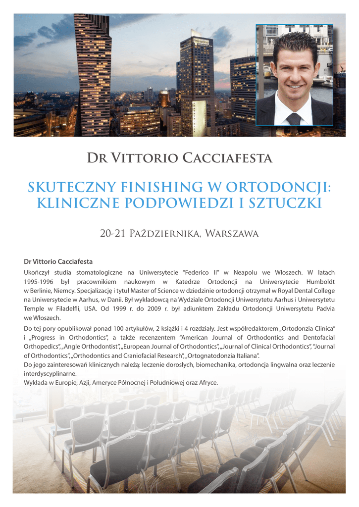 Dr Vittorio Cacciafesta SKUTECZNY FINISHING W ORTODONCJI: KLINICZNE PODPOWIEDZI I SZTUCZKI 20-21 Października, Warszawa Dr Vittorio Cacciafesta Ukończył studia stomatologiczne na Uniwersytecie “Federico II” w Neapolu we Włoszech. W latach 1995-1996 był pracownikiem naukowym w Katedrze Ortodoncji na Uniwersytecie Humboldt w Berlinie, Niemcy. Specjalizację i tytuł Master of Science w dziedzinie ortodoncji otrzymał w Royal Dental College na Uniwersytecie w Aarhus, w Danii. Był wykładowcą na Wydziale Ortodoncji Uniwersytetu Aarhus i Uniwersytetu Temple w Filadelfii, USA. Od 1999 r. do 2009 r. był adiunktem Zakładu Ortodoncji Uniwersytetu Padvia we Włoszech. Do tej pory opublikował ponad 100 artykułów, 2 książki i 4 rozdziały. Jest współredaktorem „Ortodonzia Clinica” i „Progress in Orthodontics”, a także recenzentem “American Journal of Orthodontics and Dentofacial Orthopedics”, „Angle Orthodontist”, „European Journal of Orthodontics”, „Journal of Clinical Orthodontics”, “Journal of Orthodontics”, „Orthodontics and Craniofacial Research”, „Ortognatodonzia Italiana”. Do jego zainteresowań klinicznych należą: leczenie dorosłych, biomechanika, ortodoncja lingwalna oraz leczenie interdyscyplinarne. Wykłada w Europie, Azji, Ameryce Północnej i Południowej oraz Afryce. Cena kursu 1890 z ł * 1690 zł cena do 31.08.2017r. 20-21 października 2017, Warszawa Punkty edukacyjne: 14 Hotel InterContinental tłumaczenie symultaniczne ul.Emilii Plater 49, Warszawa SKUTECZNY FINISHING W ORTODONCJI: KLINICZNE PODPOWIEDZI I SZTUCZKI 1 Idealna okluzja • Tip, tork i wskaźnik Boltona w odcinku przednim • Nagryz poziomy i pionowy • Okluzja, tip, tork, listewki brzeżne w odcinkach bocznych 6 Leczenie trudnych przypadków • Postępowanie przy zaburzeniach poprzecznych - łuki poszerzające i zwężające • Zęby zatrzymane i transpozycja 2 Wymogi estetyczne • Makroestetyka, Miniestetyka, Mikroestetyka • Łuk uśmiechu • Widoczność dziąsła • Aspekty estetyczne uśmiechu - wirtualne planowanie uśmiechu • Rozbudowa łuków i odpowiedni tork 7 Leczenie przypadków z asymetriami • Interceptywne podejście ortopedyczne • Podejście ortodontyczne a chirurgiczne 3 Ustawienie zamków, łuki i finishing • Pozycje zamków na poszczególnych zębach • Wykorzystanie różnych rodzajów wyciągów • Guziki • Łuki • Co powinniśmy wiedzieć o finishingu i kontroli torku? 9 Leczenie przemieszczonych linii pośrodkowych • Podejście ortodontyczne a chirurgiczne 4 Finishing przypadków klasy I, II, III • Leczenie w przypadku zgryzu głębokiego • Leczenie w przypadku zgryzu otwartego 5 Finishing przypadków ekstrakcyjnych 8 Leczenie przypadków z przechyleniem płaszczyzn okluzyjnych • Podejście ortodontyczne a chirurgiczne PROGRAM Celem niniejszego kursu jest omówienie właściwego ukończenia leczenia ortodontycznego, zwłaszcza u pacjentów dorosłych z dużymi wymaganiami estetycznymi lub po zabiegach ortognatycznych. Wykład będzie poświęcony estetycznym i niewidzialnym zamkom, łukom ortodontycznym pod kątem ich przekrojów i stopów, z których są wykonane, a także klinicznym rozwiązaniom pozwalającym uzyskać najlepsze wyniki u większości pacjentów. Zostanie zwrócona uwaga na mechanikę łuków roboczych, wykorzystanie zaczepów i wyciągów, ze szczególnym uwzględnieniem procedur i narzędzi stosowanych w finishingu i dopracowywaniu detali. Zostaną pokazane wszystkie specjalne kleszcze i materiały pomocnicze stosowane do rozwiązywania najczęstszych problemów występujących pod koniec terapii ortodontycznej i ortognatycznej. 10 Dogięcia 1., 2. i 3. rzędu służące uzyskaniu pięknych uśmiechów 11 Schematy postępowania retencyjnego • Mechaniczne i biologiczne • Stałe i wyjmowane 12 Wnioski Grand Ortho Sp. z o.o. | ul. Annopol 24, 03-236 Warszawa | tel.: 22 675 24 94 [email protected] | www.grandortho.pl/kursy Prosimy o wpłaty na konto nr: 42 1140 1010 0000 3135 2600 1001