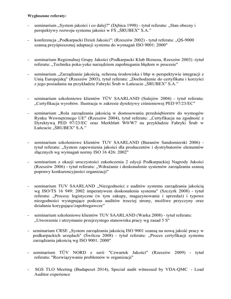 Wygłoszone referaty: - seminarium „System jakości i co dalej?" (Dębica 1998) - tytuł referatu: „Stan obecny i perspektywy rozwoju systemu jakości w FŚ „ŚRUBEX" S.A.” - konferencja „Podkarpacki Dzień Jakości": (Rzeszów 2002) - tytuł referatu: „QS-9000 szansą przyśpieszonej adaptacji systemu do wymagań ISO 9001: 2000" - seminarium Regionalnej Grupy Jakości (Podkarpacki Klub Biznesu, Rzeszów 2003) -tytuł referatu: „Technika poka-yoke narzędziem zapobiegania błędom w procesie" - seminarium „Zarządzanie jakością, ochroną środowiska i bhp w perspektywie integracji z Unią Europejską" (Rzeszów 2003), tytuł referatu: „Dochodzenie do certyfikatu i korzyści z jego posiadania na przykładzie Fabryki Śrub w Łańcucie „ŚRUBEX" S.A.” - seminarium szkoleniowe klientów TÜV SAARLAND (Sulejów 2004) - tytuł referatu: „Certyfikacja wyrobów. Ilustracja w zakresie dyrektywy ciśnieniowej PED 97/23/EC" - seminarium „Rola zarządzania jakością w dostosowaniu przedsiębiorstw do wymogów Rynku Wewnętrznego UE" (Rzeszów 2004), tytuł referatu: „Certyfikacja na zgodność z Dyrektywą PED 97/23/EC oraz Merkblatt W0/W7 na przykładzie Fabryki Śrub w Łańcucie „ŚRUBEX" S.A.” - seminarium szkoleniowe klientów TUV SAARLAND (Baranów Sandomierski 2006) tytuł referatu: „System zapewnienia jakości dla producentów i dystrybutorów elementów złącznych wg wymagań normy ISO 16 426: 2002" - seminarium z okazji uroczystości zakończenia 2 edycji Podkarpackiej Nagrody Jakości (Rzeszów 2006) - tytuł referatu: „Wdrażanie i doskonalenie systemów zarządzania szansą poprawy konkurencyjności organizacji" - seminarium TUV SAARLAND „Niezgodności z auditów systemu zarządzania jakością wg ISO/TS 16 949: 2002 imperatywem doskonalenia systemu" (Szczyrk 2008) - tytuł referatu: „Procesy logistyczne (w tym zakupy, magazynowanie i sprzedaż) i typowe niezgodności występujące podczas auditów trzeciej strony, możliwe przyczyny oraz działania korygujące/zapobiegawcze” - seminarium szkoleniowe klientów TUV SAARLAND (Warka 2008) - tytuł referatu: „Utworzenie i utrzymanie przejrzystego stanowiska pracy wg zasad 5 S" - seminarium CRSE „System zarządzania jakością ISO 9001 szansą na nową jakość pracy w podkarpackich urzędach" (Świlcza 2008) - tytuł referatu: „Proces certyfikacji systemu zarządzania jakością wg ISO 9001: 2000" - seminarium TÜV NORD z serii "Czwartek Jakości" (Rzeszów 2009) - tytuł referatu: "Rozwiązywanie problemów w organizacji" - SGS TLO Meeting (Budapeszt 2014), Special audit witnessed by VDA-QMC - Lead Auditor experience