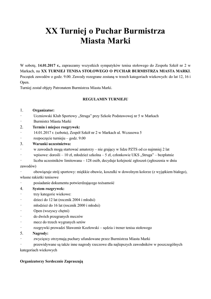 XX Turniej o Puchar Burmistrza Miasta Marki W sobotę, 14.01.2017 r., zapraszamy wszystkich sympatyków tenisa stołowego do Zespołu Szkół nr 2 w Markach, na XX TURNIEJ TENISA STOŁOWEGO O PUCHAR BURMISTRZA MIASTA MARKI. Początek zawodów o godz. 9.00. Zawody rozegrane zostaną w trzech kategoriach wiekowych: do lat 12, 16 i Open. Turniej został objęty Patronatem Burmistrza Miasta Marki. REGULAMIN TURNIEJU 1. Organizator: • Uczniowski Klub Sportowy „Struga” przy Szkole Podstawowej nr 5 w Markach • Burmistrz Miasta Marki 2. Termin i miejsce rozgrywek: • 14.01.2017 r. (sobota), Zespół Szkół nr 2 w Markach ul. Wczasowa 5 • rozpoczęcie turnieju – godz. 9.00 3. Warunki uczestnictwa: • w zawodach mogą startować amatorzy – nie grający w lidze PZTS od co najmniej 2 lat • wpisowe: dorośli – 10 zł, młodzież szkolna – 5 zł, członkowie UKS „Struga” – bezpłatnie • liczba uczestników limitowana – 128 osób, decyduje kolejność zgłoszeń (zgłoszenia w dniu zawodów) • obowiązuje strój sportowy: miękkie obuwie, koszulki w dowolnym kolorze (z wyjątkiem białego), własne rakietki tenisowe • posiadanie dokumentu potwierdzającego tożsamość 4. System rozgrywek: • trzy kategorie wiekowe: • dzieci do 12 lat (rocznik 2004 i młodsi) • młodzież do 16 lat (rocznik 2000 i młodsi) • Open (wszyscy chętni) • do dwóch przegranych meczów • mecz do trzech wygranych setów • rozgrywki prowadzi Sławomir Kozłowski – sędzia i trener tenisa stołowego 5. Nagrody: • zwycięzcy otrzymają puchary ufundowane przez Burmistrza Miasta Marki • przewidywane są także inne nagrody rzeczowe dla najlepszych zawodników w poszczególnych kategoriach wiekowych Organizatorzy Serdecznie Zapraszają