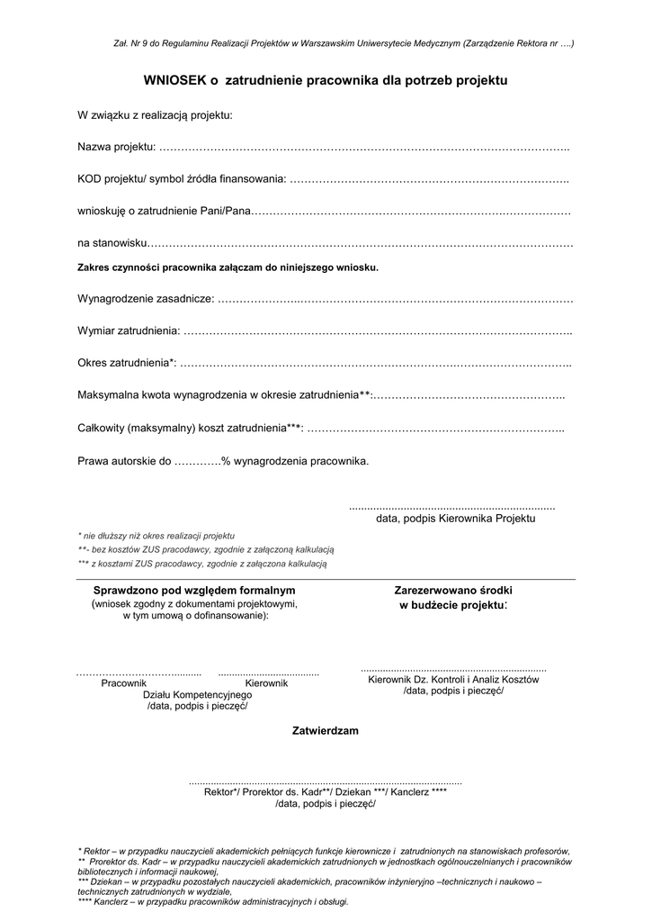 Zał. Nr 9 do Regulaminu Realizacji Projektów w Warszawskim Uniwersytecie Medycznym (Zarządzenie Rektora nr ….) WNIOSEK o zatrudnienie pracownika dla potrzeb projektu W związku z realizacją projektu: Nazwa projektu: ………………………………………………………………………………………………….. KOD projektu/ symbol źródła finansowania: ………………………………………………………………….. wnioskuję o zatrudnienie Pani/Pana…………………………………………………………….……………… na stanowisku……………………………………………………………………………………………………… Zakres czynności pracownika załączam do niniejszego wniosku. Wynagrodzenie zasadnicze: …………………..………………………………………………………………… Wymiar zatrudnienia: …………………………………………………………………………………………….. Okres zatrudnienia*: ………………………………………………………………….………………………….. Maksymalna kwota wynagrodzenia w okresie zatrudnienia**:…………………………………………….. Całkowity (maksymalny) koszt zatrudnienia***: …………………………………………………………….. Prawa autorskie do ………….% wynagrodzenia pracownika. .................................................................... data, podpis Kierownika Projektu * nie dłuższy niż okres realizacji projektu **- bez kosztów ZUS pracodawcy, zgodnie z załączoną kalkulacją *** z kosztami ZUS pracodawcy, zgodnie z załączona kalkulacją Sprawdzono pod względem formalnym (wniosek zgodny z dokumentami projektowymi, w tym umową o dofinansowanie): ………………………….......... ..................................... Pracownik Kierownik Działu Kompetencyjnego /data, podpis i pieczęć/ Zarezerwowano środki w budżecie projektu: .................................................................... Kierownik Dz. Kontroli i Analiz Kosztów /data, podpis i pieczęć/ Zatwierdzam .................................................................................................... Rektor*/ Prorektor ds. Kadr**/ Dziekan ***/ Kanclerz **** /data, podpis i pieczęć/ * Rektor – w przypadku nauczycieli akademickich pełniących funkcje kierownicze i zatrudnionych na stanowiskach profesorów, ** Prorektor ds. Kadr – w przypadku nauczycieli akademickich zatrudnionych w jednostkach ogólnouczelnianych i pracowników bibliotecznych i informacji naukowej, *** Dziekan – w przypadku pozostałych nauczycieli akademickich, pracowników inżynieryjno –technicznych i naukowo – technicznych zatrudnionych w wydziale, **** Kanclerz – w przypadku pracowników administracyjnych i obsługi.