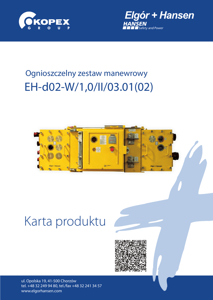 Ognioszczelny zestaw manewrowy EH-d02-W/1,0/II/03.01(02) Karta produktu ul. Opolska 19, 41-500 Chorzów tel. +48 32 249 94 80, tel./fax +48 32 241 34 57 www.elgorhansen.com CECHY CHARAKTERYSTYCZNE Zestaw manewrowy jest urządzeniem w wykonaniu przeciwwybuchowym i może być instalowany w podziemnych wyrobiskach zakładów górniczych niemetanowych i metanowych ze stopniem zagrożenia metanowego „a”, „b”, „c” oraz w wyrobiskach klasy „A” i „B” zagrożenia wybuchem pyłu węglowego. Konstrukcja opracowana została zgodnie z wymaganiami dyrektywy 94/9/WE (ATEX). Ognioszczelny zestaw manewrowy jest przeznaczony do łączenia i sterowania elektrycznych napędów maszyn i urządzeń górniczych. Zastosowane zabezpieczenia elektroenergetyczne oraz przyjęty system sterowania i współpracy z blokadami technologicznymi z wykorzystaniem obwodów iskrobezpiecznych, zapewniają bezpieczna współprace z zasilanymi urządzeniami i/lub maszynami górniczymi. Zestaw przewidziany jest do stosowania w instalacjach o napięciu znamionowym 1000V i 500V z izolowanym punktem neutralnym transformatora zasilającego. Zestaw manewrowy wyposażony jest w dwa tory z przełącznikami rozłącznikowymi z napędem ręcznym. Poszczególne tory umożliwiają zasilanie: • Tor 1 - maksymalnie trzech trójfazowych odbiorników i pomocniczych urządzeń górniczych napięciem 230V (EH-d02W/1,0/II/03.01) lub 133V (EH-d02-W/1,0/II/03.02), • Tor 2 - maksymalnie trzech trójfazowych odbiorników. BUDOWA Zestaw manewrowy składa się z trzech komór: • przyłączowej dopływowej (zamykana pokrywa mocowana śrubami), • głównej (aparaturowej, zamykana pokrywami z zamknięciem specjalnym - blokada), • przyłączowej odpływowej (zamykana pokrywa mocowana śrubami). OPIS DZIAŁANIA Zestaw manewrowy posiada sześć odpływów głównych i dwa odpływy (230V lub 133V) chronione od skutków zwarć, przeciążeń i asymetrii obciążenia. Przekaźnik sterowniczy i kontroli ciągłości uziemienia umożliwia kontrole ciągłości uziemienia oraz sterowanie zdalne. Odpływy wyposażone są w zabezpieczenia upływowe blokujące oraz termiczne. Obwody członów termicznych należy połączyć z czujnikami temperaturowymi zasilanych silników. Zestaw manewrowy wyposażono w urządzenia kontrolno-sygnalizacyjne. DANE TECHNICZNE Znamionowe napięcie izolacji Znamionowe napięcie łączeniowe 1000V 1000V i/lub 500V Częstotliwość 50Hz Znamionowy prąd ciągły 1200A Znamionowy prąd ciągły toru rozłącznikowego 600A Maksymalny prąd ciągły odpływów do 400A odpływ 111, 121, 131, 211, 221, 231 do 12A dla 230V odpływ 311, 321 do 15A dla 133V Ilość odpływów głównych 6 Ilość odpływów obwodów 230V lub 133V 2 Napięcie obwodów pomocniczych 42V, 220V www.elgorhansen.com Ognioszczelny zestaw manewrowy EH-d02-W/1,0/II/03.01(02) Zwarciowa zdolność łączeniowa 25kA, cosφ = 0,2 Rezystancja blokowania zabezpieczenia upływowego obwodów 50kΩ dla 1000V głównych 25kΩ dla 500V Rezystancja blokowania zabezpieczenia upływowego obwodów 230V lub 133V człon blokujący 15kΩ człon centralny 7kΩ Masa ~1600kg SCHEMAT URZĄDZENIA Q101, Q201 F101, F102, F201 F10., F301 K111, K121, K211, K221 K311, K321 K304 – przełącznik rozłącznikowy – wkładka topikowa ograniczająca – wkładka topikowa – stycznik obwodu głównego – stycznik obwodu 133V (230V) – stycznik obwodu 42V ul. Opolska 19, 41-500 Chorzów tel. +48 32 249 94 80, tel./fax +48 32 241 34 57 www.elgorhansen.com Ognioszczelny zestaw manewrowy EH-d02-W/1,0/II/03.01(02) RYSUNEK WYMIAROWY CECHA BUDOWY PRZECIWWYBUCHOWEJ I M2 Ex d I Mb 1453 Certyfikat badania typu WE: KDB 06ATEX225X ul. Grabowa 1, 40-172 Katowice tel. +48 32 604 70 00, tel./fax +48 32 604 71 00 www.kopex.com.pl
