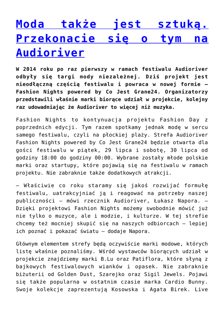 Moda także Przekonacie Audioriver jest sztuką. się o tym na W 2014 roku po raz pierwszy w ramach festiwalu Audioriver odbyły się targi mody niezależnej. Dziś projekt jest nieodłączną częścią festiwalu i powraca w nowej formie – Fashion Nights powered by Co Jest Grane24. Organizatorzy przedstawili właśnie marki biorące udział w projekcie, kolejny raz udowadniając że Audioriver to więcej niż muzyka. Fashion Nights to kontynuacja projektu Fashion Day z poprzednich edycji. Tym razem spotkamy jednak modę w sercu samego festiwalu, czyli na płockiej plaży. Strefa Audioriver Fashion Nights powered by Co Jest Grane24 będzie otwarta dla gości festiwalu w piątek, 29 lipca i sobotę, 30 lipca od godziny 18:00 do godziny 00:00. Wybrane zostały młode polskie marki oraz startupy, które pojawią się na festiwalu w ramach projektu. Nie zabraknie także dodatkowych atrakcji. – Właściwie co roku staramy się jakoś rozwijać formułę festiwalu, uatrakcyjniać ją i reagować na potrzeby naszej publiczności – mówi rzecznik Audioriver, Łukasz Napora. – Dzięki projektowi Fashion Nights możemy swobodnie mówić już nie tylko o muzyce, ale i modzie, i kulturze. W tej strefie chcemy też mocniej skupić się na naszych odbiorcach – lepiej ich poznać i pokazać światu – dodaje Napora. Głównym elementem strefy będą oczywiście marki modowe, których listę właśnie poznaliśmy. Wśród wystawców biorących udział w projekcie znajdziemy marki B.Lu oraz Patiflora, które słyną z bajkowych festiwalowych wianków i opasek. Nie zabraknie biżuterii od Golden Dust, Szarejko oraz Sigil Jewels. Pojawi się także popularna w ostatnim czasie marka Cardio Bunny. Swoje kolekcje zaprezentują Kosowska i Agata Birek. Live Heroes oraz Icon pokażą siłę personalizowanych ubrań oraz dodatków. Na festiwal wróci Alkopoligamia.com. Na plaży znajdziemy również kolorowe dodatki od Cherrish, Lootbag i DISCO by Zuza. Z kolei dla największych fanów festiwalu organizatorzy przygotowali punkt, gdzie będzie można znaleźć ubrania z metką Audioriver. Będzie też coś zupełnie nowego: wspólna akcja magazynu „K Mag” i organizatorów festiwalu. – Przez dwa dni nasi łowcy, dziennikarze i fotografowie związani z tym pismem, będą szukali ciekawych festiwalowych osobowości. Najciekawsze zdjęcia trafią na ekrany głównej sceny festiwalu, a niektóre także do magazynu. Pokażemy w ten sposób to, co na Audioriver jest równie ważne równie ważne, jak muzyka czyli ludzie tworzący tę magiczną atmosferę – opowiada Łukasz Napora. 11. edycja Audioriver odbędzie się w Płocku w dniach 29-31 lipca czyli za dwa tygodnie.