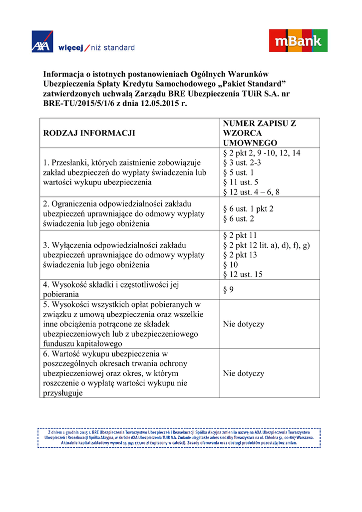Informacja o istotnych postanowieniach Ogólnych Warunków Ubezpieczenia Spłaty Kredytu Samochodowego „Pakiet Standard” zatwierdzonych uchwalą Zarządu BRE Ubezpieczenia TUiR S.A. nr BRE-TU/2015/5/1/6 z dnia 12.05.2015 r. RODZAJ INFORMACJI 1. Przesłanki, których zaistnienie zobowiązuje zakład ubezpieczeń do wypłaty świadczenia lub wartości wykupu ubezpieczenia NUMER ZAPISU Z WZORCA UMOWNEGO § 2 pkt 2, 9 -10, 12, 14 § 3 ust. 2-3 § 5 ust. 1 § 11 ust. 5 § 12 ust. 4 – 6, 8 2. Ograniczenia odpowiedzialności zakładu ubezpieczeń uprawniające do odmowy wypłaty świadczenia lub jego obniżenia § 6 ust. 1 pkt 2 § 6 ust. 2 3. Wyłączenia odpowiedzialności zakładu ubezpieczeń uprawniające do odmowy wypłaty świadczenia lub jego obniżenia § 2 pkt 11 § 2 pkt 12 lit. a), d), f), g) § 2 pkt 13 § 10 § 12 ust. 15 4. Wysokość składki i częstotliwości jej pobierania 5. Wysokości wszystkich opłat pobieranych w związku z umową ubezpieczenia oraz wszelkie inne obciążenia potrącone ze składek ubezpieczeniowych lub z ubezpieczeniowego funduszu kapitałowego 6. Wartość wykupu ubezpieczenia w poszczególnych okresach trwania ochrony ubezpieczeniowej oraz okres, w którym roszczenie o wypłatę wartości wykupu nie przysługuje §9 Nie dotyczy Nie dotyczy