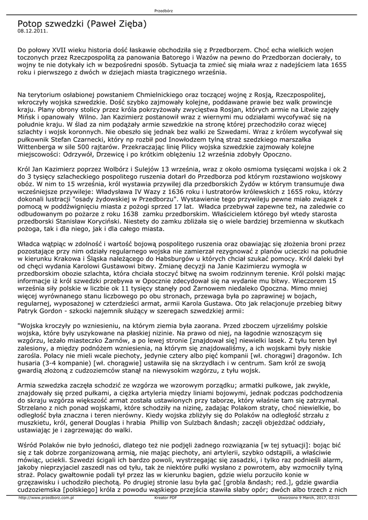 "Dzieło" swej armii miał możliwość podziwiać sam Karol X Gustaw, który przejeżdżał przez Przedbórz 4