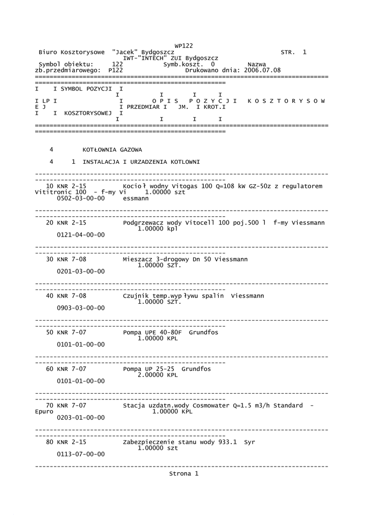 WP122 "Jacek" Bydgoszcz STR. 1 IWT-"INTECH" ZUI Bydgoszcz Symbol obiektu: 122 Symb.koszt. 0 Nazwa zb.przedmiarowego: P122 Drukowano dnia: 2006.07.08 ================================================================================ ==================================================== I I SYMBOL POZYCJI I I I I I I LP I I O P I S P O Z Y C J I K O S Z T O R Y S O W E J I PRZEDMIAR I JM. I KROT.I I I KOSZTORYSOWEJ I I I I I ================================================================================ ==================================================== Biuro Kosztorysowe 4 4 KOT ŁOWNIA GAZOWA 1 INSTALACJA I URZADZENIA KOTLOWNI ----------------------------------------------------------------------------------------------------------------------------------10 KNR 2-15 Kocio ł wodny Vitogas 100 Q=108 kW GZ-50z z regulatorem Vititronic 100 - f-my Vi 1.00000 szt 0502-03-00-00 essmann ----------------------------------------------------------------------------------------------------------------------------------20 KNR 2-15 Podgrzewacz wody Vitocell 100 poj.500 l f-my Viessmann 1.00000 kpl 0121-04-00-00 ----------------------------------------------------------------------------------------------------------------------------------30 KNR 7-08 Mieszacz 3-drogowy Dn 50 Viessmann 1.00000 SZT. 0201-03-00-00 ----------------------------------------------------------------------------------------------------------------------------------40 KNR 7-08 Czujnik temp.wyp ływu spalin Viessmann 1.00000 SZT. 0903-03-00-00 ----------------------------------------------------------------------------------------------------------------------------------50 KNR 7-07 Pompa UPE 40-80F Grundfos 1.00000 KPL 0101-01-00-00 ----------------------------------------------------------------------------------------------------------------------------------60 KNR 7-07 Pompa UP 25-25 Grundfos 2.00000 KPL 0101-01-00-00 ----------------------------------------------------------------------------------------------------------------------------------70 KNR 7-07 Stacja uzdatn.wody Cosmowater Q=1.5 m3/h Standard Epuro 1.00000 KPL 0203-01-00-00 ----------------------------------------------------------------------------------------------------------------------------------80 KNR 2-15 Zabezpieczenie stanu wody 933.1 Syr 1.00000 szt 0113-07-00-00 -------------------------------------------------------------------------------Strona 1 WP122 ---------------------------------------------------90 KNR 2-15 Filtroodmulnik FOM 0.6 Dn 50 1.00000 szt 0406-01-00-00 ----------------------------------------------------------------------------------------------------------------------------------100 KNR 2-15 Filtr wstepny BWT Dn 25 1.00000 szt 0410-02-00-00 ----------------------------------------------------------------------------------------------------------------------------------110 KNR 2-15 Zestaw uzupelniajacy mieszacza -czujnik przylgowy, silownik, wtyk okablowany 1.00000 szt 0122-01-00-00 ----------------------------------------------------------------------------------------------------------------------------------120 KNR 2-15 Naczynie wzbiorcze Reflex N200 1.00000 szt 0507-01-00-00 ----------------------------------------------------------------------------------------------------------------------------------130 KNR 2-15 Z łącze 1" Reflex 1.00000 szt 0408-03-00-00 ----------------------------------------------------------------------------------------------------------------------------------140 KNR 2-20 Zawór bezpieczenstwa Syr 1915 Dn 25 2.00000 SZT. 0413-05-00-00 ----------------------------------------------------------------------------------------------------------------------------------150 KNR 2-15 Wodomierz skrzyde łkowy Dn 25 1.00000 szt 0118-02-00-00 ----------------------------------------------------------------------------------------------------------------------------------160 KNR 2-15 Podejscie do wodomierza sr.25 mm 1.00000 kpl 0108-03-00-00 ----------------------------------------------------------------------------------------------------------------------------------170 KNR 2-15 Odpowietrznik automatyczny Taco Dn 15 4.00000 szt 0408-01-00-00 ----------------------------------------------------------------------------------------------------------------------------------180 KNR 2-20 Zawor odcinajacy mufowy Dn 25 3.00000 SZT. 0412-02-00-00 • Biuro Kosztorysowe "Jacek" Bydgoszcz STR. 2 IWT-"INTECH" ZUI Bydgoszcz Symbol obiektu: 122 Symb.koszt. 0 Nazwa zb.przedmiarowego: P122 Drukowano dnia: 2006.07.08 ================================================================================ ==================================================== I I SYMBOL POZYCJI I I I I I I LP I I O P I S P O Z Y C J I K O S Z T O R Y S O W E J I PRZEDMIAR I JM. I KROT.I Strona 2 WP122 I I KOSZTORYSOWEJ I I I I I ================================================================================ ==================================================== 190 KNR 2-20 Zawor odcinajacy mufowy Dn 32 3.00000 SZT. 0412-02-00-00 ----------------------------------------------------------------------------------------------------------------------------------200 KNR 2-20 Zawór odcinajacy mufowy Dn 50 2.00000 SZT. 0412-04-00-00 ----------------------------------------------------------------------------------------------------------------------------------210 KNR 7-08 Zawór samozamykajacy MAG-3 Dn 32 1.00000 SZT. 0205-03-00-00 ----------------------------------------------------------------------------------------------------------------------------------220 KNR 7-08 Modu ł sterujący MD-2.Z 1.00000 SZT. 0301-02-00-00 ----------------------------------------------------------------------------------------------------------------------------------230 KNR 7-08 Detektor DEX-11 1.00000 SZT. 0401-02-00-00 ----------------------------------------------------------------------------------------------------------------------------------240 KNR 7-08 Sygnalizato