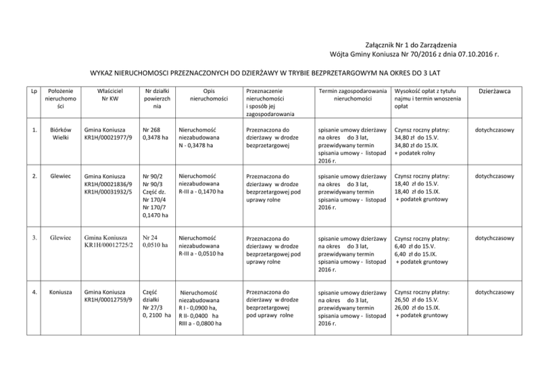 Załącznik Nr 1 do Zarządzenia Wójta Gminy Koniusza Nr 70/2016 z dnia 07.10.2016 r. WYKAZ NIERUCHOMOSCI PRZEZNACZONYCH DO DZIERŻAWY W TRYBIE BEZPRZETARGOWYM NA OKRES DO 3 LAT Lp Położenie nieruchomo ści Właściciel Nr KW Nr działki powierzch nia 1. Biórków Wielki Gmina Koniusza KR1H/00021977/9 Nr 268 0,3478 ha 2. Glewiec Gmina Koniusza KR1H/00021836/9 KR1H/00031932/5 3. Glewiec 4. Koniusza Opis nieruchomości Przeznaczenie nieruchomości i sposób jej zagospodarowania Termin zagospodarowania nieruchomości Wysokość opłat z tytułu najmu i termin wnoszenia opłat Nieruchomość niezabudowana N - 0,3478 ha Przeznaczona do dzierżawy w drodze bezprzetargowej spisanie umowy dzierżawy na okres do 3 lat, przewidywany termin spisania umowy - listopad 2016 r. Czynsz roczny płatny: 34,80 zł do 15.V. 34,80 zł do 15.IX. + podatek rolny dotychczasowy Nr 90/2 Nr 90/3 Część dz. Nr 170/4 Nr 170/7 0,1470 ha Nieruchomość niezabudowana R-III a - 0,1470 ha Przeznaczona do dzierżawy w drodze bezprzetargowej pod uprawy rolne spisanie umowy dzierżawy na okres do 3 lat, przewidywany termin spisania umowy - listopad 2016 r. Czynsz roczny płatny: 18,40 zł do 15.V. 18,40 zł do 15.IX. + podatek gruntowy dotychczasowy Gmina Koniusza KR1H/00012725/2 Nr 24 0,0510 ha Nieruchomość niezabudowana R-III a - 0,0510 ha Przeznaczona do dzierżawy w drodze bezprzetargowej pod uprawy rolne spisanie umowy dzierżawy na okres do 3 lat, przewidywany termin spisania umowy - listopad 2016 r. Czynsz roczny płatny: 6,40 zł do 15.V. 6,40 zł do 15.IX. + podatek gruntowy dotychczasowy Gmina Koniusza KR1H/00012759/9 Część działki Nr 27/3 0, 2100 ha Nieruchomość niezabudowana R I - 0,0900 ha, R II- 0,0400 ha RIII a - 0,0800 ha Przeznaczona do dzierżawy w drodze bezprzetargowej pod uprawy rolne spisanie umowy dzierżawy na okres do 3 lat, przewidywany termin spisania umowy - listopad 2016 r. Czynsz roczny płatny: 26,50 zł do 15.V. 26,00 zł do 15.IX. + podatek gruntowy dotychczasowy Dzierżawca 5. Niegardów Kolonia Gmina Koniusza Część dz. nr 242/2 0,8256 ha 6. Piotrkowice Małe Gmina Koniusza KR1H/00012761/6 Nr 36/3 Nr 36/4 1,0000 ha Gmina Koniusza KR1H/00018313 Nr 14/2 1,5210 ha Wierzbno Gmina Koniusza KR1H/00012753/7 Część działek nr 166/6 nr 176/6 0,8600 ha Koniusza Gmina Koniusza KR1H/00021837/6 7. Szarbia 8. 9. Podano do publicznej wiadomości: od dnia 10 października 2016 r. do dnia 31 października 2016 r. Część działki Nr 27/4 22,5 m2 Nieruchomość Niezabudowana RI - 0,3976 ha R II - 0,4280 ha Nieruchomość niezabudowana RI - 0,2338 ha R III a - 0,1025 ha R III b - 0,1470 ha R IV a - 0,4616 ha Ł IV - 0,0551 ha Nieruchomość niezabudowana RI - 0,3030 ha R II - 1,1900 ha R III a - 0,0280 ha Nieruchomość niezabudowana R II - 0,3720ha R III a - 0,4880 ha Nieruchomość gruntowa Przeznaczona do dzierżawy w drodze bezprzetargowej pod uprawy rolne spisanie umowy dzierżawy na okres do 3 lat, przewidywany termin spisania umowy - listopad 2016 r. Przeznaczona do dzierżawy w drodze bezprzetargowej pod uprawy rolne spisanie umowy dzierżawy na okres do 3 lat, przewidywany termin spisania umowy - listopad 2016 r. Przeznaczona do dzierżawy w drodze bezprzetargowej pod uprawy rolne Przeznaczona do dzierżawy w drodze bezprzetargowej pod uprawy rolne Przeznaczona do dzierżawy w drodze bezprzetargowej - pod ustawienie garażu blaszanego spisanie umowy dzierżawy na okres do 3 lat, przewidywany termin spisania umowy - listopad 2016 r. spisanie umowy dzierżawy na okres do 3 lat, przewidywany termin spisania umowy - listopad 2016 r. spisanie umowy dzierżawy na okres do 3 lat, przewidywany termin spisania umowy - listopad 2016 r. Czynsz roczny płatny: 103,20 zł do 15.V. 103,20 zł do 15.IX. + podatek gruntowy Czynsz roczny płatny: 108,40 zł do 15.V. 108,40 zł do 15.IX. + podatek gruntowy Czynsz roczny płatny: 190,30 zł do 15.V. 190,00 zł do 15.IX. + podatek gruntowy Czynsz roczny płatny: 107,50 zł do 15.V. 107,50 zł do 15.IX. + podatek gruntowy Czynsz miesięczny: 0,25 zł/m2 tj. 5,63 zł - płatny z góry do 10-go każdego miesiąca + ustawowy podatek VAT. dotychczasowy dotychczasowy dotychczasowy dotychczasowy dotychczasowy