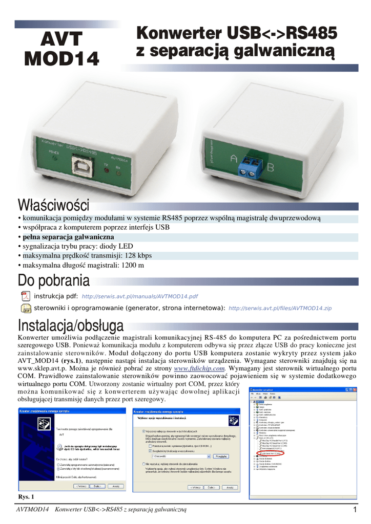 AVT MOD14 Konwerter USB<->RS485 z separacj¹ galwaniczn¹ W³aœciwoœci • komunikacja pomiêdzy modu³ami w systemie RS485 poprzez wspóln¹ magistralê dwuprzewodow¹ • wspó³praca z komputerem poprzez interfejs USB • pe³na separacja galwaniczna • sygnalizacja trybu pracy: diody LED • maksymalna prêdkoœæ transmisji: 128 kbps • maksymalna d³ugoœæ magistrali: 1200 m Do pobrania instrukcja pdf: http://serwis.avt.pl/manuals/AVTMOD14.pdf sterowniki i oprogramowanie (generator, strona internetowa): http://serwis.avt.pl/files/AVTMOD14.zip Instalacja/obs³uga Konwerter umo¿liwia pod³¹czenie magistrali komunikacyjnej RS-485 do komputera PC za poœrednictwem portu szeregowego USB. Poniewa¿ komunikacja modu³u z komputerem odbywa siê przez z³¹cze USB do pracy konieczne jest zainstalowanie sterowników. Modu³ do³¹czony do portu USB komputera zostanie wykryty przez system jako AVT_MOD14 (rys.1), nastêpnie nast¹pi instalacja sterowników urz¹dzenia. Wymagane sterowniki znajduj¹ siê na www.sklep.avt.p. Mo¿na je równie¿ pobraæ ze strony www.ftdichip.com. Wymagany jest sterownik wirtualnego portu COM. Prawid³owe zainstalowanie sterowników powinno zaowocowaæ pojawieniem siê w systemie dodatkowego wirtualnego portu COM. Utworzony zostanie wirtualny port COM, przez który mo¿na komunikowaæ siê z konwerterem u¿ywaj¹c dowolnej aplikacji obs³uguj¹cej transmisjê danych przez port szeregowy. Rys. 1 AVTMOD14 Konwerter USB<->RS485 z separacj¹ galwaniczn¹ 1 KLOCKI RS485 USB USB AVT MOD14 AVT 531 AVT 533 AVT 538 AVT 537 AVT 535 AVT 536 AVT 534 AVT 532 Schemat blokowy systemu zdalnego sterowania zbudowanego z wykorzystaniem “klocków” RS485 „Klocki” RS485 to: AVTMOD03 - konwerter USB<->RS485 AVT531 - karta przekaŸników AVT532 - karta triaków AVT533 - karta wyjœæ cyfrowych- (aktywne GND) AVT534 - karta wyjœæ cyfrowych-(aktywne VCC) AVT535 - karta wejœæ cyfrowych AVT536 - 8-wejœciowa karta wejœæ analogowych AVT537 - 4 cyfrowy wyœwietlacz LED AVT538 -32 znakowy wyœwietlacz LCD Wiêcej na: www.sklep.avt.pl Producent: AVT-Korporacja sp. z o.o. tel.: (22) 257-84-50 ul. Leszczynowa 11 fax: (22) 257-84-55 03-197 Warszawa 2 Dzia³ pomocy technicznej: tel.:(22) 257-84-58 [email protected] AVTMOD14 Konwerter USB<->RS485 z separacj¹ galwaniczn¹
