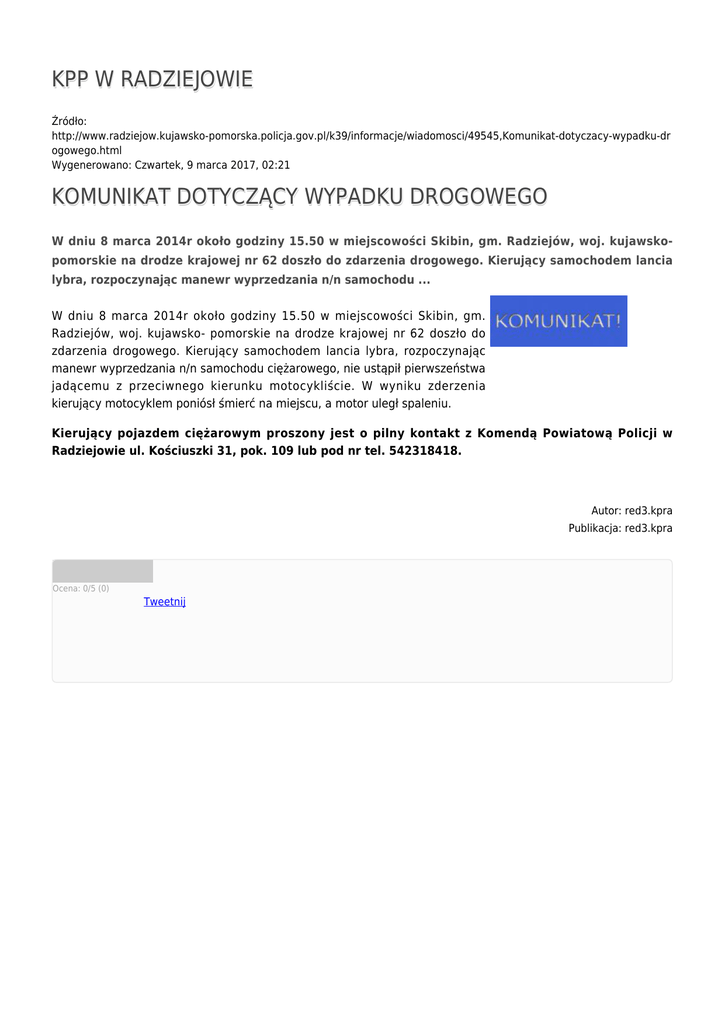 KPP W RADZIEJOWIE Źródło: http://www.radziejow.kujawsko-pomorska.policja.gov.pl/k39/informacje/wiadomosci/49545,Komunikat-dotyczacy-wypadku-dr ogowego.html Wygenerowano: Czwartek, 9 marca 2017, 02:21 KOMUNIKAT DOTYCZĄCY WYPADKU DROGOWEGO W dniu 8 marca 2014r około godziny 15.50 w miejscowości Skibin, gm. Radziejów, woj. kujawskopomorskie na drodze krajowej nr 62 doszło do zdarzenia drogowego. Kierujący samochodem lancia lybra, rozpoczynając manewr wyprzedzania n/n samochodu ... W dniu 8 marca 2014r około godziny 15.50 w miejscowości Skibin, gm. Radziejów, woj. kujawsko- pomorskie na drodze krajowej nr 62 doszło do zdarzenia drogowego. Kierujący samochodem lancia lybra, rozpoczynając manewr wyprzedzania n/n samochodu ciężarowego, nie ustąpił pierwszeństwa jadącemu z przeciwnego kierunku motocykliście. W wyniku zderzenia kierujący motocyklem poniósł śmierć na miejscu, a motor uległ spaleniu. Kierujący pojazdem ciężarowym proszony jest o pilny kontakt z Komendą Powiatową Policji w Radziejowie ul. Kościuszki 31, pok. 109 lub pod nr tel. 542318418. Autor: red3.kpra Publikacja: red3.kpra Ocena: 0/5 (0) Tweetnij